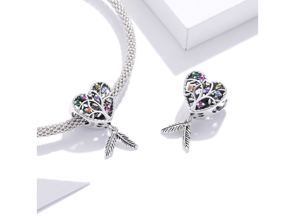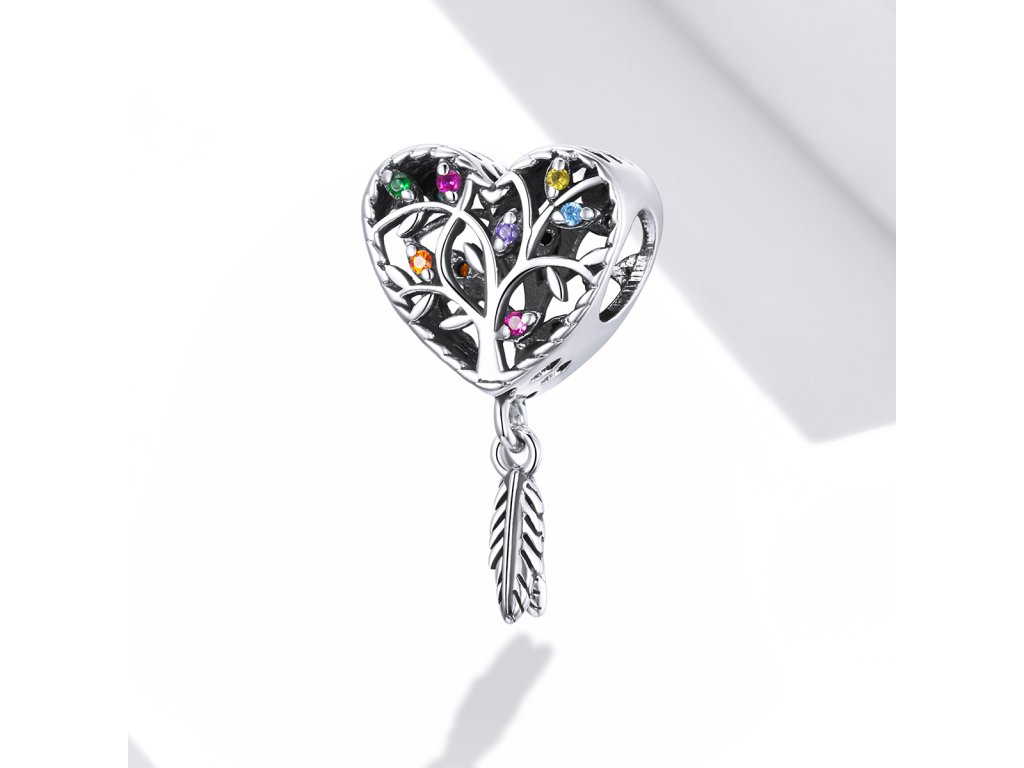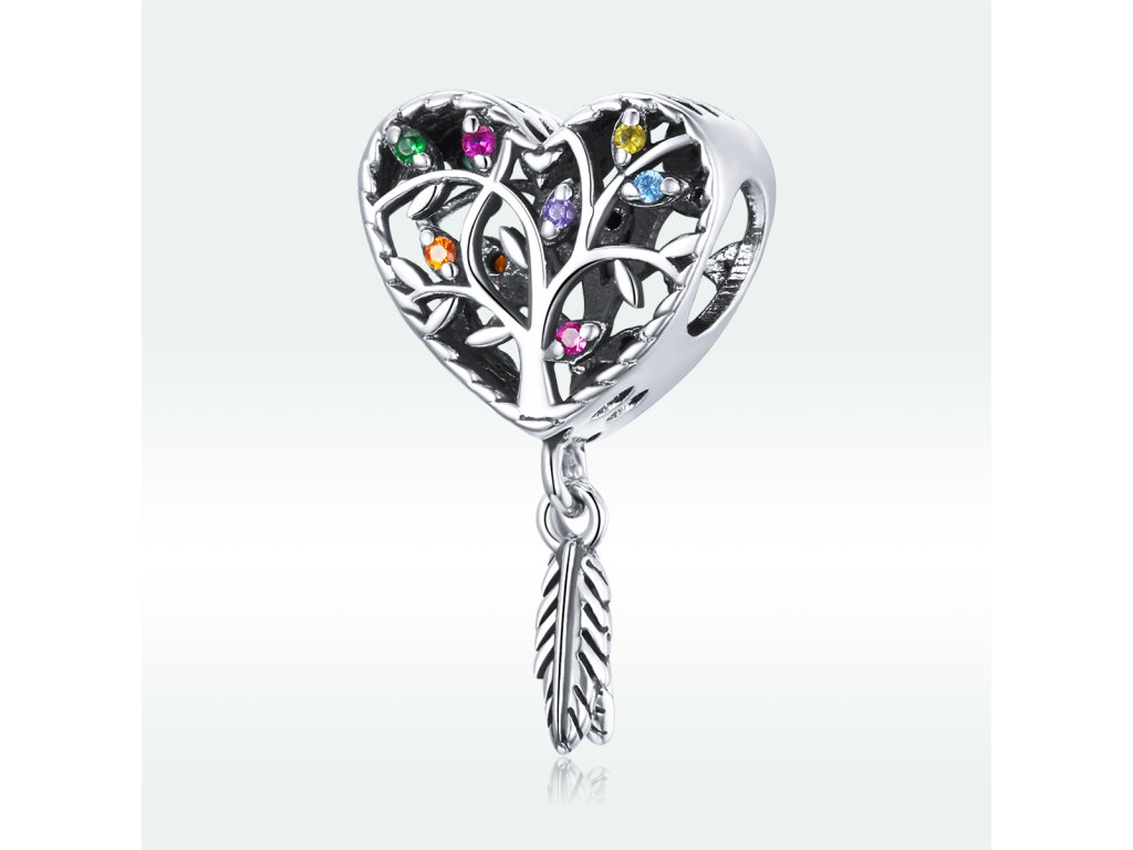 - Strieborný prepracovaný prívesok v tvare rozkvitnutého srdca so spirituálnymi pierkami. Prívesok je zdobený trblietavými kameňmi v podobe farebných zirkónov a ručne vyrezávanými milovanými srdiečkami po stranách. Originálny design prívesku, kvalitné spracovanie a materiál, ručne dohotovené.