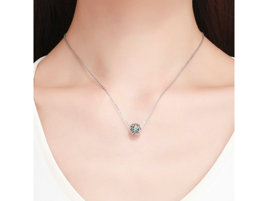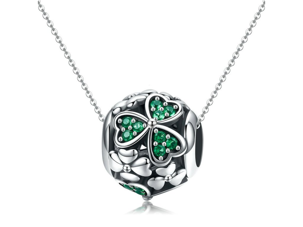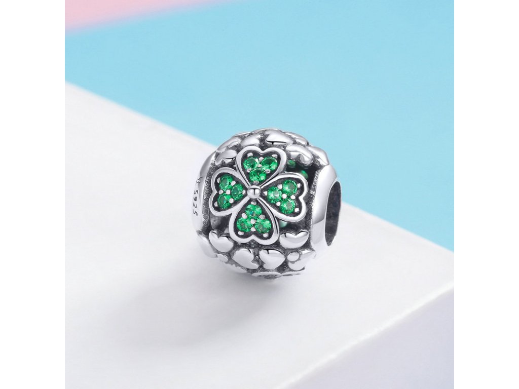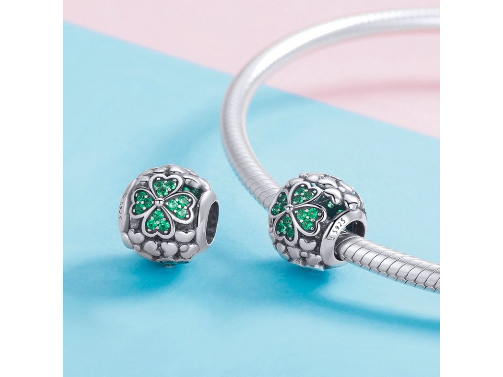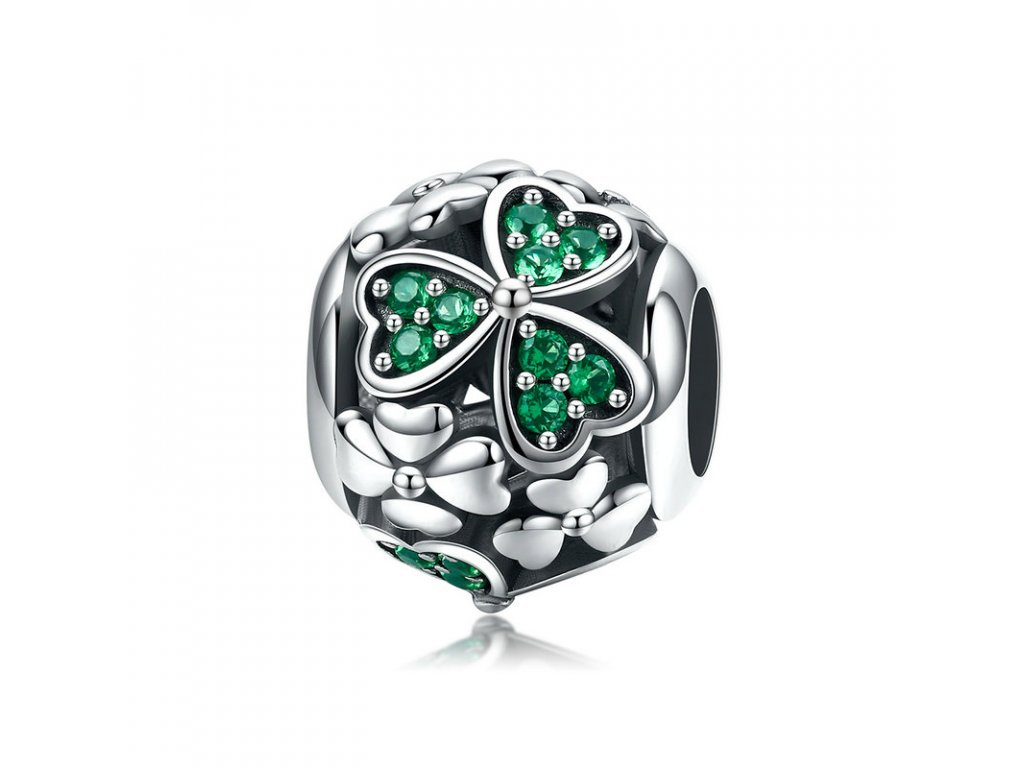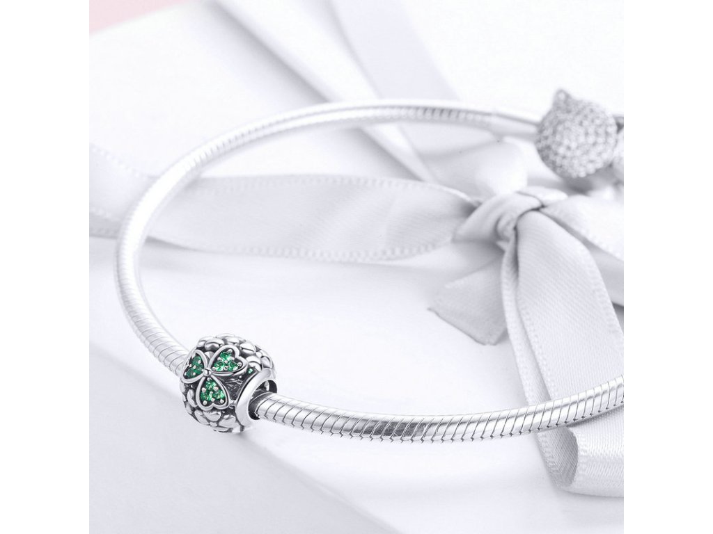 - Krásny a prepracovaný strieborný korálek v dizajne štvorlístok lásky dekorovaný zelenými zirkónmi.