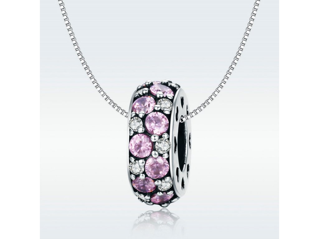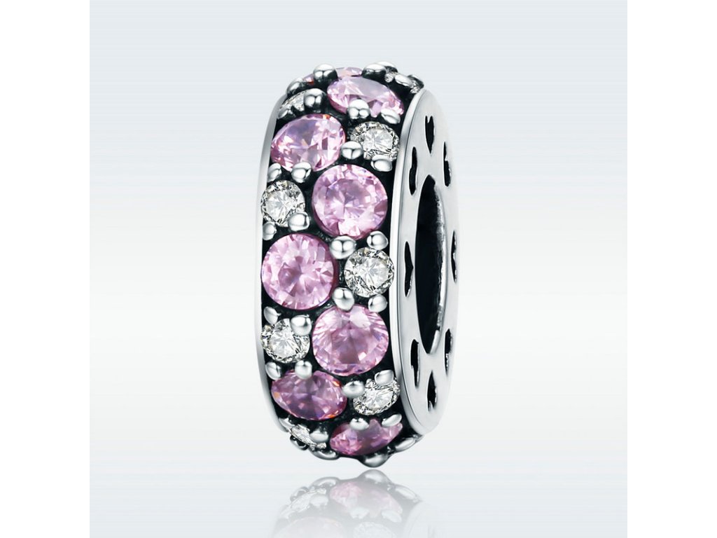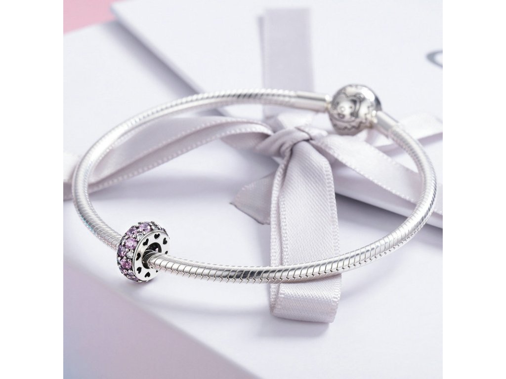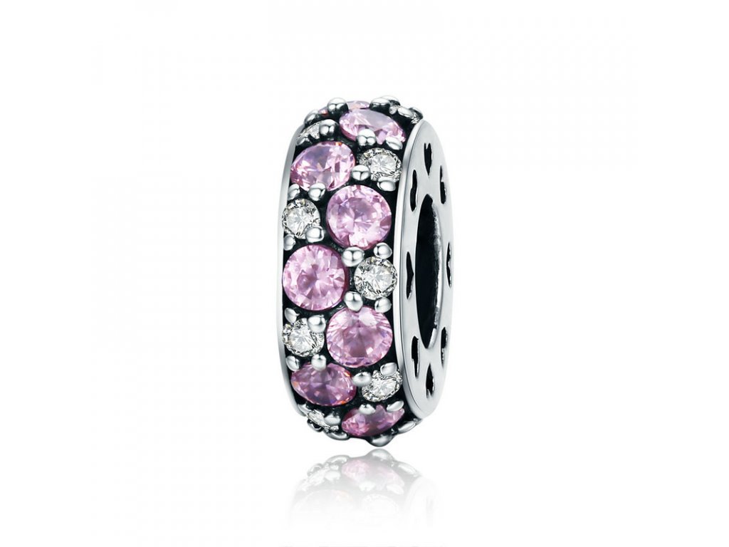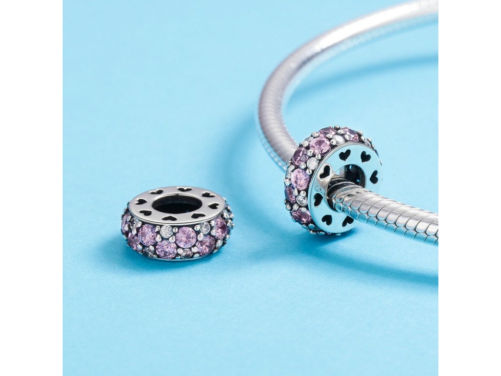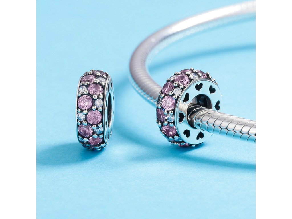 - Krásny úzky korálik / oddeľovač je po svojom obvode zdobený ružovými a čírymi zirkónmi doplnený vyrezávanými srdiečkami.