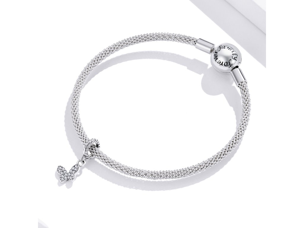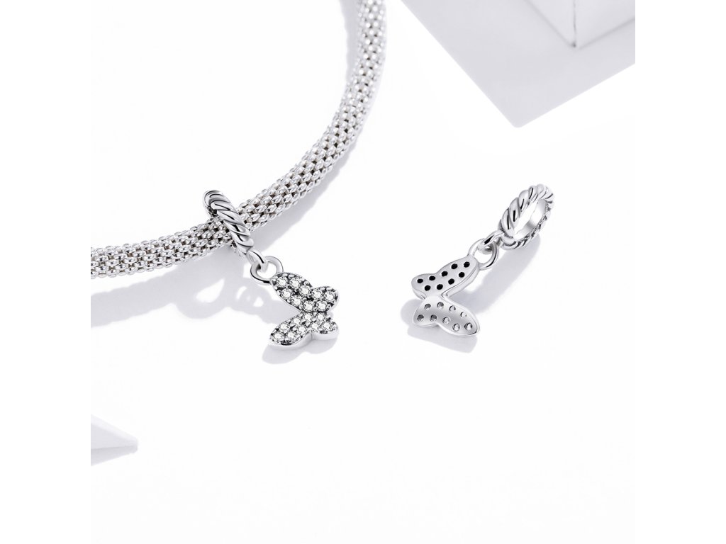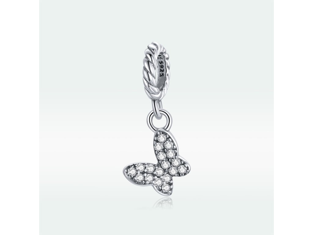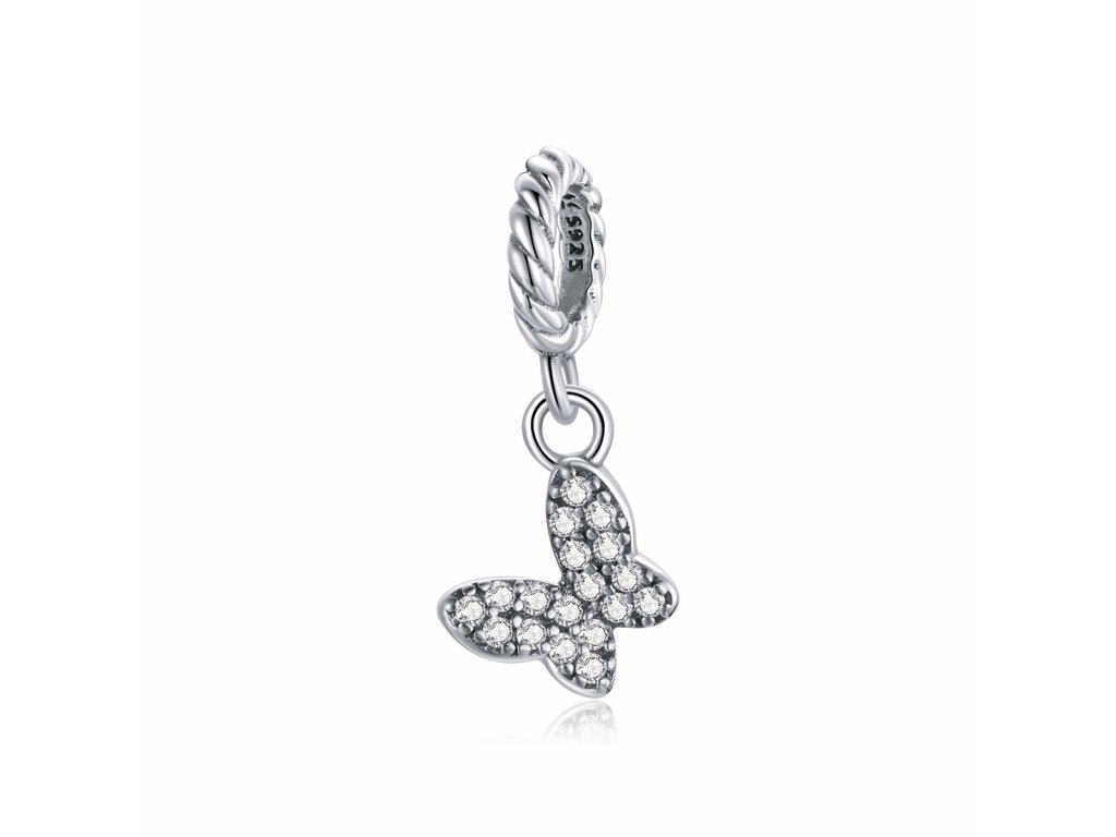- Strieborný visiaci prívesok v dizajne krásneho motýlika zdobeného trblietavými kameňmi v podobe čírych zirkónov. Originálny design prívesku, kvalitné spracovanie a materiál, ručne dohotovené.