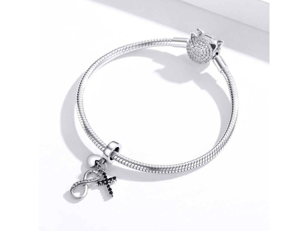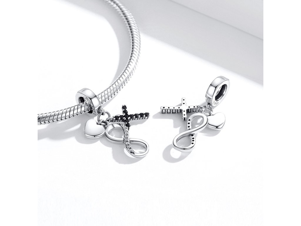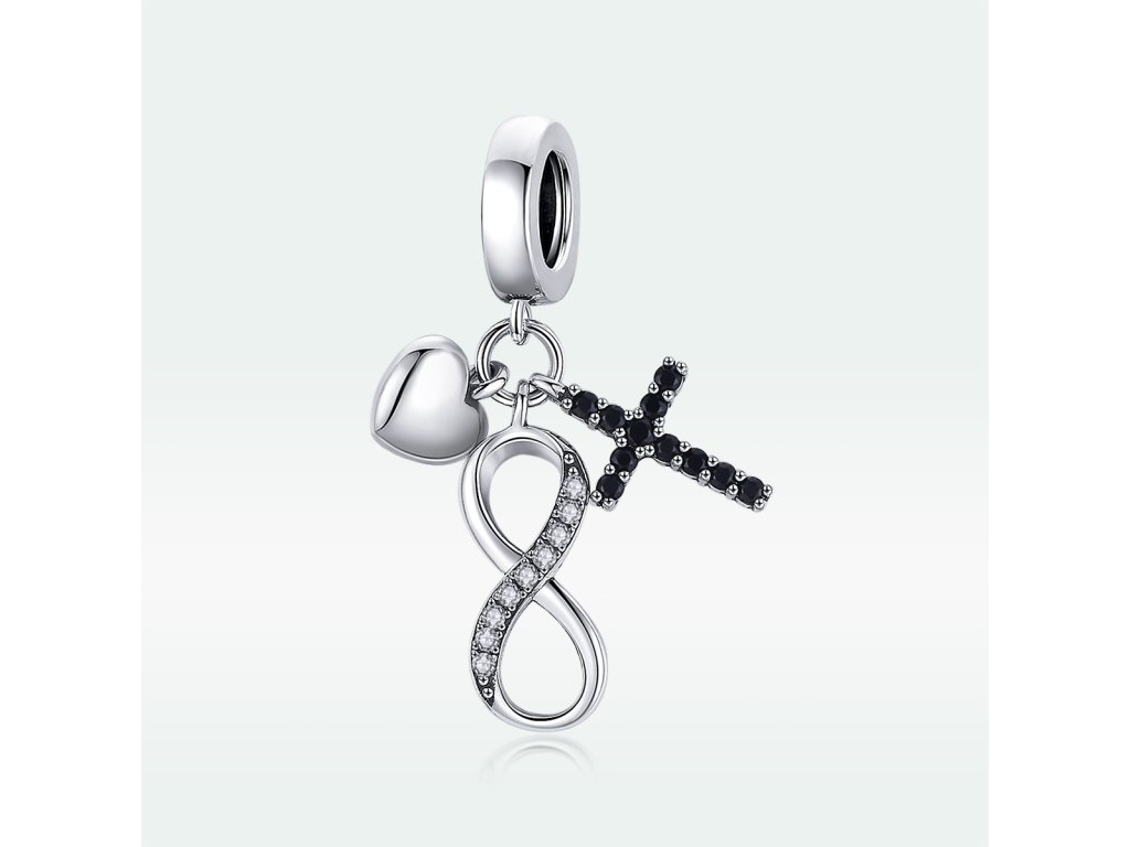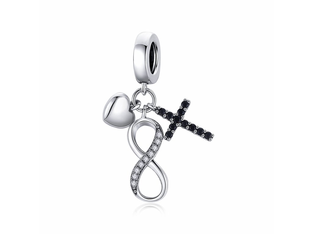 - Strieborný visiaci prívesok v dizajne milovaných symbolov. Nájdete tu hneď tri prívesky. Symbol nekonečna zdobený čírymi kameňmi, čierny krížik zdobený čiernymi zirkónmi a tretie miniatúrne lesklé milované srdiečko. Originálny design prívesku, kvalitné spracovanie a materiál, ručne dohotovené.