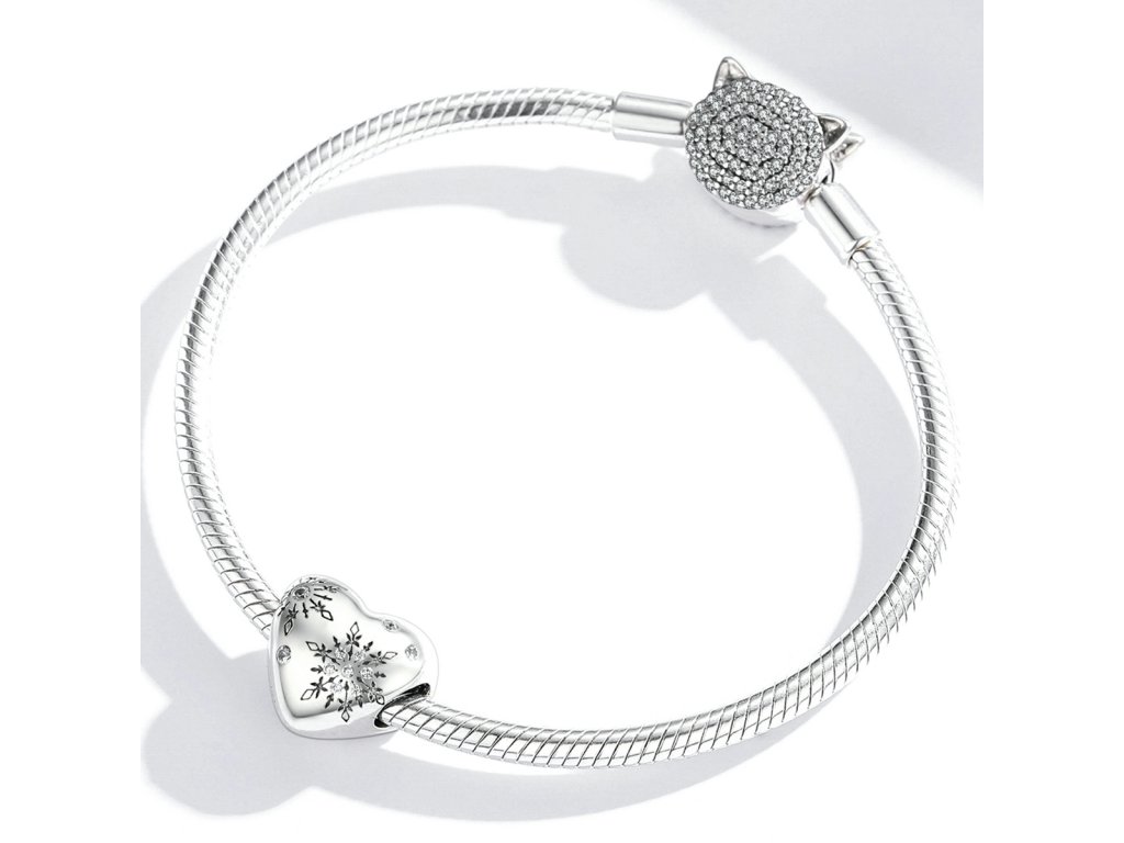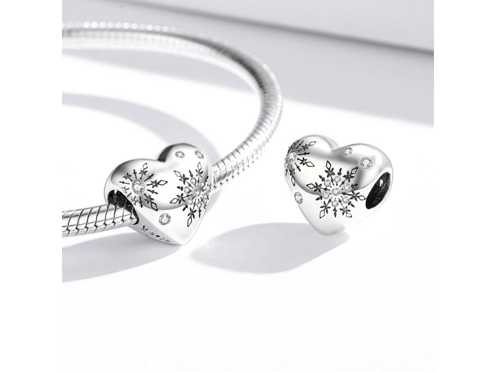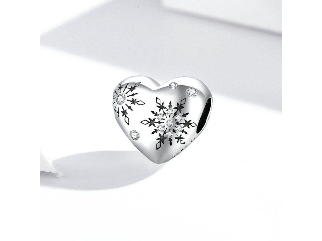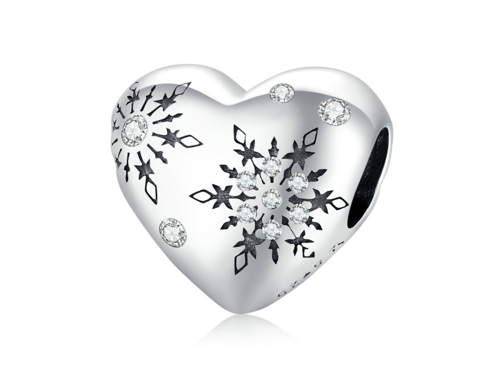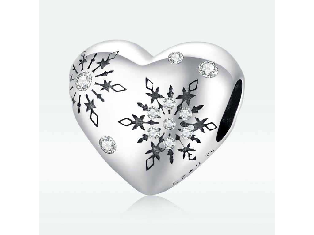 - Strieborný prívesok v dizajne Zimnej lásky v tvare srdca zdobený vločkami s ručne nanášanými čírymi trblietavými zirkónmi. Originálny design prívesku, kvalitné spracovanie a materiál, ručne dohotovené.