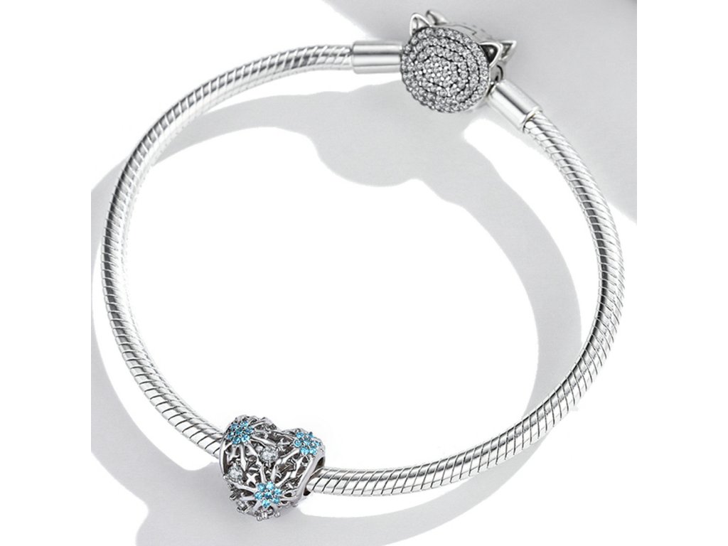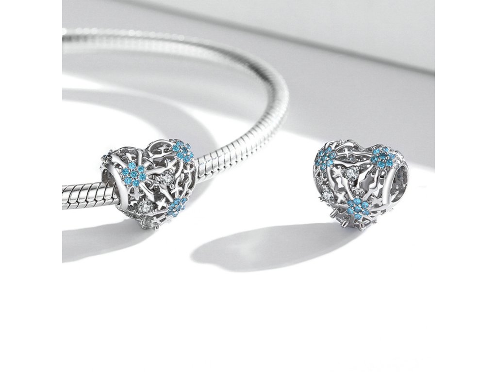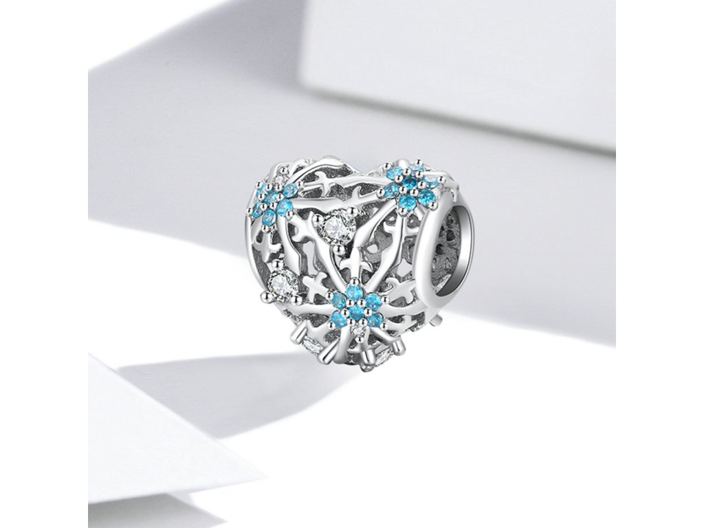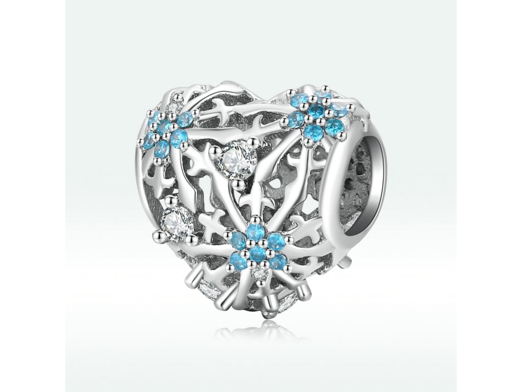 - Strieborný prívesok v tvare srdca zdobeného snehovými vločkami s ručne posádzanými svetlo modrými a čírymi trblietavými zirkónmi. Originálny design prívesku, kvalitné spracovanie a materiál, ručne dohotovené.