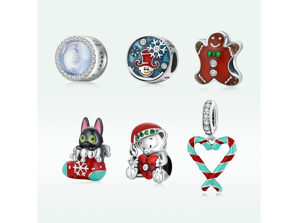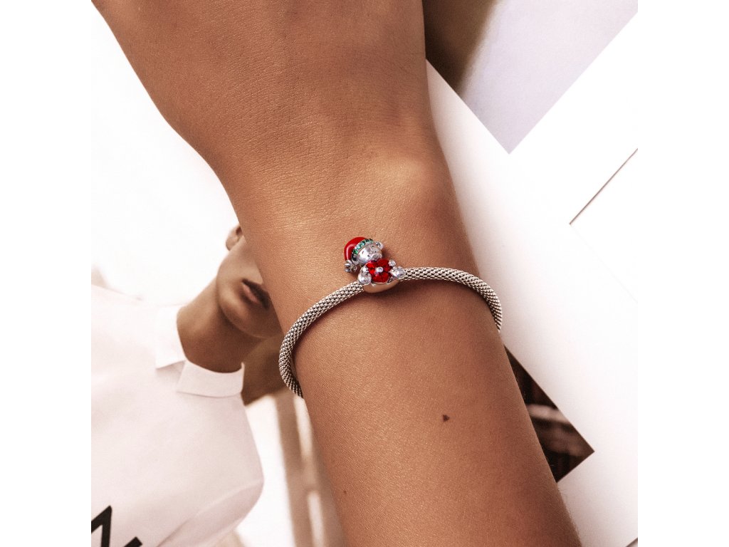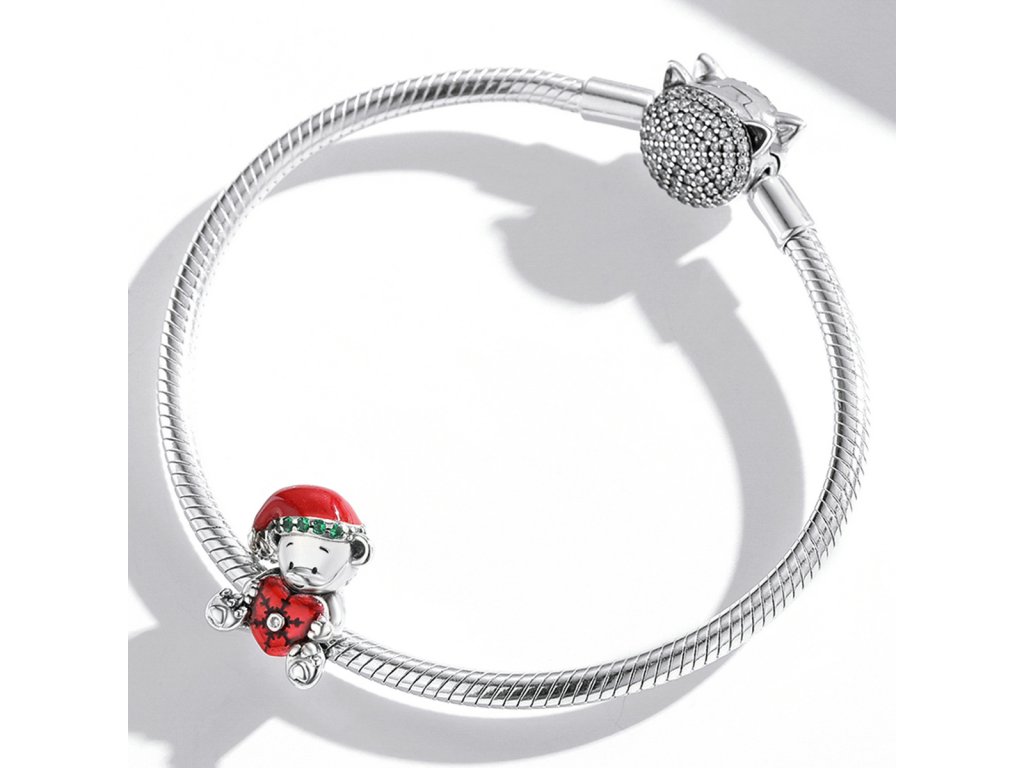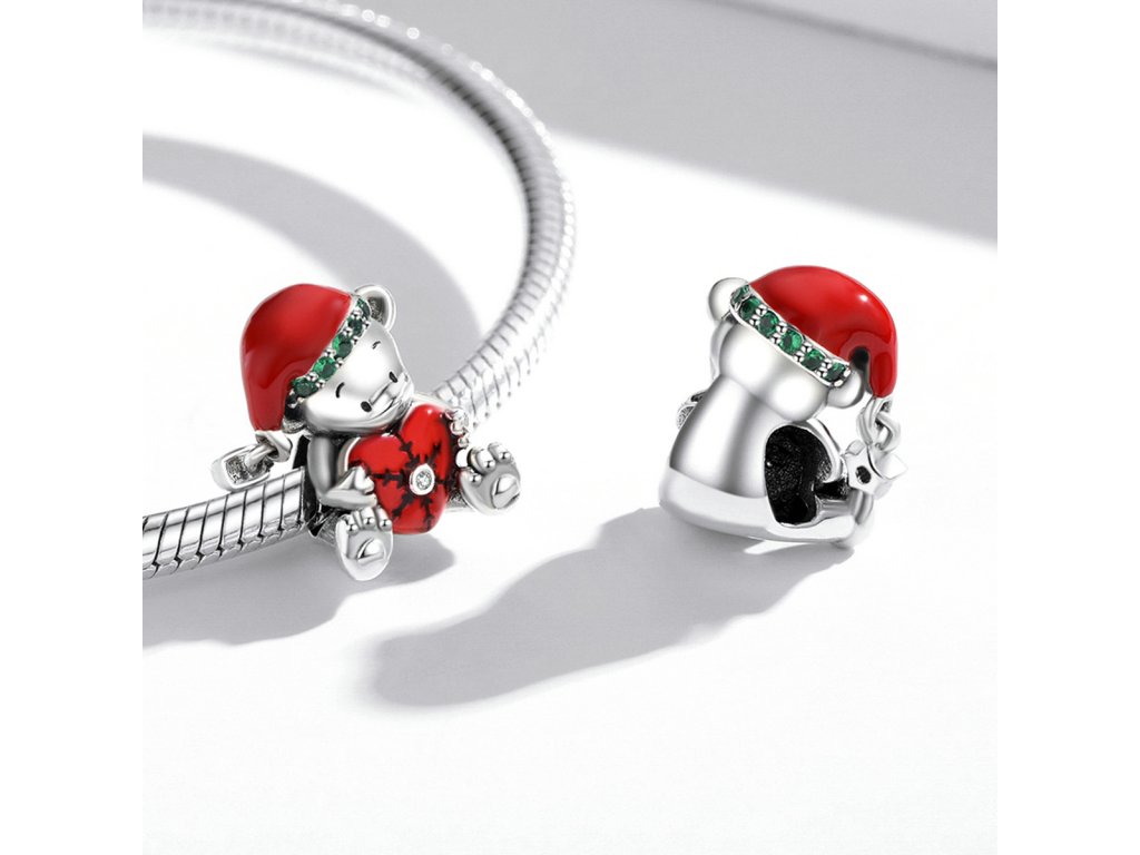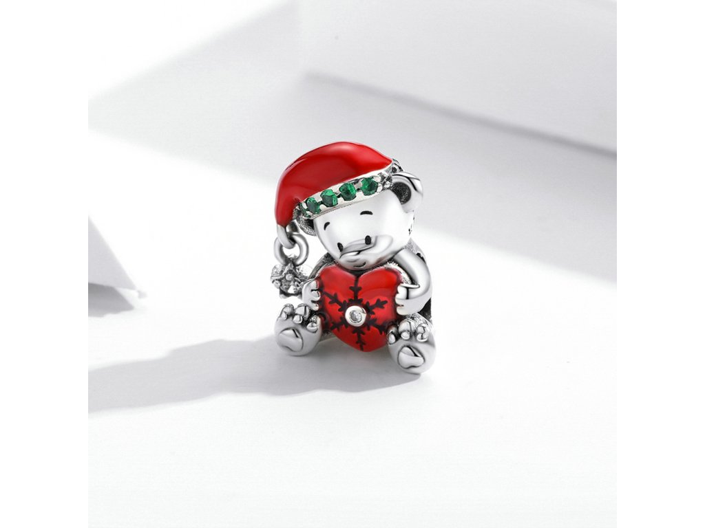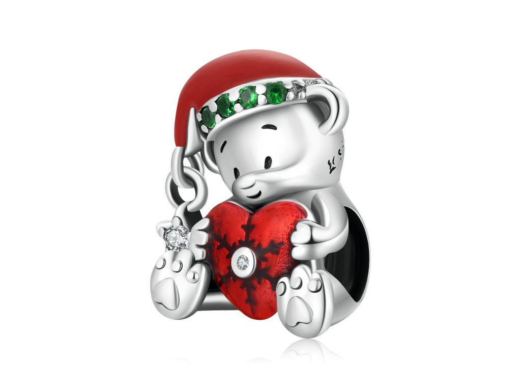 - Strieborný prívesok v dizajne roztomilého medvedíka zdobeného červeným srdcom a vianočnou čiapkou obohatenou zelenými zirkónmi a mini príveskom s čírym trblietavým zirkónom. Originálny design prívesku, kvalitné spracovanie a materiál, ručne dohotovené.