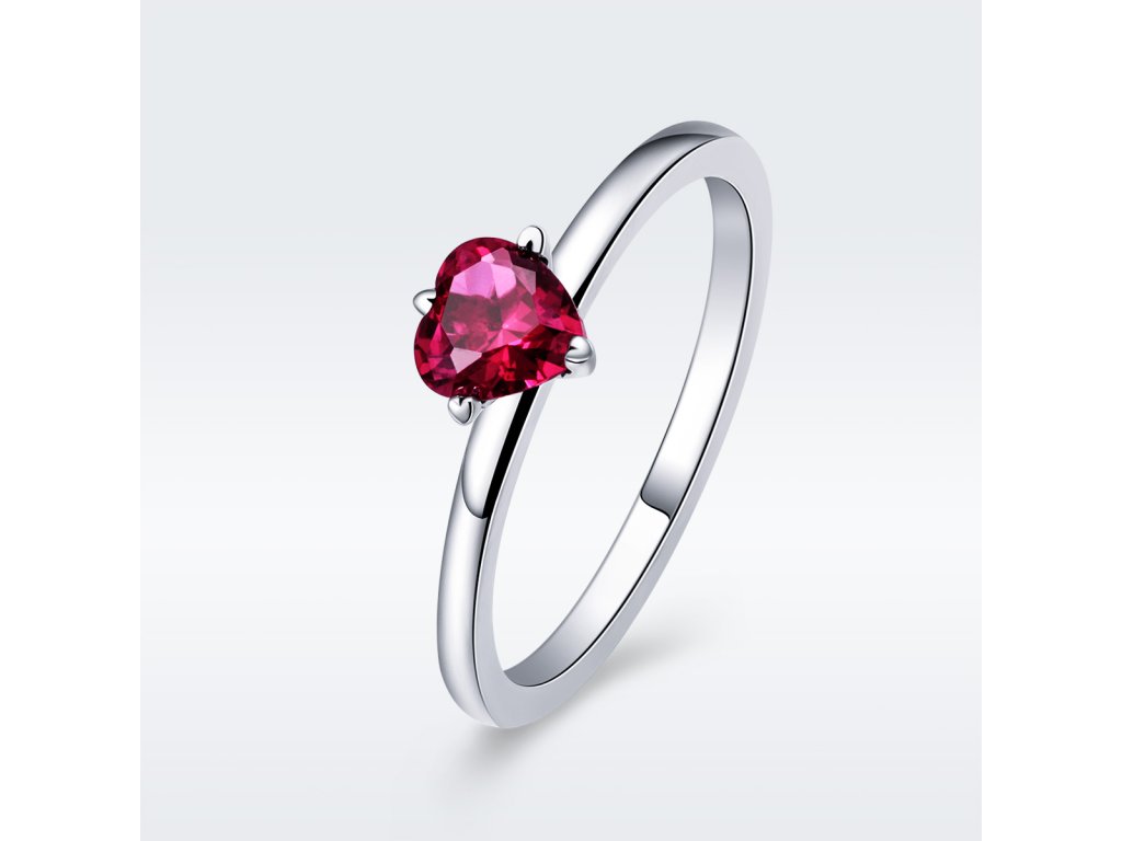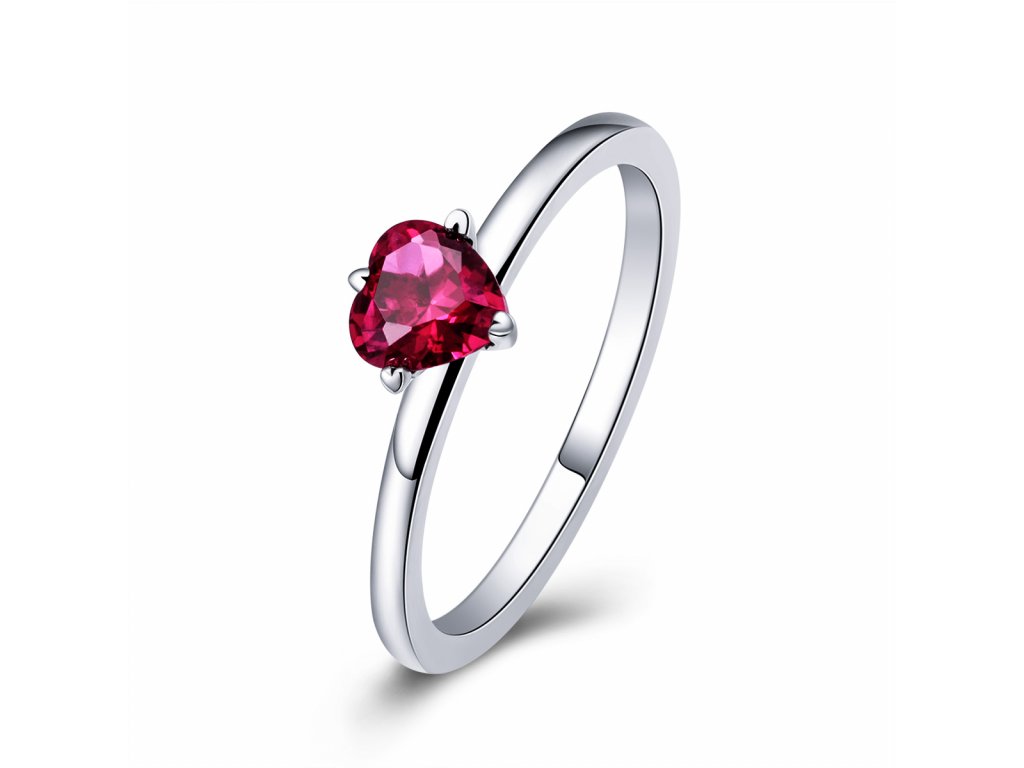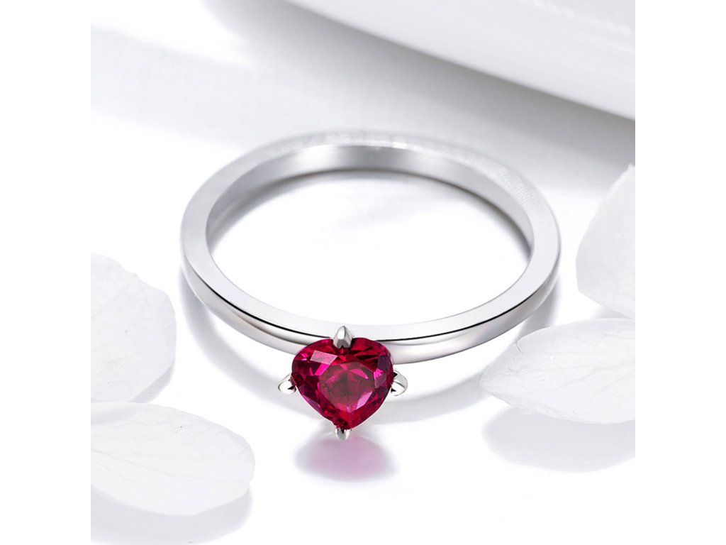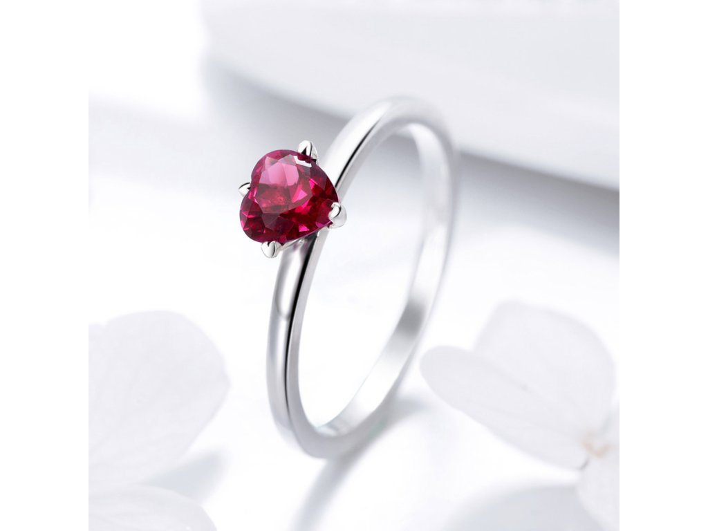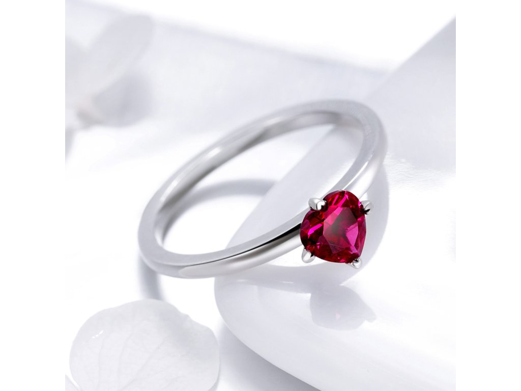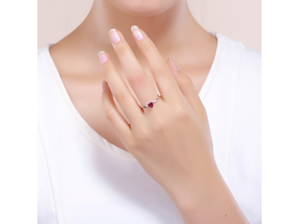 - Luxusný a prepracovaný strieborný prsteň v dizajne čerešňovo červeného pokladu ozdobený trblietavými zirkónmi.