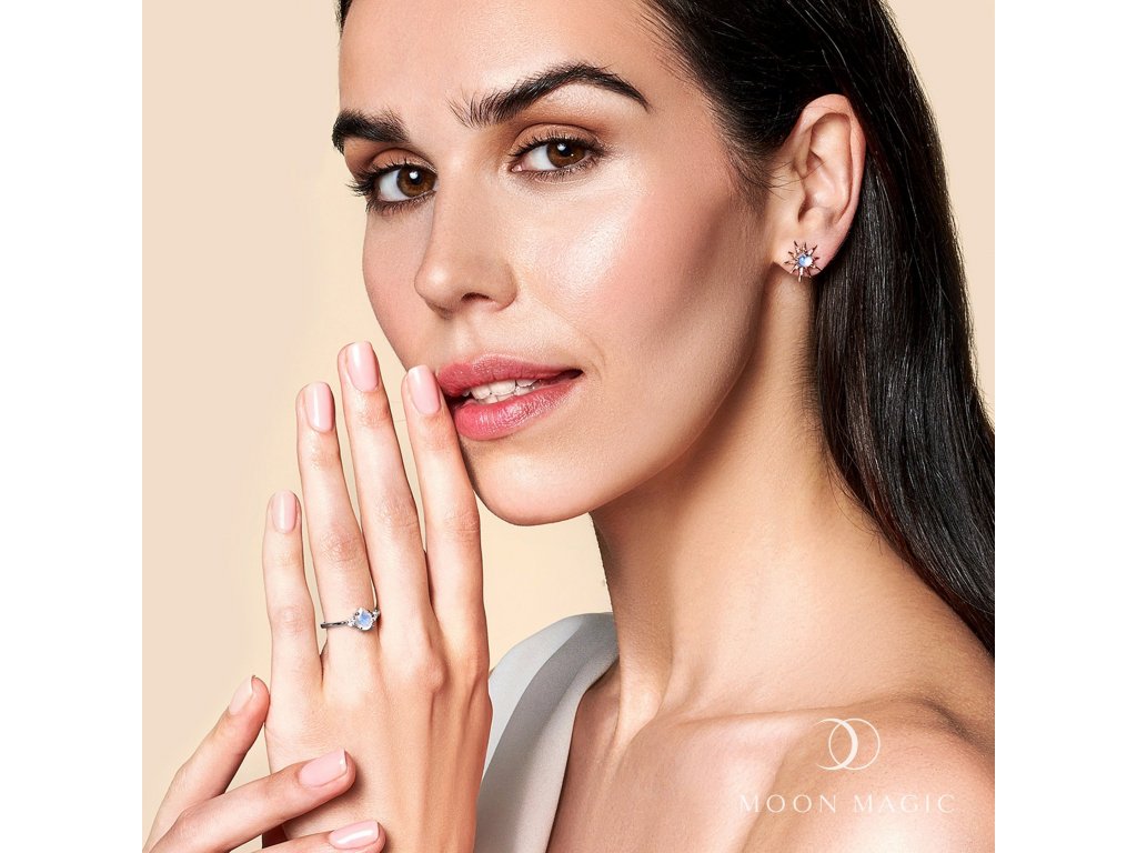 Luxusný romantický strieborný prsteň zdobený decentným mesačným kameňom v tvare kvapky a trblietavými drahokamami v podobe modrých topazov.