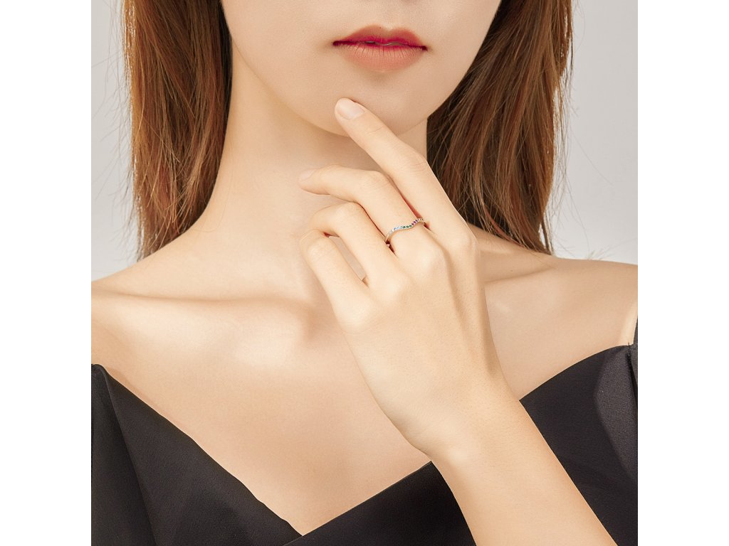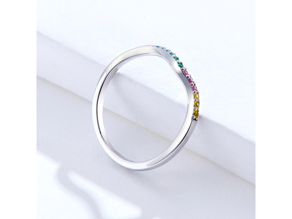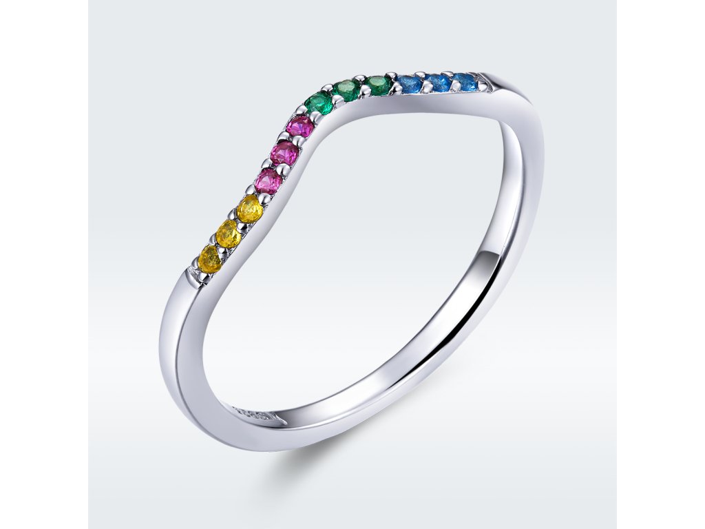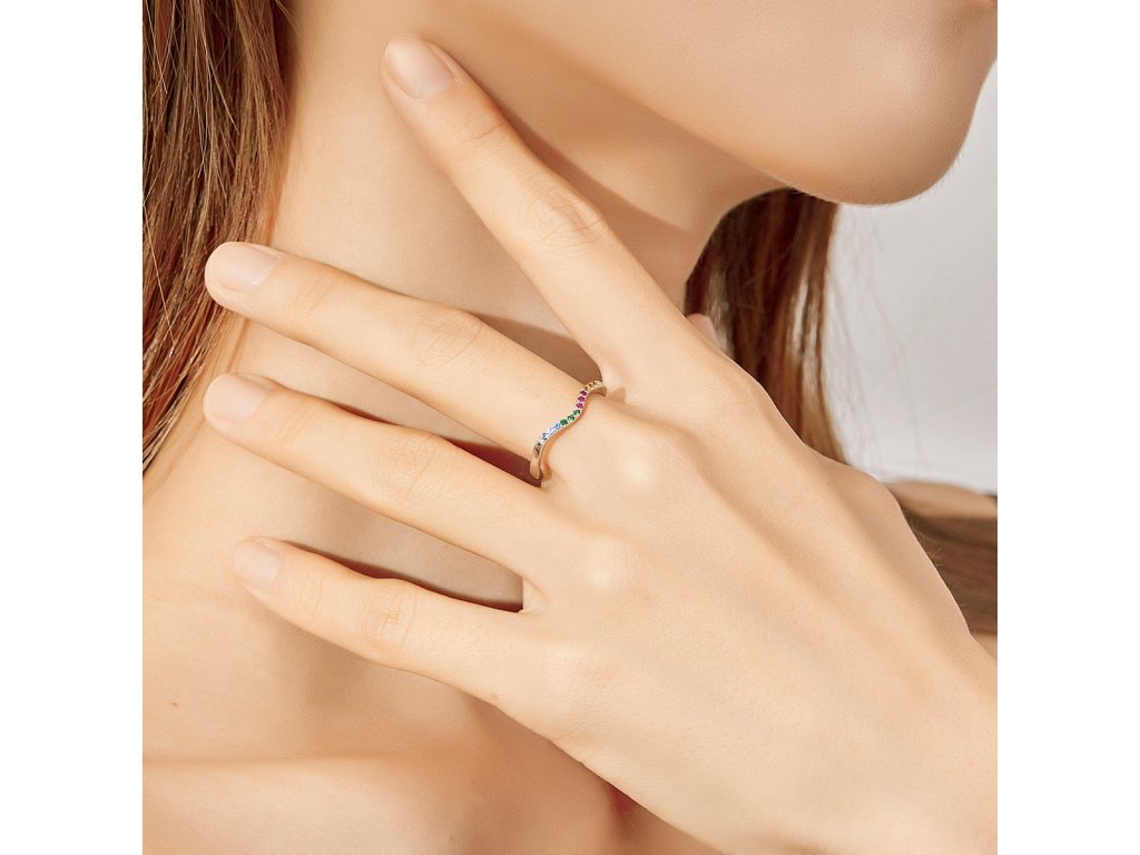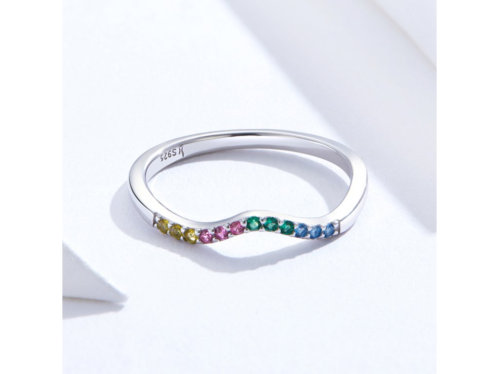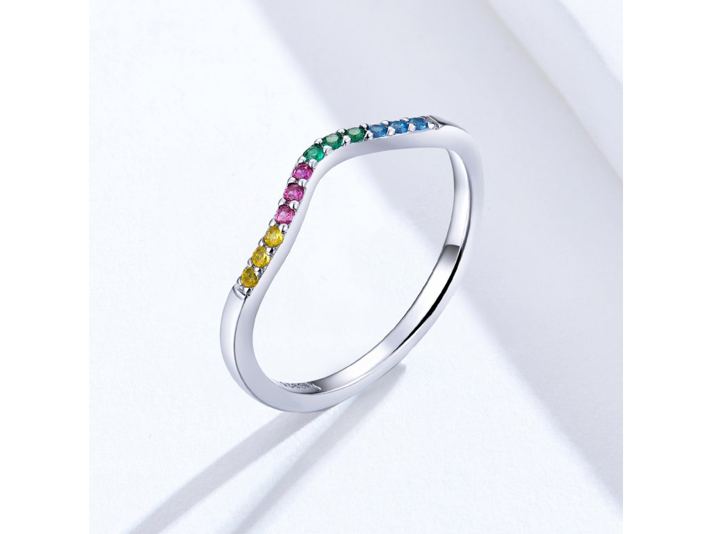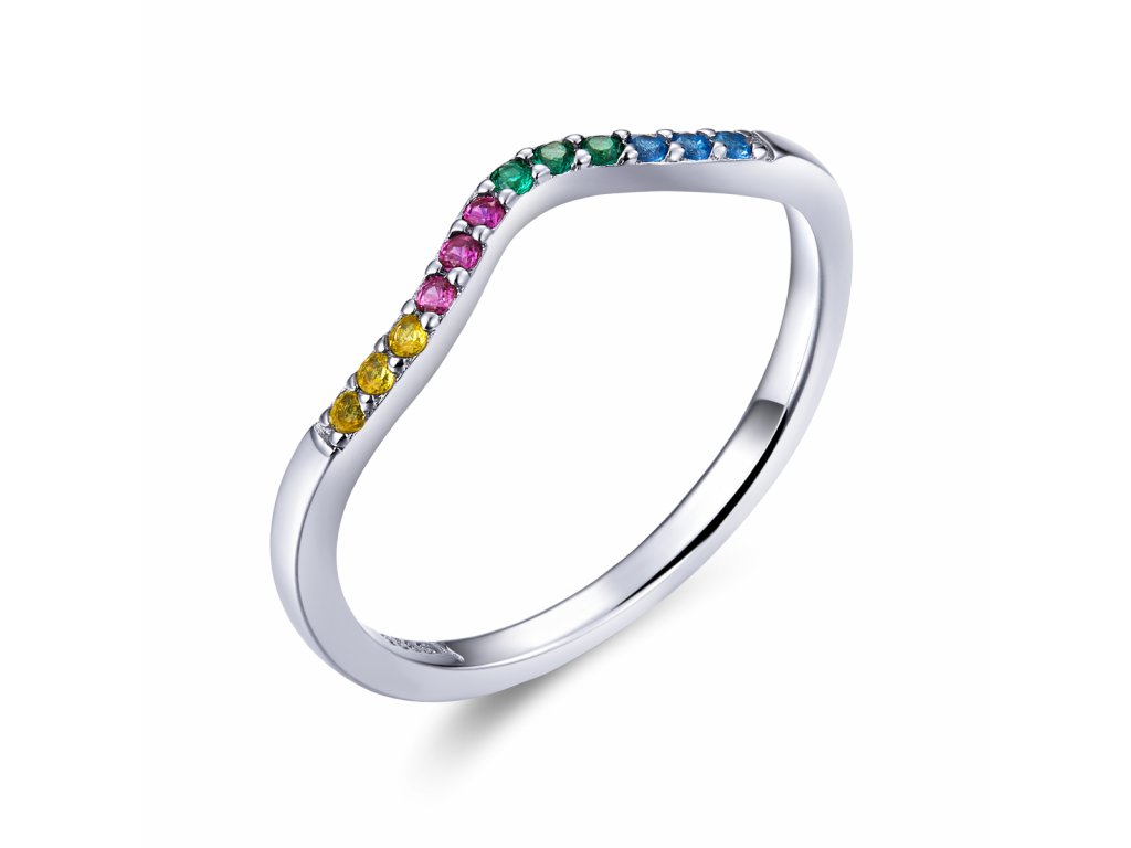 - Strieborný prsteň v dizajne Dúhové vlnky zdobené farebnými kameňmi v podobe trblietavých zirkónov.