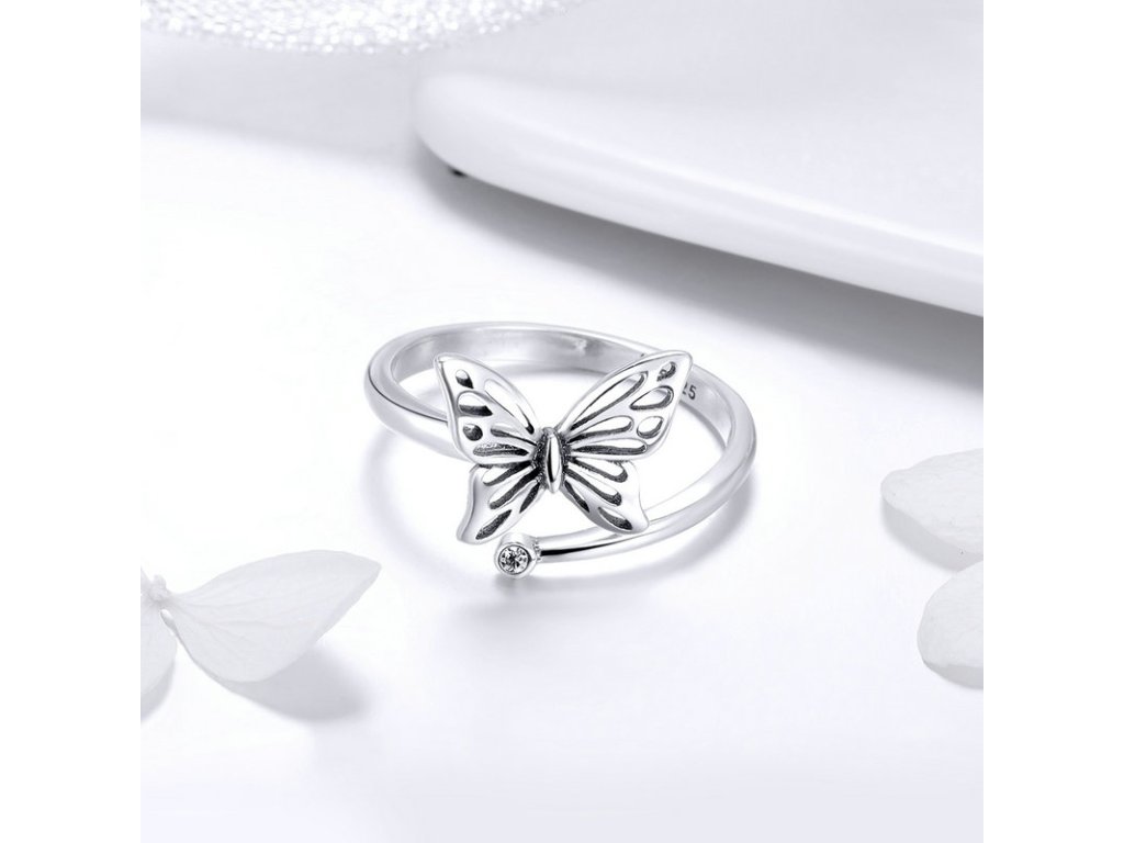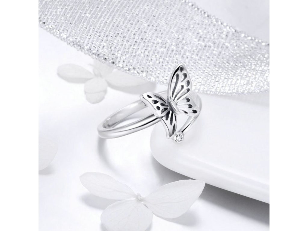 - Luxusný a prepracovaný strieborný prsteň v dizajne filigranového motýlika zdobený zirkónom.