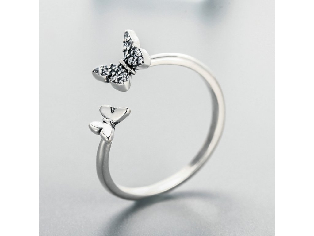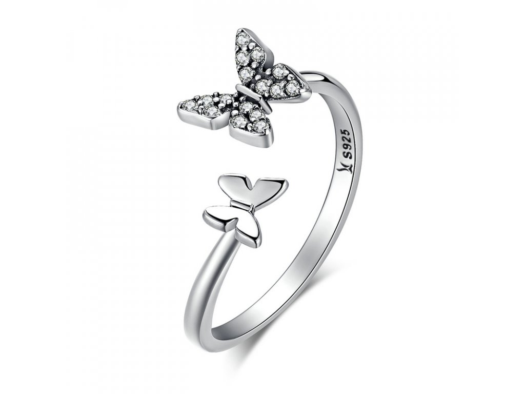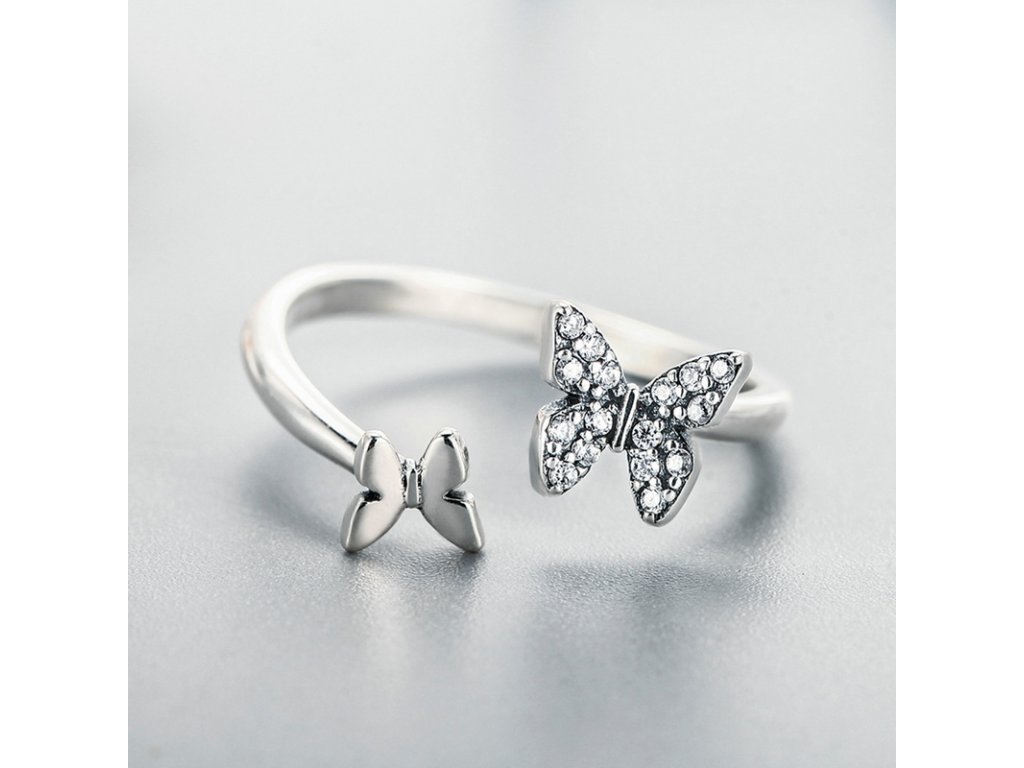 - Luxusný a prepracovaný strieborný prsteň v dizajne kúzelného motýľa ozdobený trblietavými zirkónmi.