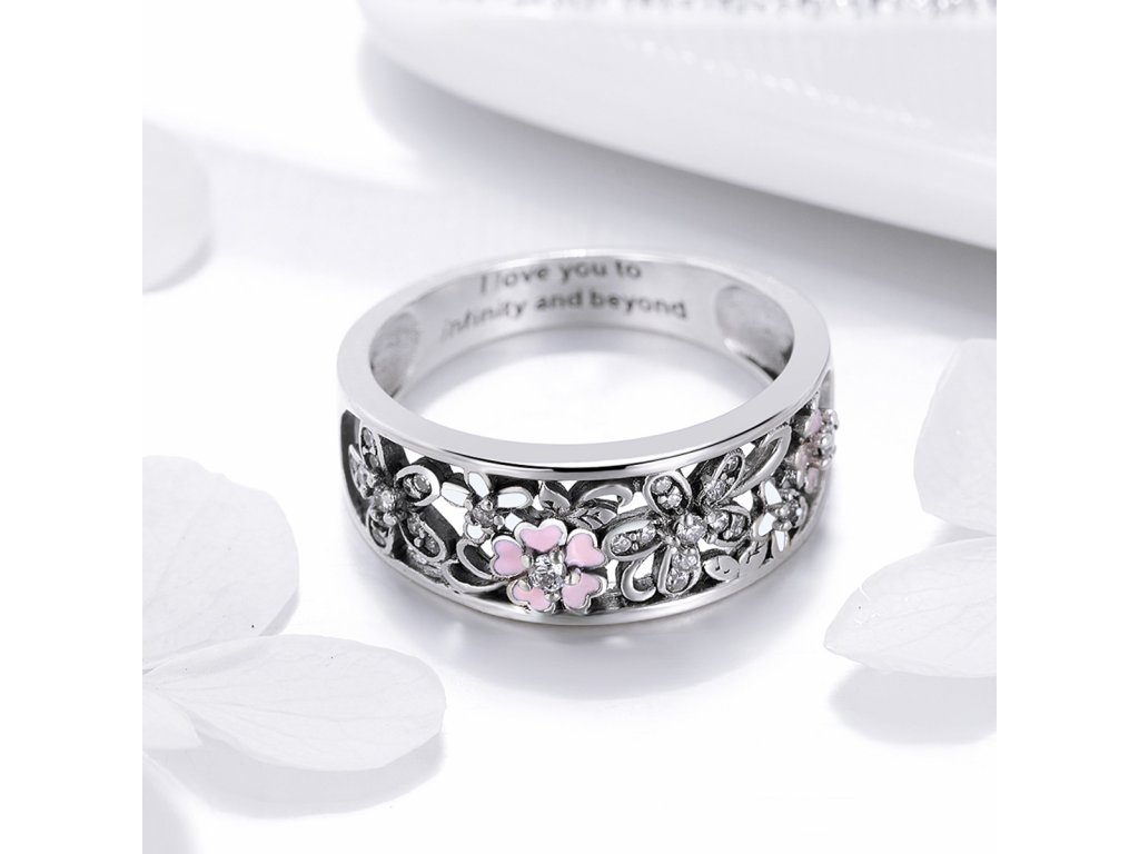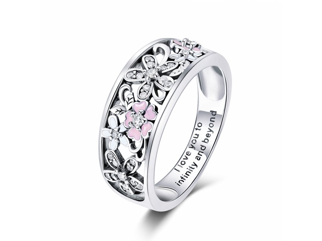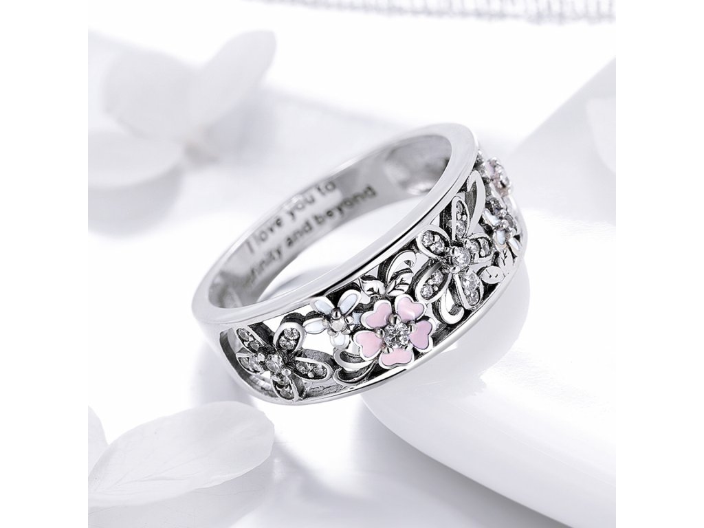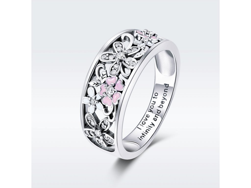 - Strieborný prsteň v dizajne Poetických kvetov zdobených trblietavými zirkónmi, anglickým nápisom "I love you to infinity and beyond" v preklade "Milujem ťa do nekonečna a ešte ďalej". Prsteň je tiež zdobený ručne nanášanou bielou a ružovou glazúrou. Originálny dizajn prsteňa, kvalitné spracovanie a materiál, ručne dohotovené.