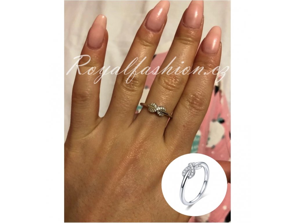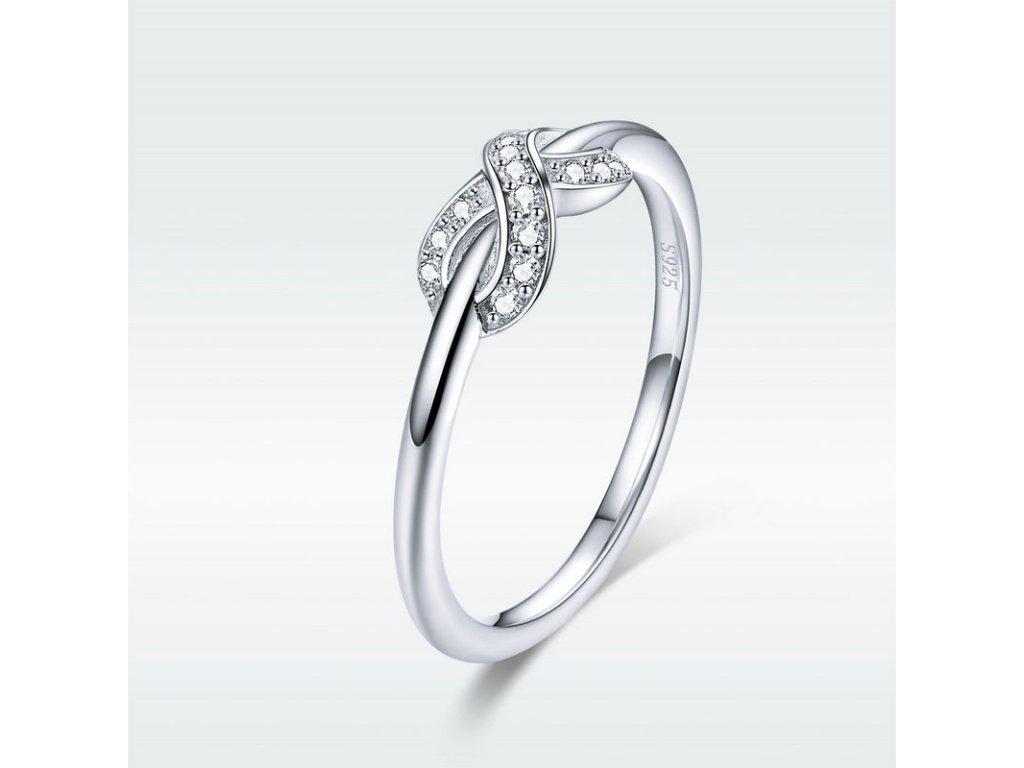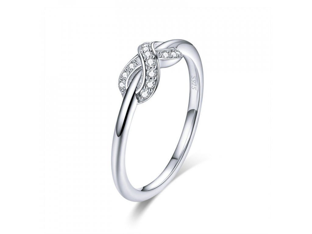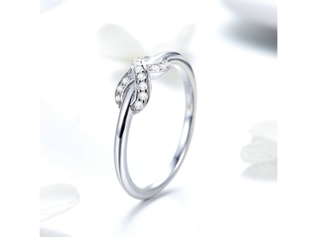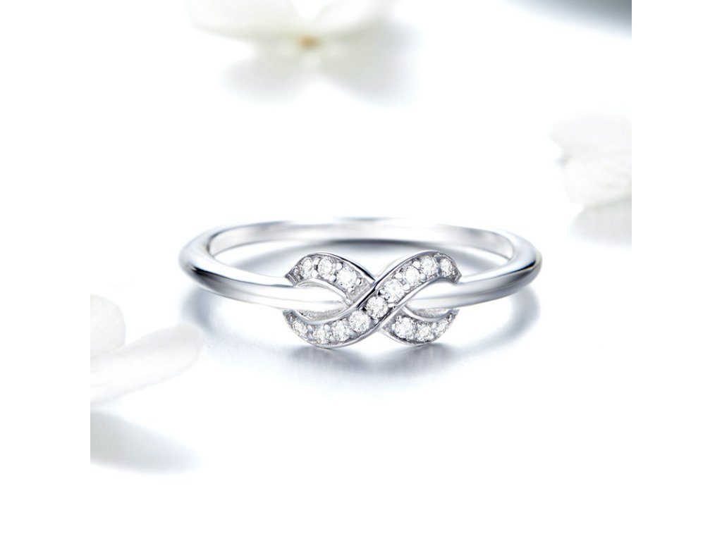 - Strieborný prsteň v dizajne Nekonečnej lásky zdobený čírymi trblietavými zirkónmi.