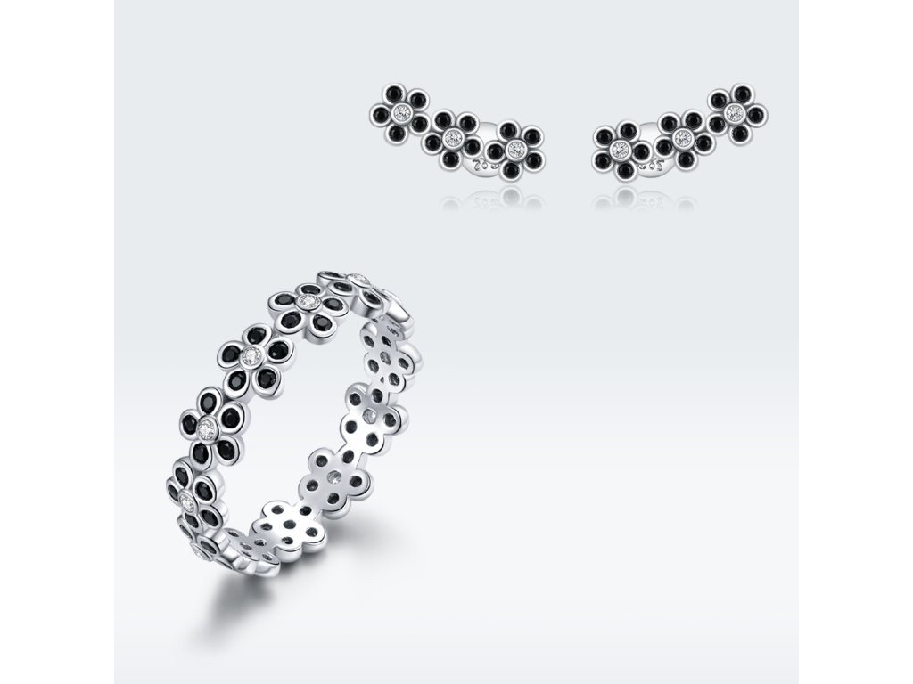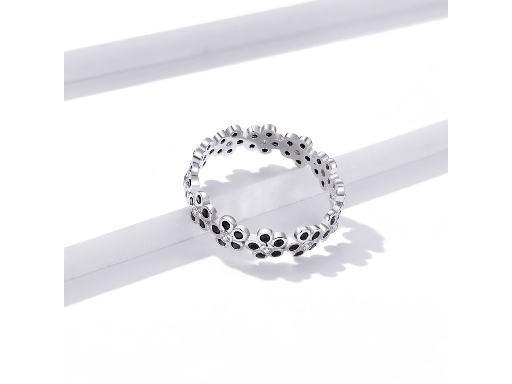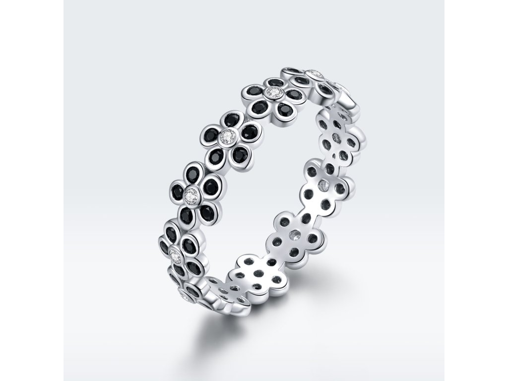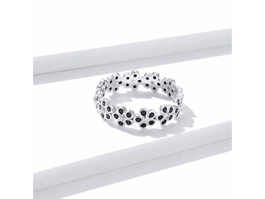 - Strieborný prsteň v dizajne Pole mystických kvetín zdobený čiernymi a čírymi trblietavými kameňmi v podobe trblietavých zirkónov.