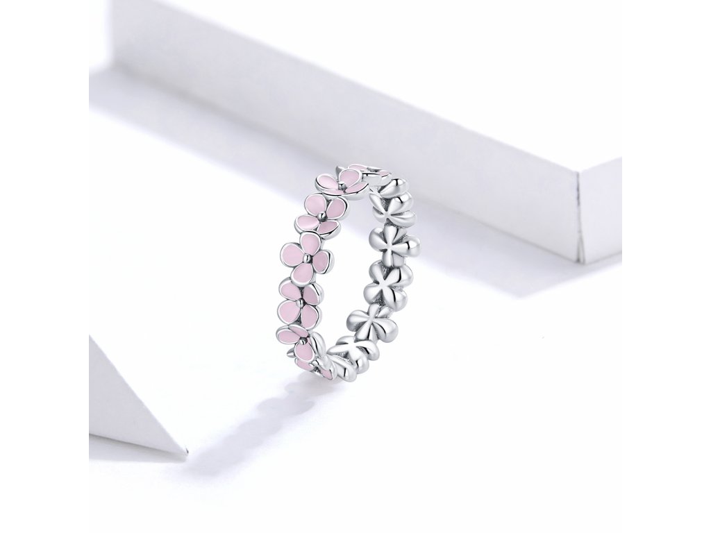 - Strieborný prsteň v dizajne krásnych kvetov zdobených ručne nanášanou svetlo ružovou glazúrou. Originálny dizajn prsteňa, kvalitné spracovanie a materiál, ručne dohotovené.