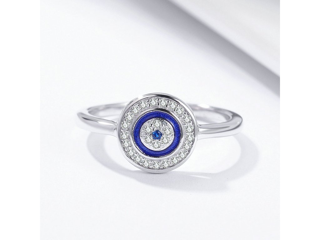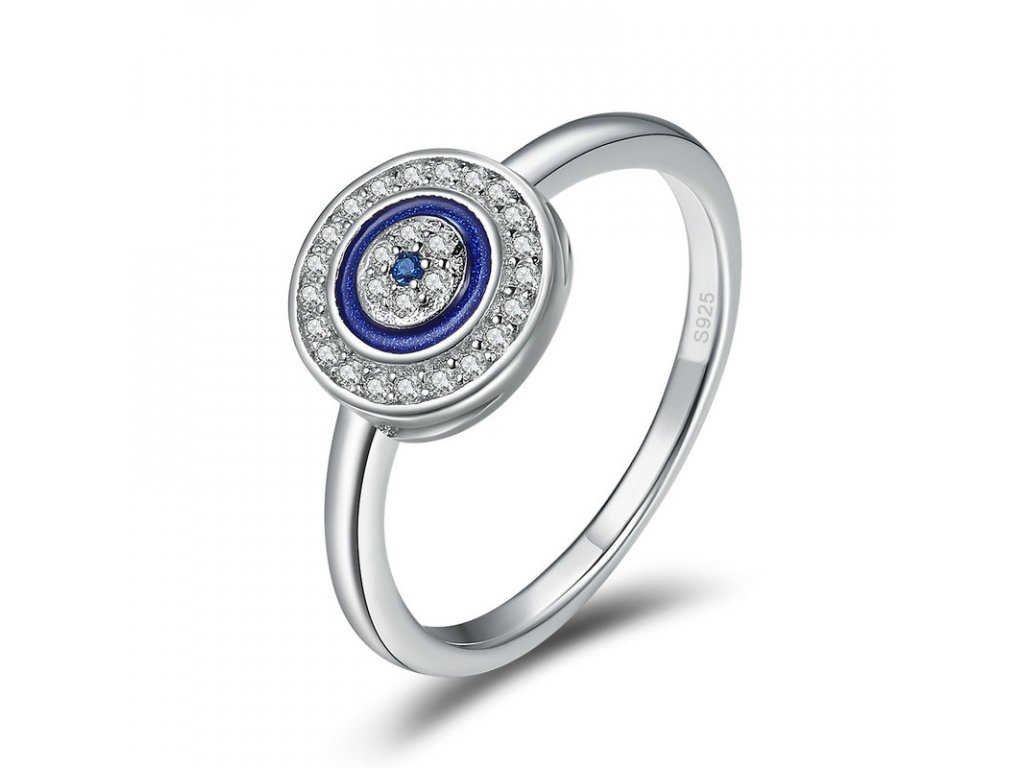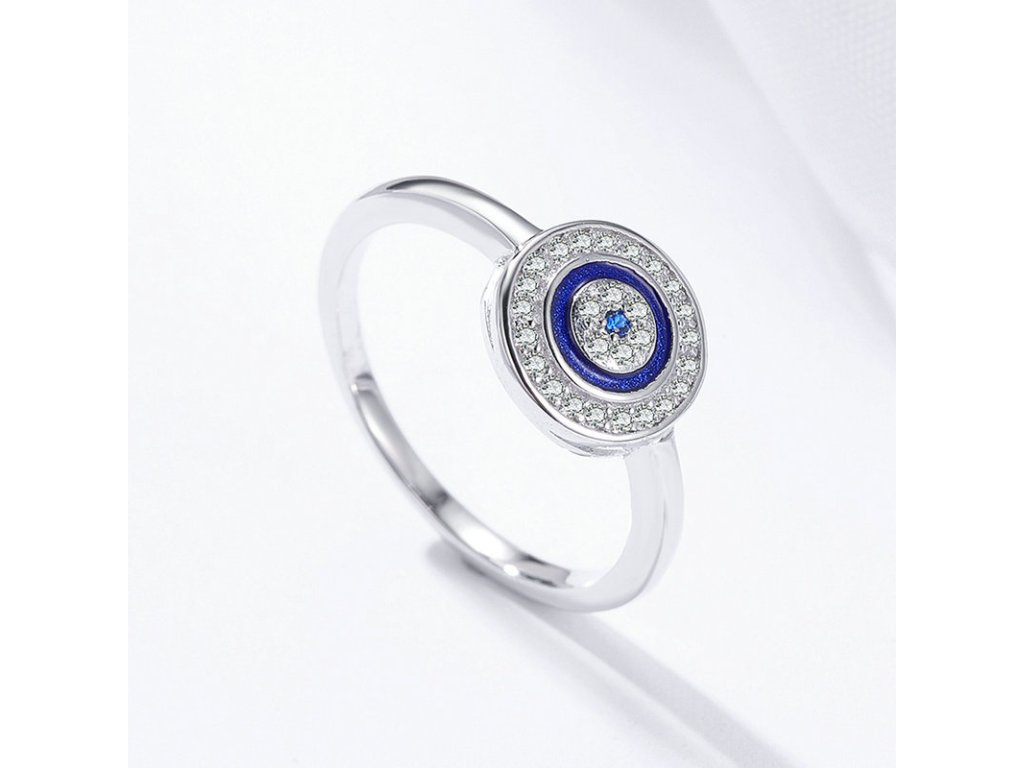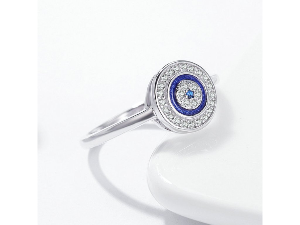 - Luxusný a prepracovaný strieborný prsteň zdobený zirkónmi a modrou glazúrou so symbolom ochrany. Originálny dizajn prsteňa, kvalitné spracovanie a materiál, ručne dohotovené.