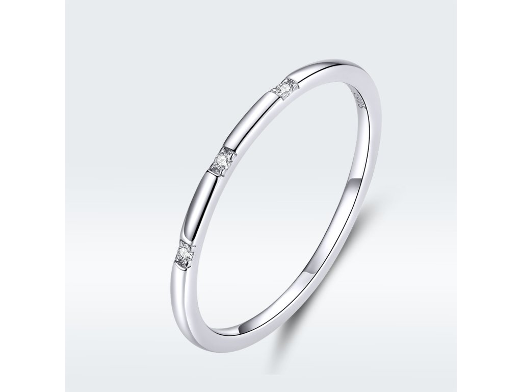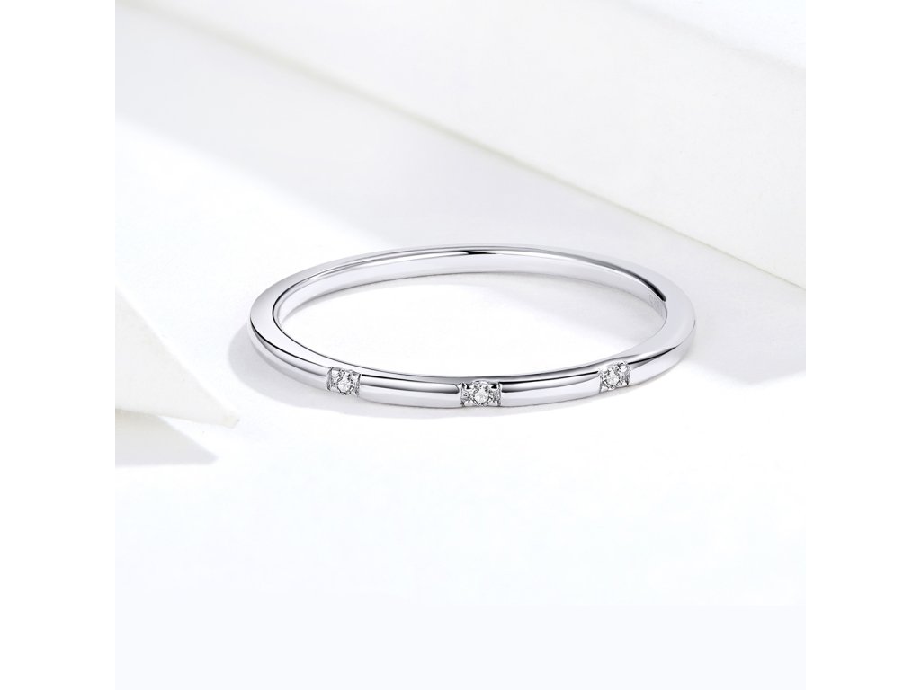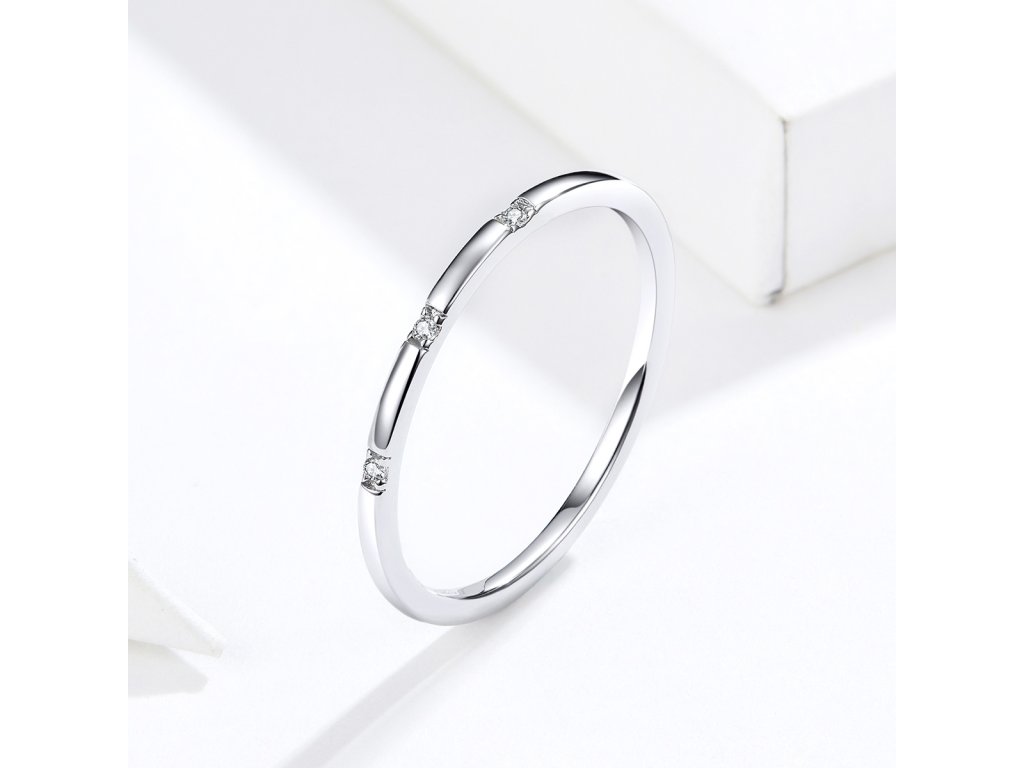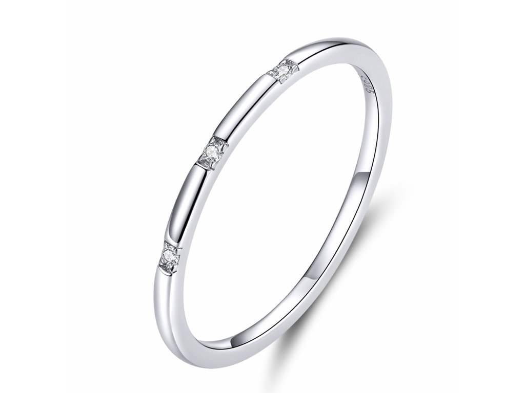 - Strieborný prsteň v dizajne Tri trblietavých kameňov v podobe čírych zirkónov.