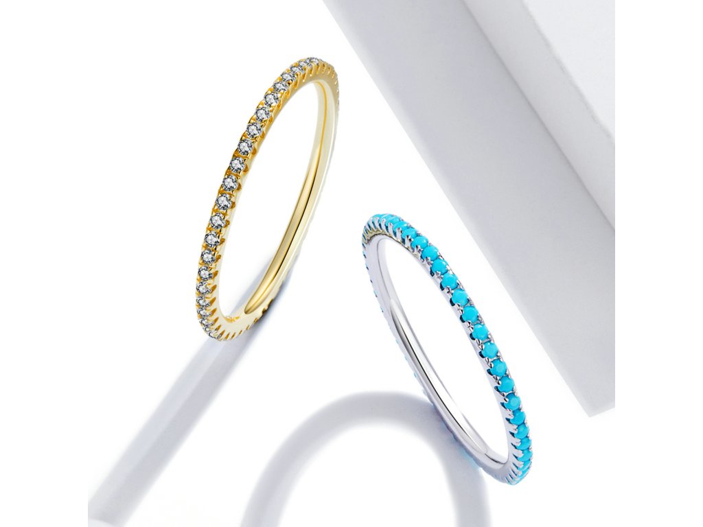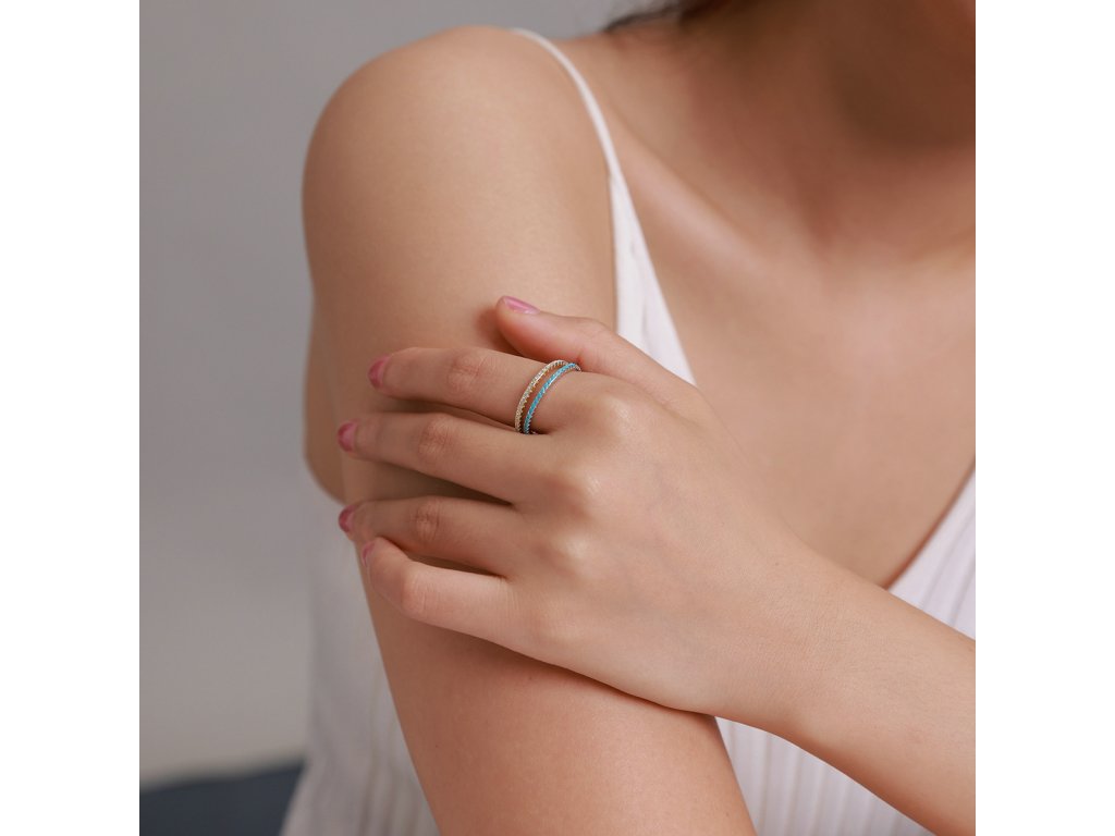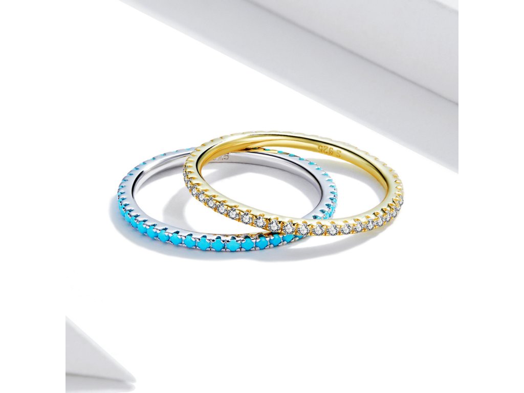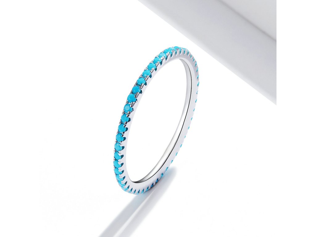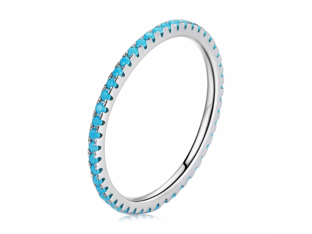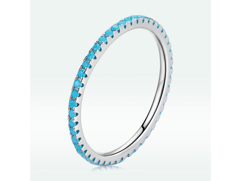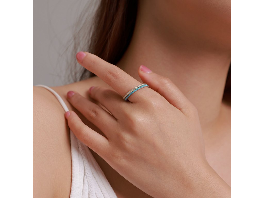 - Strieborný prsteň v dizajne elegantnej línie zdobený ručne posádzanými tyrkysovými zirkónmi. Originálny dizajn prsteňa, kvalitné spracovanie a materiál, ručne dohotovené.