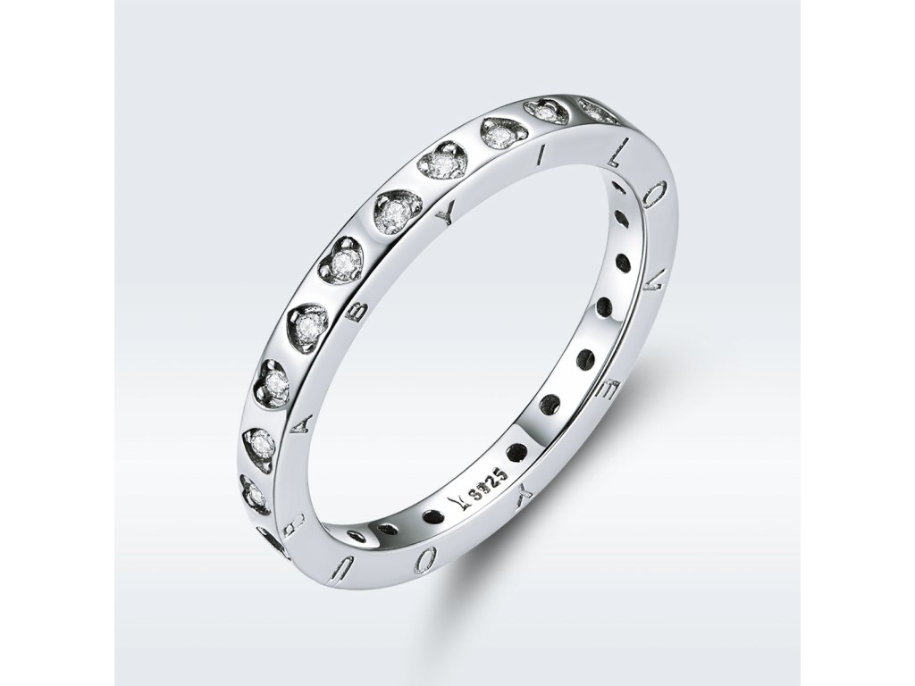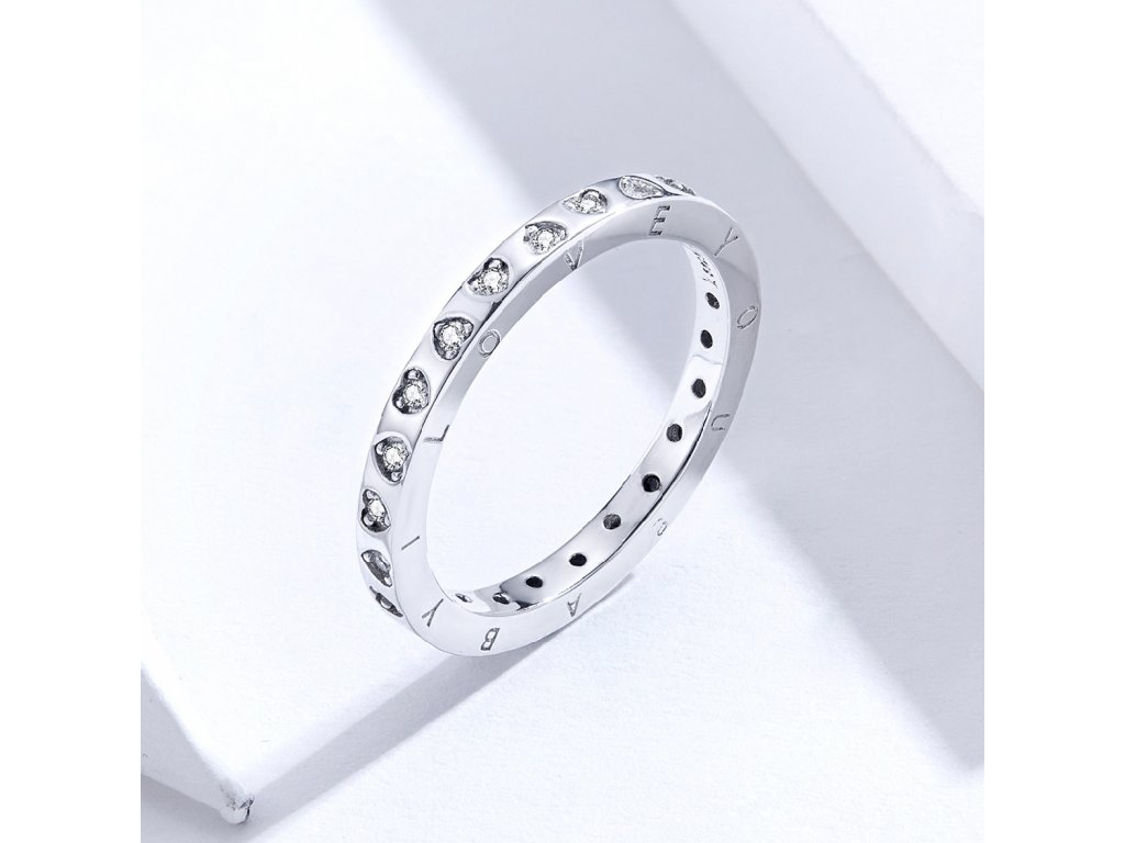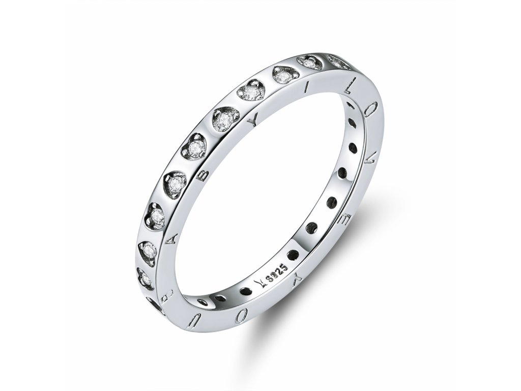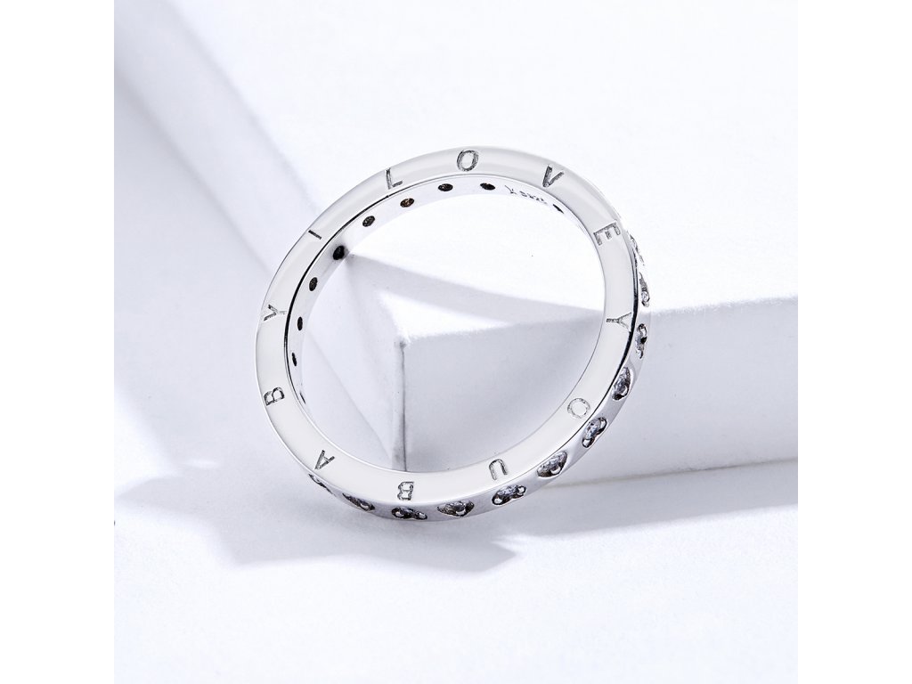 - Strieborný prepracovaný prsteň v dizajne Vyznanie lásky zdobený srdiečkami s čírymi trblietavými zirkónmi a anglickým nápisom "I love you baby" v preklade "Milujem ťa láska".