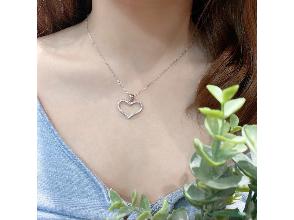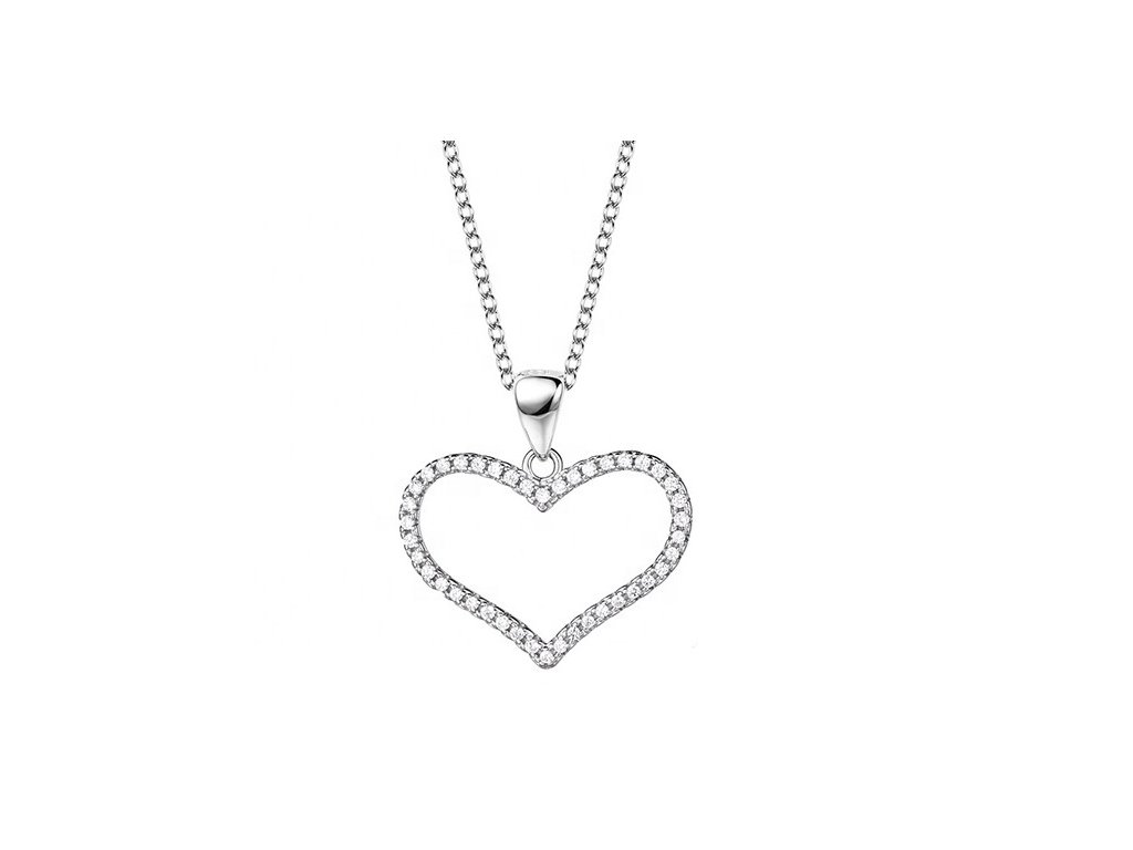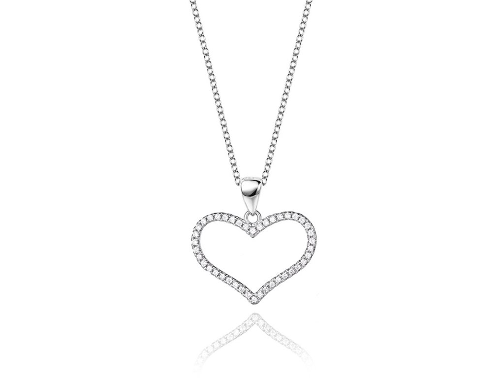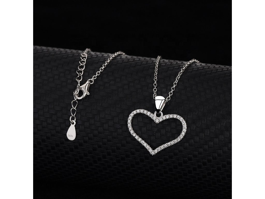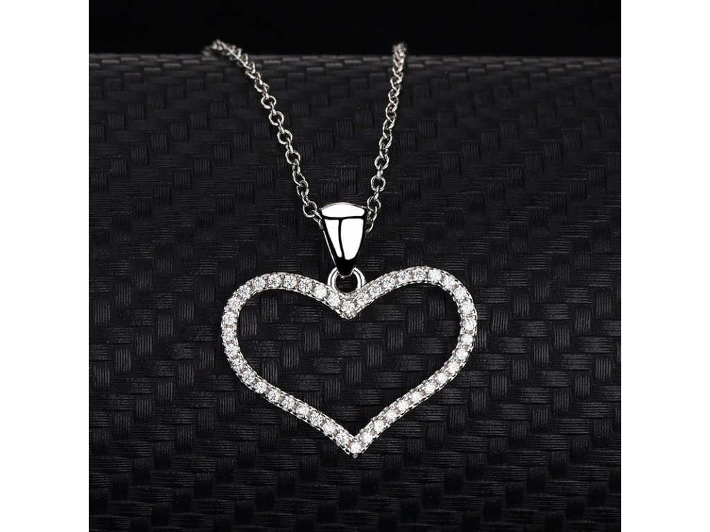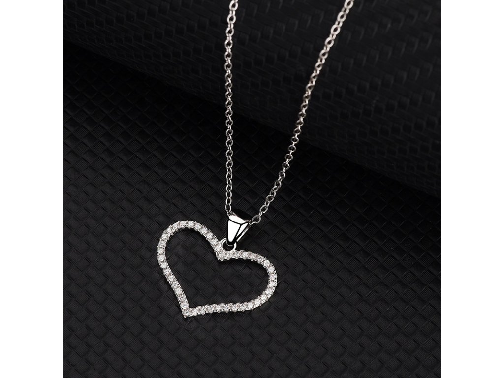 - Strieborný rhodiovaný náhrdelník s príveskom v tvare stredne veľkého milovaného srdca zdobeného ručne posádzanými čírymi trblietavými zirkónmi. Originálny dizajn náhrdelníka, kvalitné spracovanie a materiál, ručne dohotovené.
