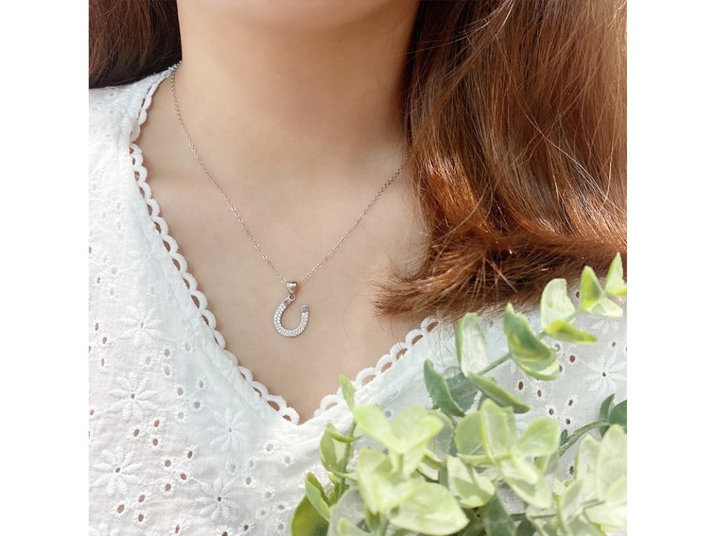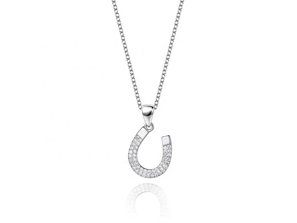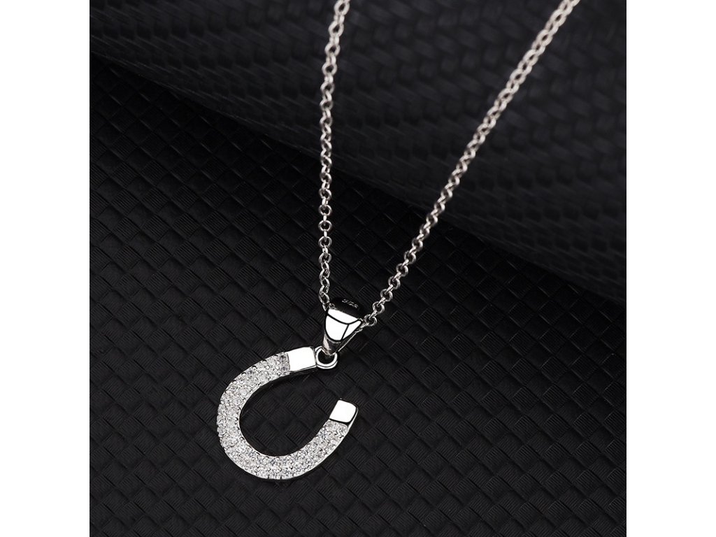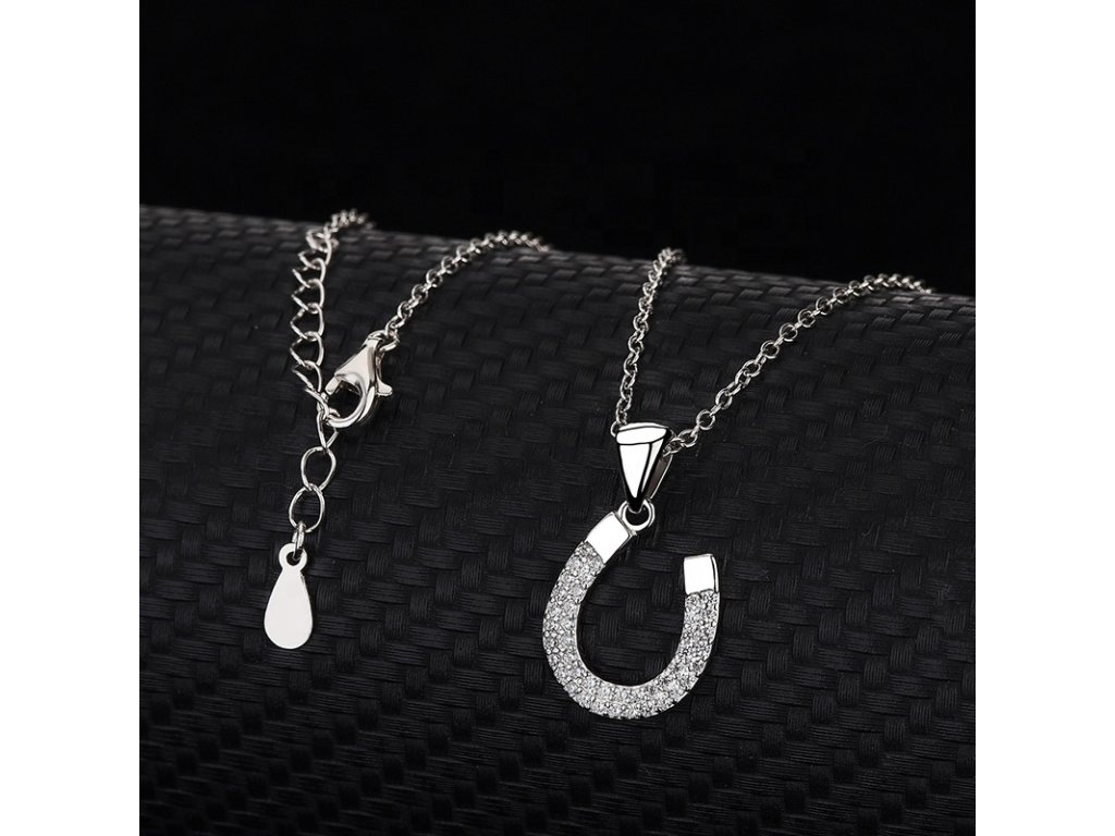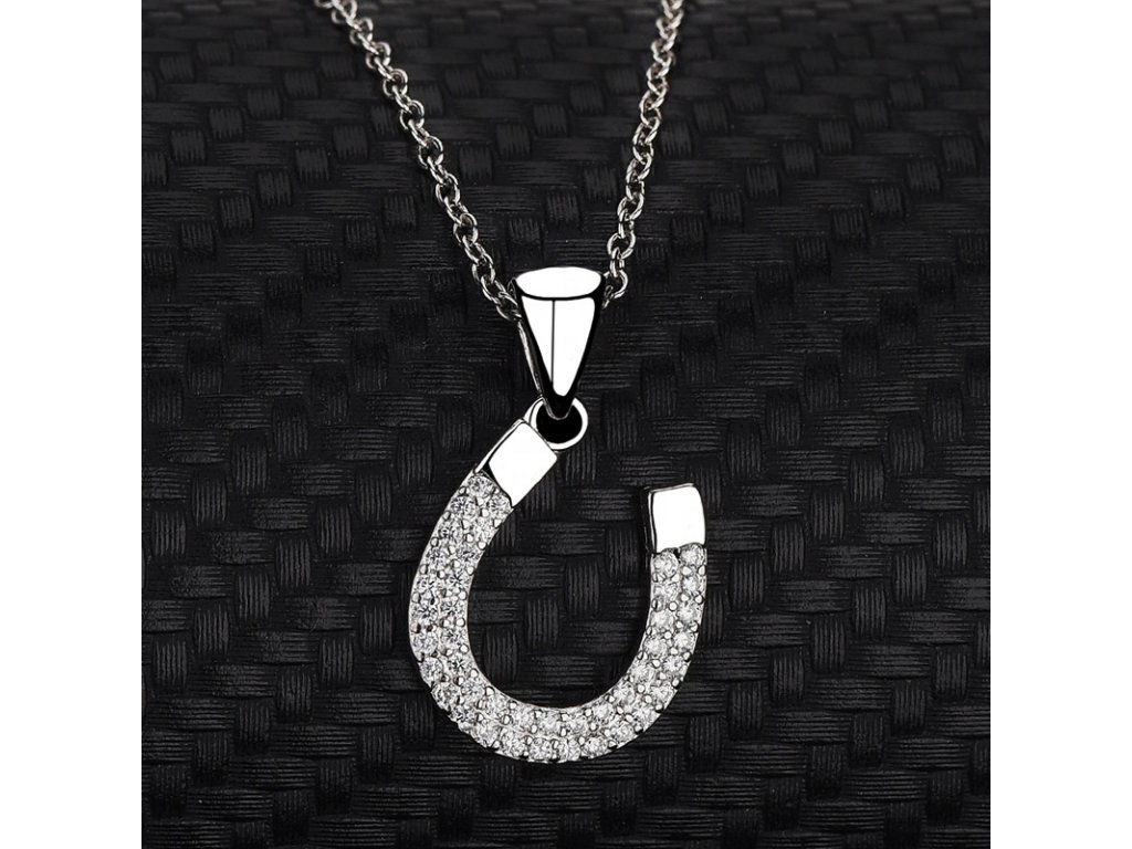 - Strieborný rhodiovaný náhrdelník s príveskom v tvare podkovy pre šťastie zdobené ručne posádzanými čírymi trblietavými zirkónmi. Originálny dizajn náhrdelníka, kvalitné spracovanie a materiál, ručne dohotovené.