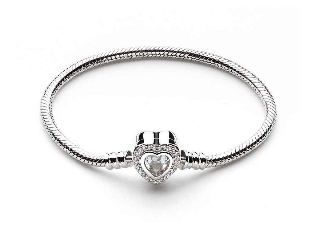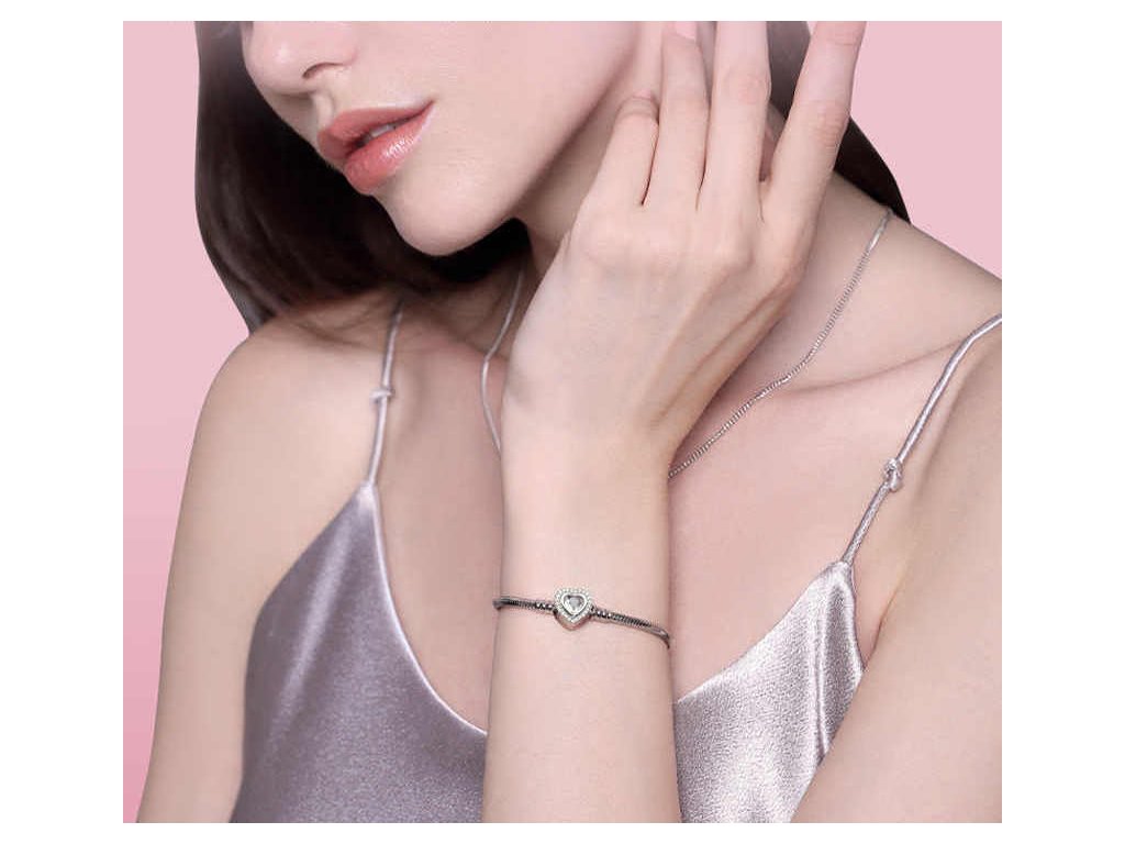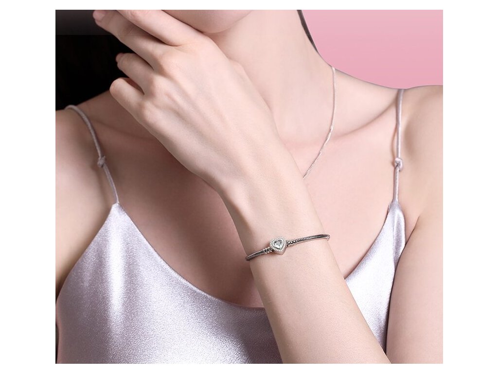 - Luxusný strieborný rhodiovaný pružný náramok na prívesky v dizajne Krištáľového srdca zdobeného čírymi trblietavými zirkónmi. Originálny design náramku, kvalitné spracovanie a materiál, ručne dohotovené.
