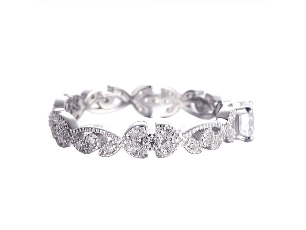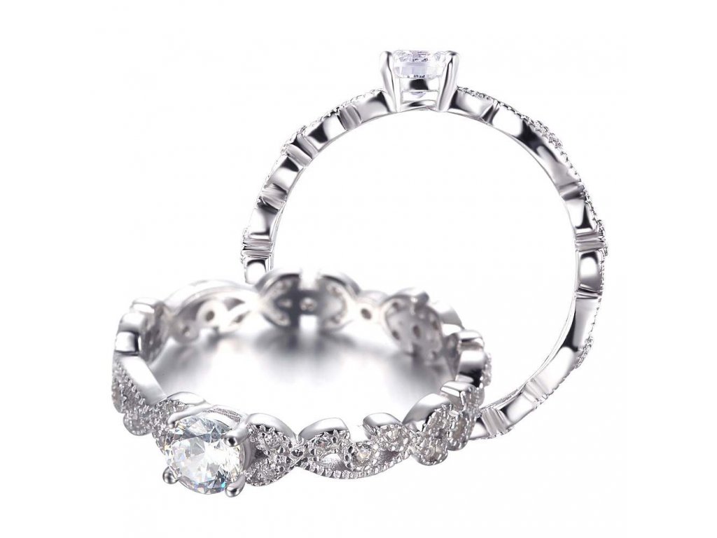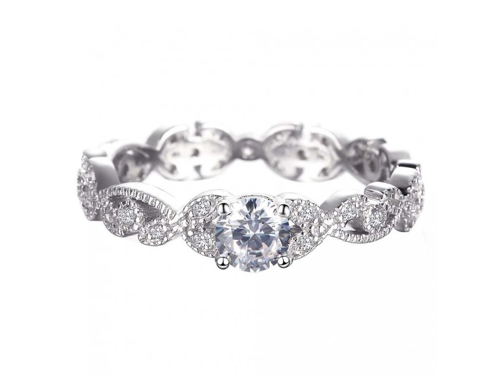 - Strieborný rhodiovaný prsteň v dizajne Princeznin klenot zdobený čírymi trblietavými zirkónmi. Stred prsteňa tvorí brúsený číry kameň v podobe zirkónu.