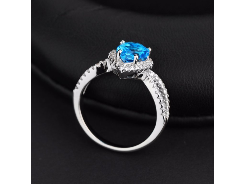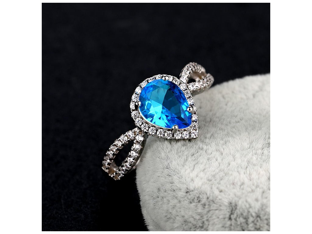 ♥ Strieborný rhodiovaný prsteň s drahokamom v elegantnom dizajne v tvare kvapky zdobený veľkým modrým syntetickým zafírom a čírymi trblietavými zirkónmi. Originálny dizajn prsteňa, kvalitné spracovanie a materiál, ručne dohotovené. ♥