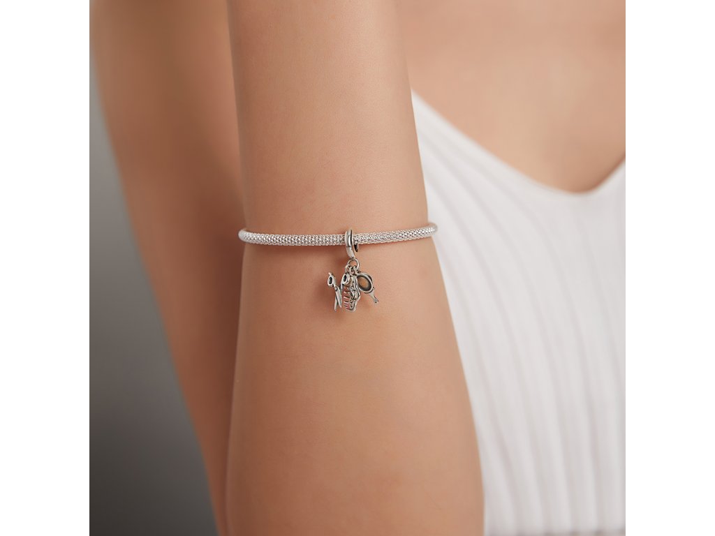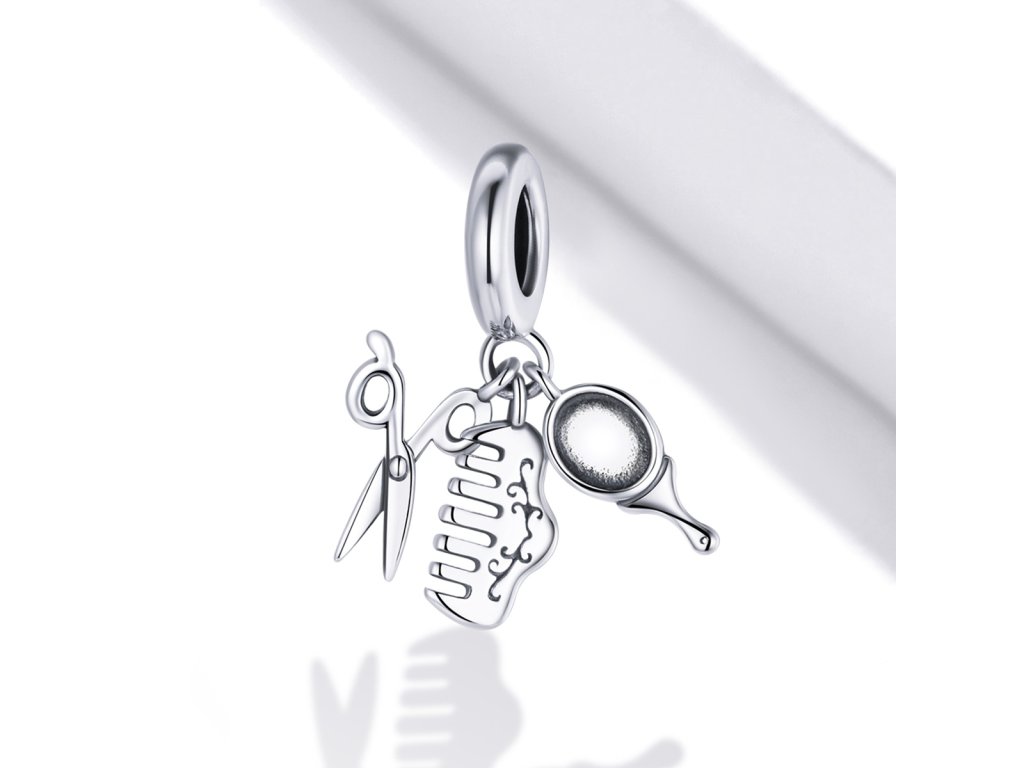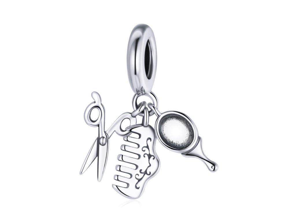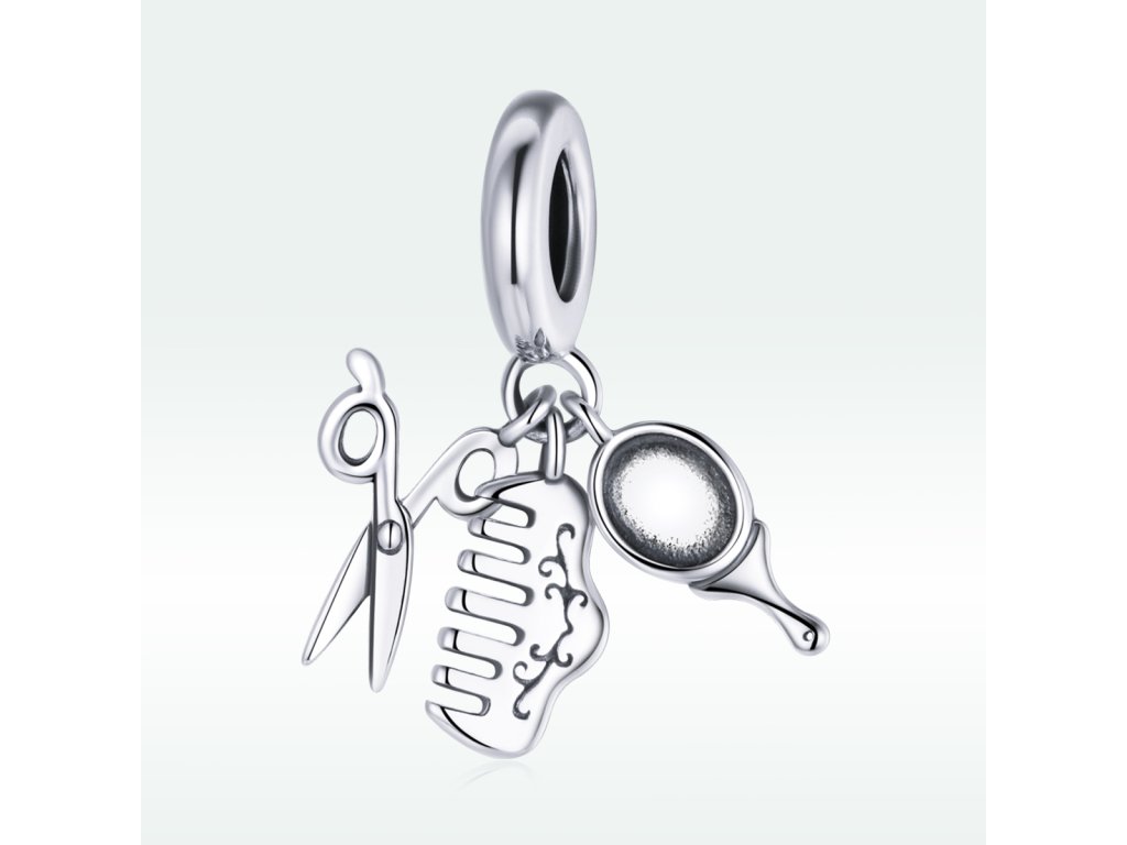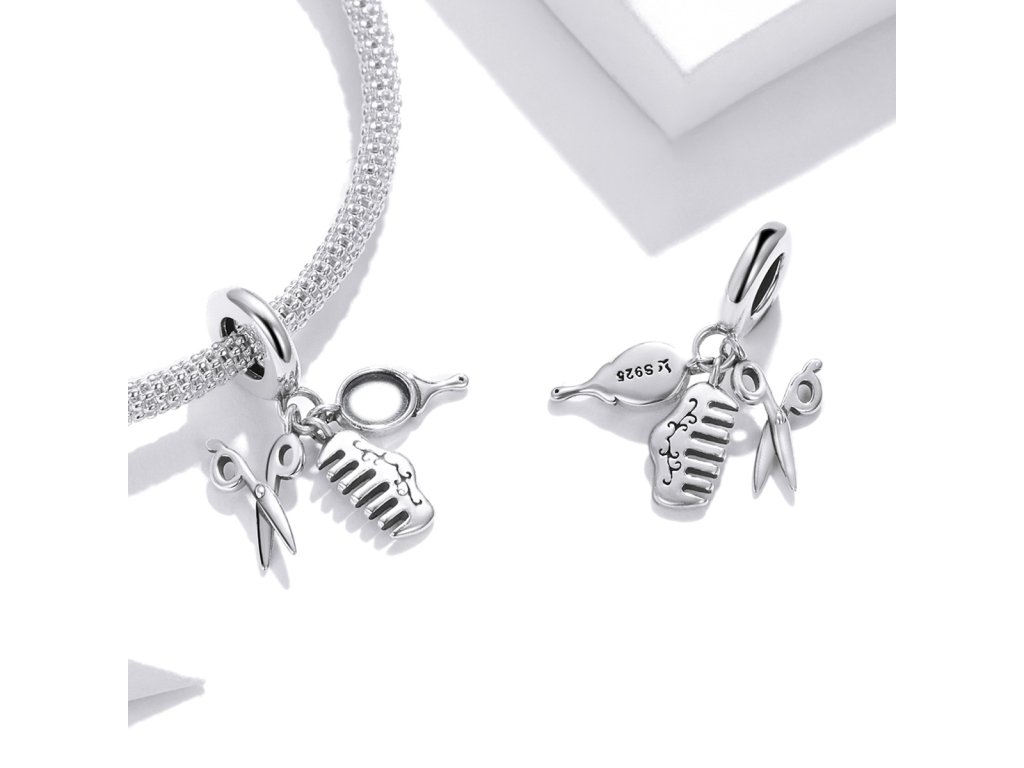 - Strieborný visiaci prívesok v dizajne Kaderníckeho setu tvoreného z krásneho hrebeňa, nožníc a zrkadla. Prívesok je tiež zdobený oxidáciou, aby strieborný dizajn viac vynikol. Tento set nemusí byť nosený iba kaderníčkami, ale aj ženami, ktoré o seba dbajú. Originálny design prívesku, kvalitné spracovanie a materiál, ručne dohotovené.
