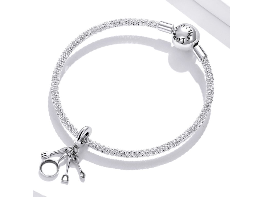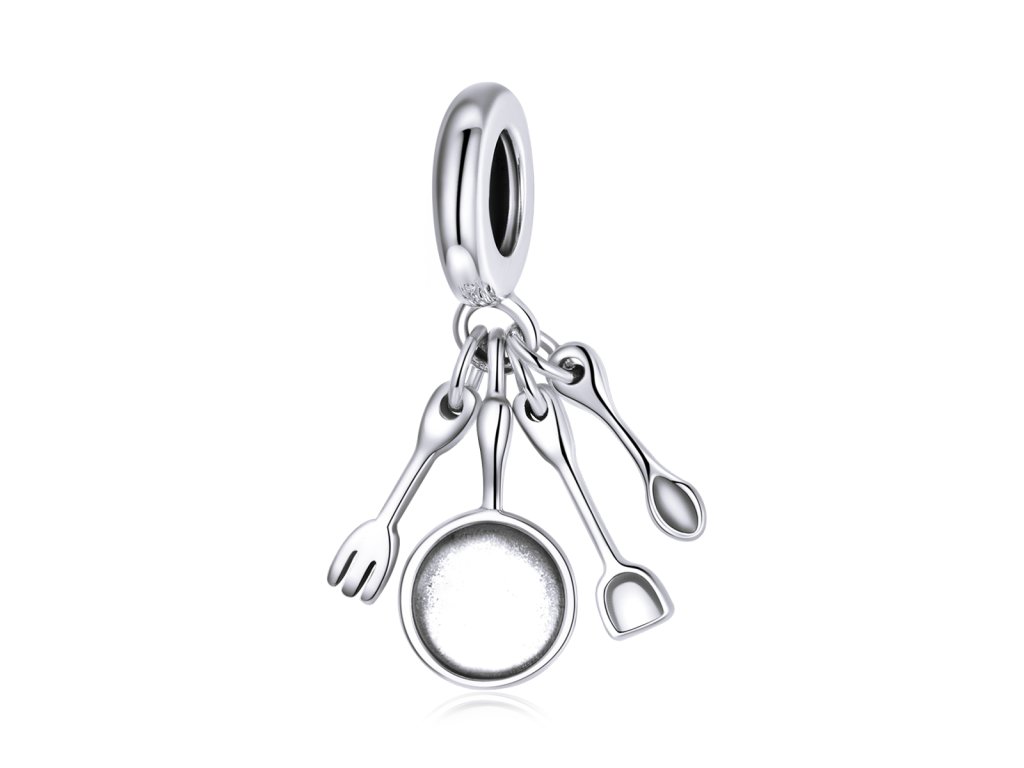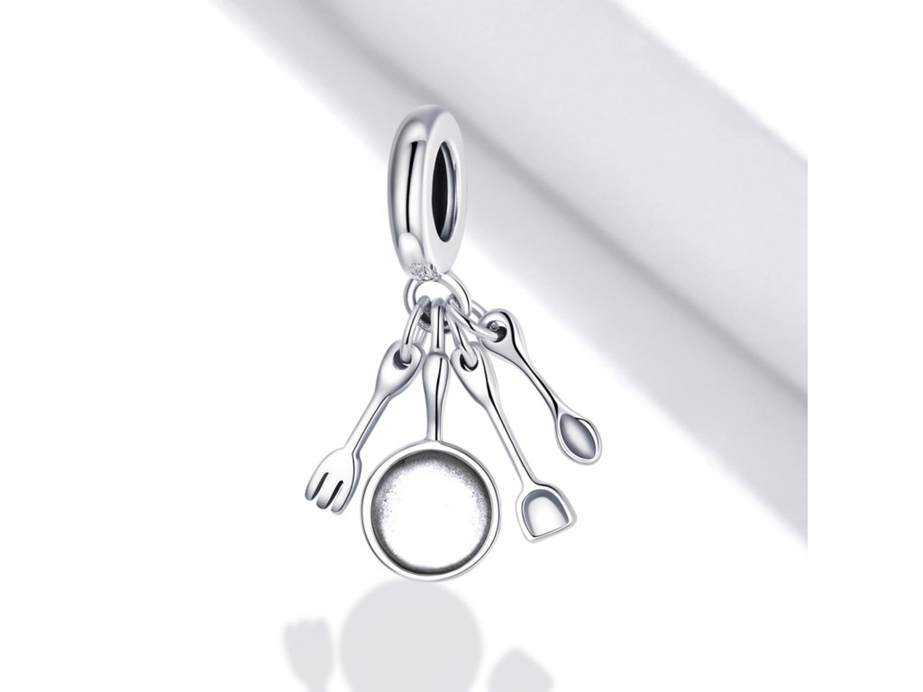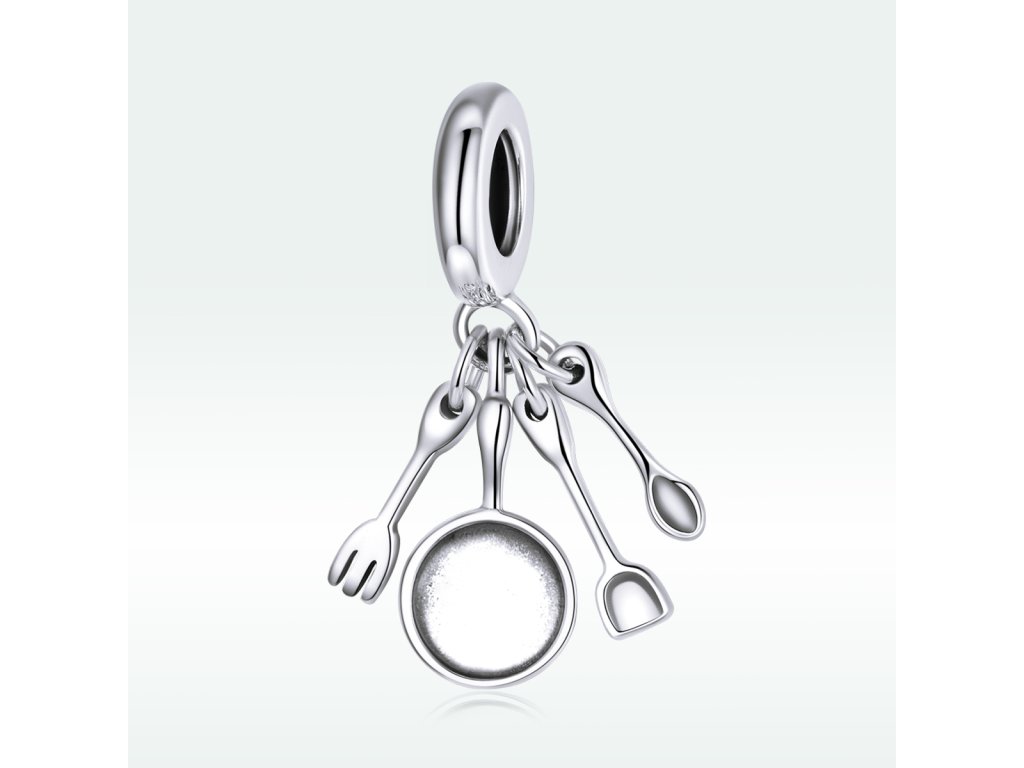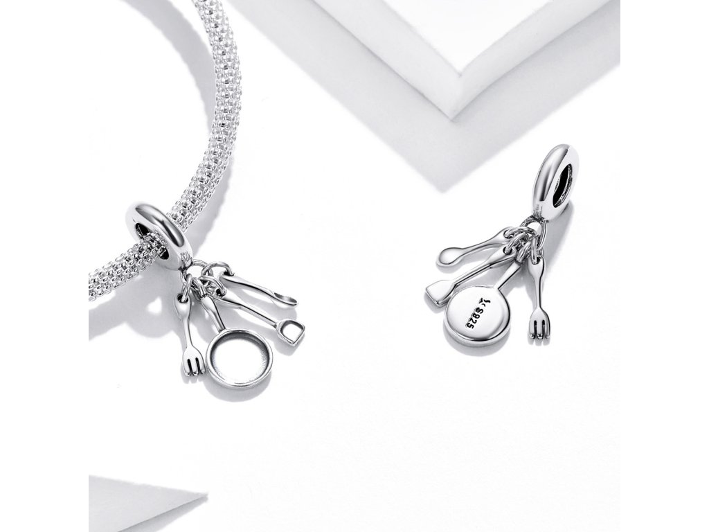 - Strieborný visiaci prívesok v dizajne Kuchárskeho setu špeciálne navrhnutý pre ženy, ktoré rady varia. Prívesok je tiež zdobený oxidáciou, aby strieborný dizajn viac vynikol.