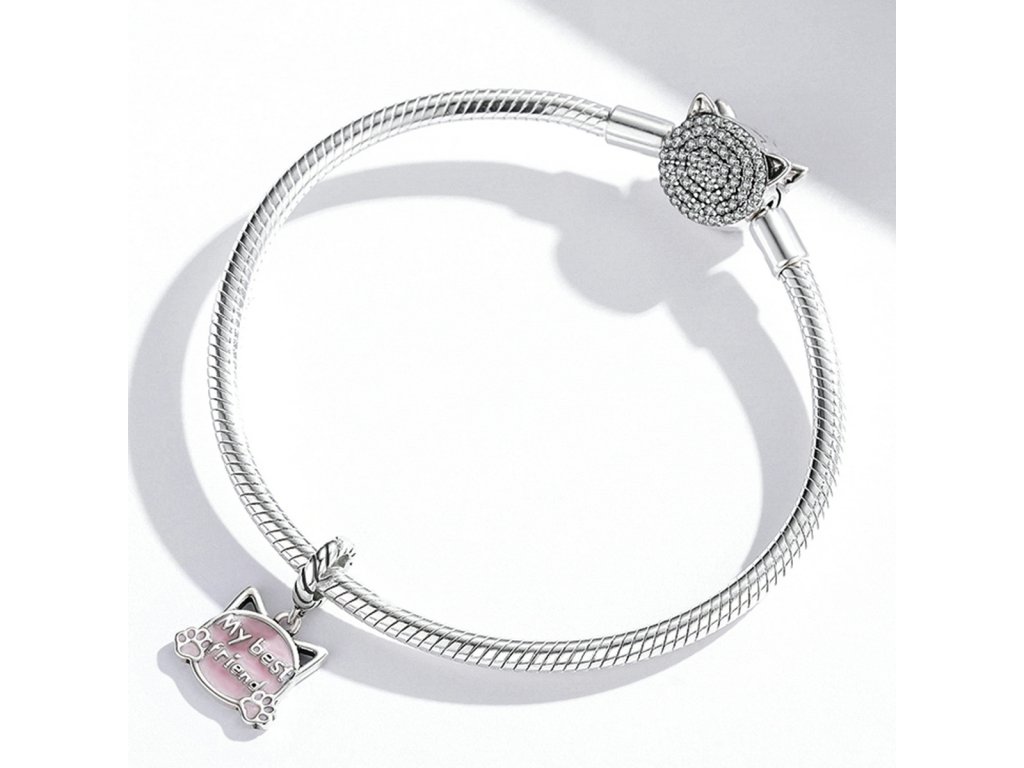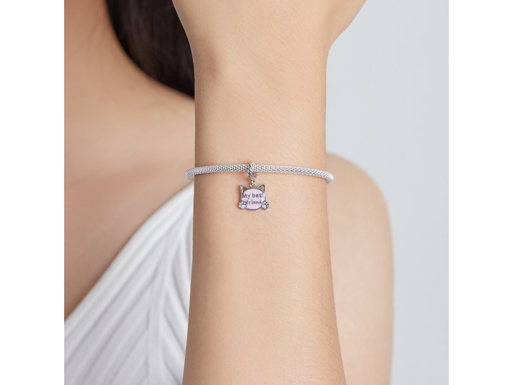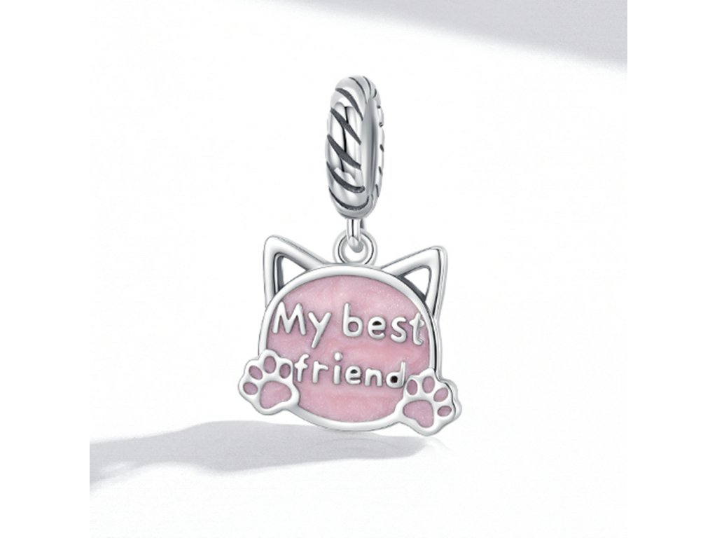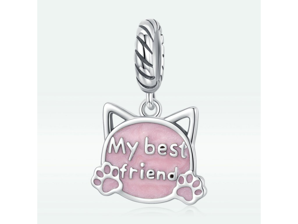- Strieborný visiaci prívesok v tvare mačky s roztomilými uškami a packami. Je zdobený ručne nanášanou trblietavou glazúrou a anglickým nápisom "My best friend" v preklade "Môj najlepší kamarát". Originálny design prívesku, kvalitné spracovanie a materiál, ručne dohotovené.