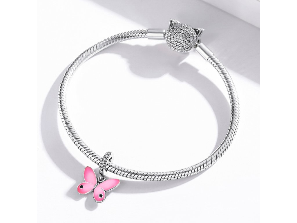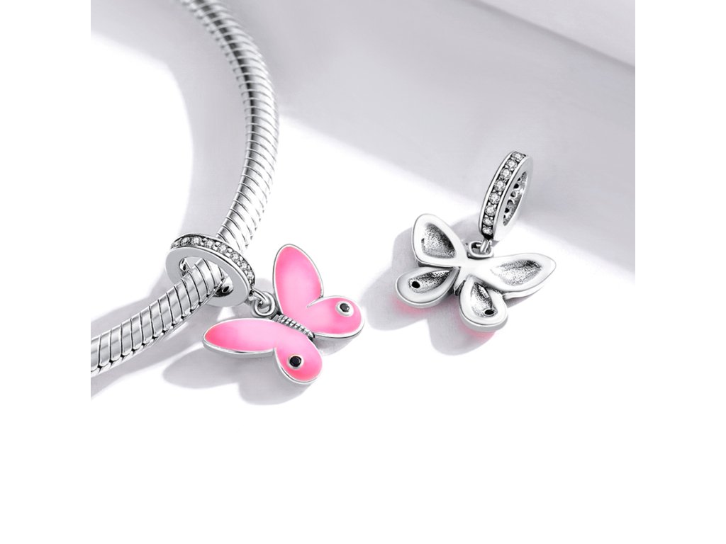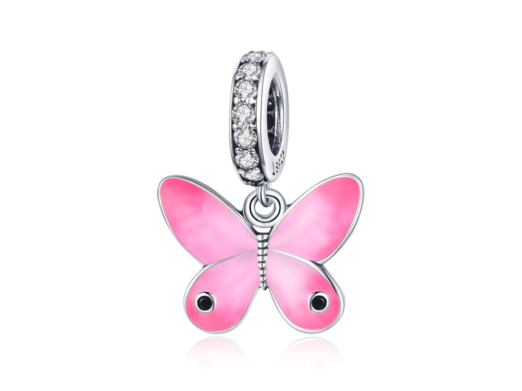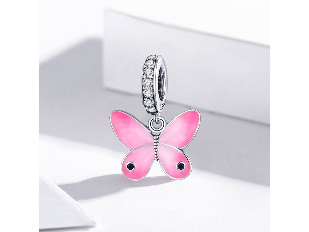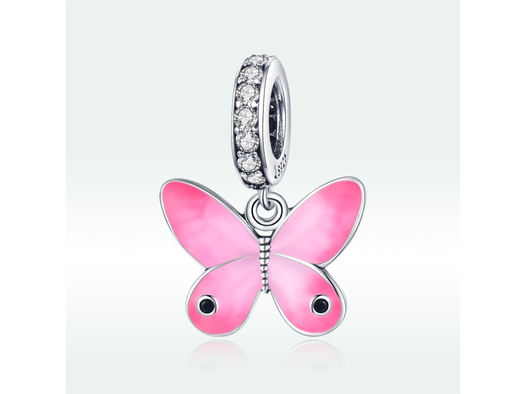 Emporial strieborný visiaci prívesok Ružový glazúrovaný motýľ