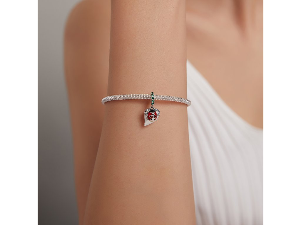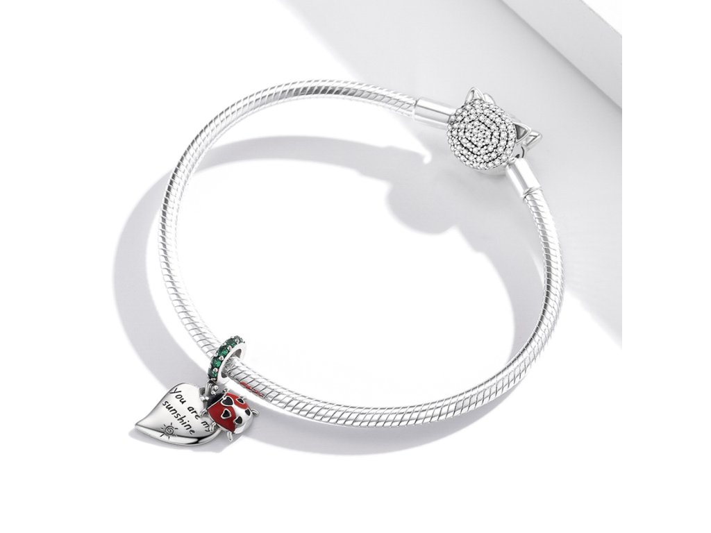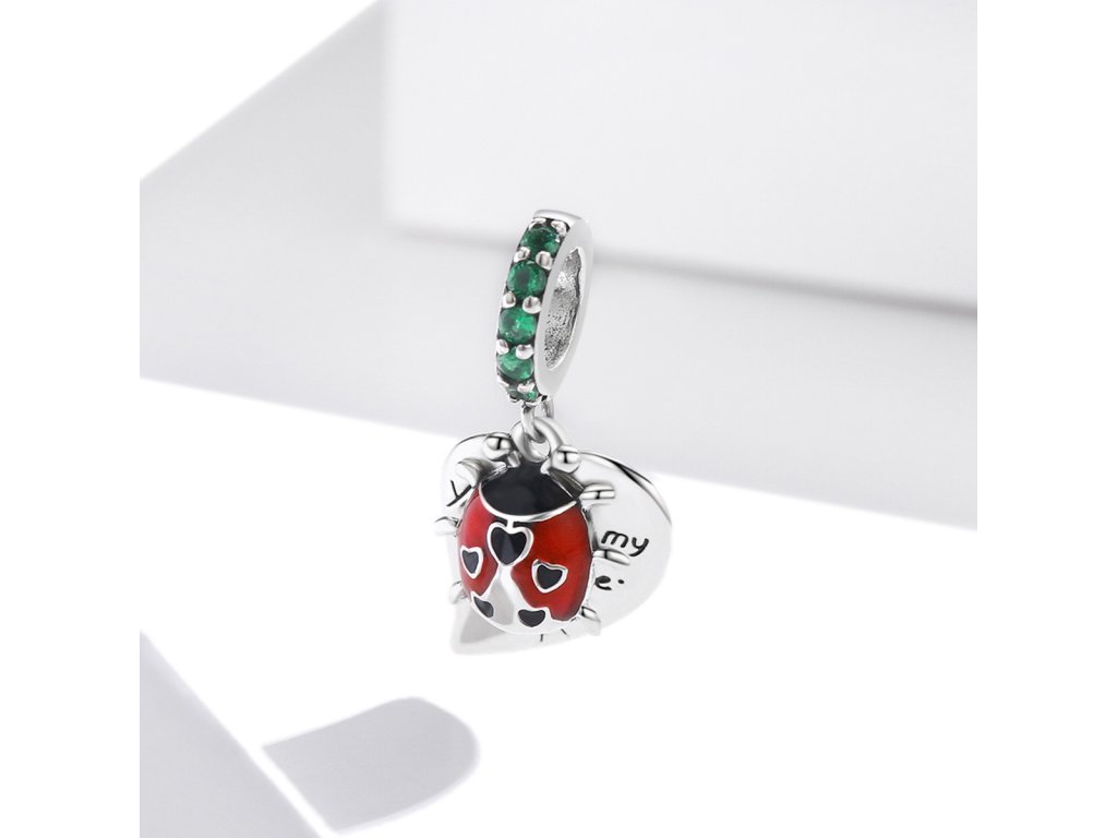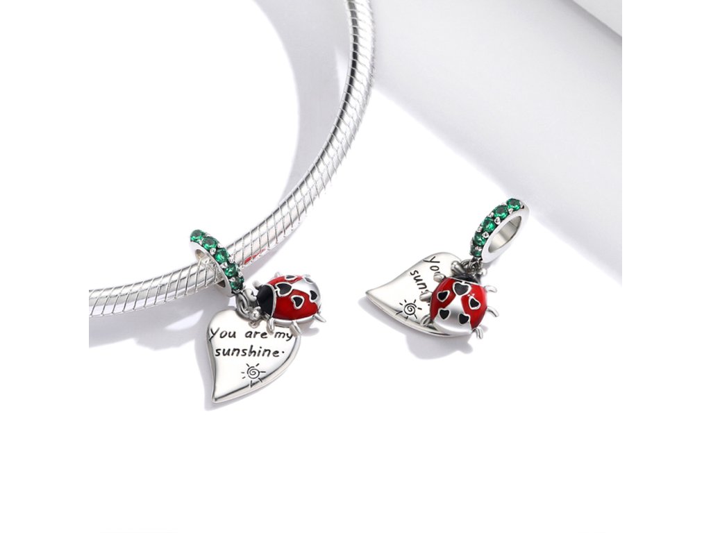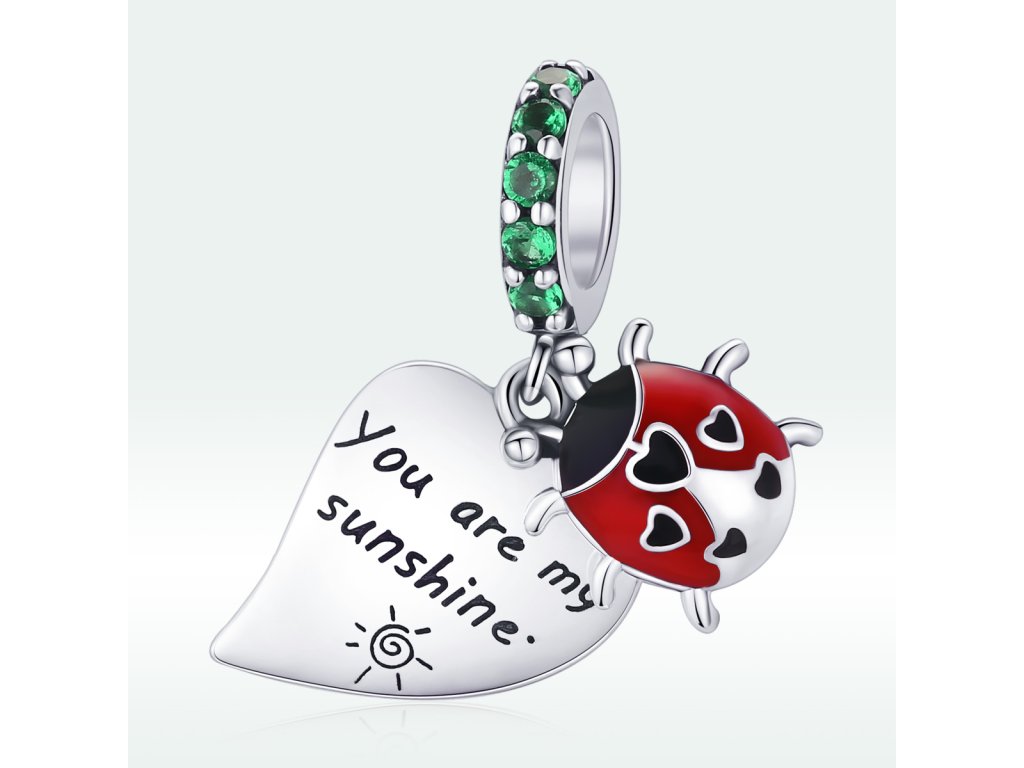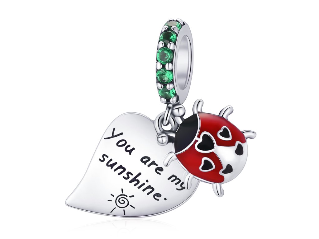 - Strieborný visiaci prívesok s lienkou zdobenou milovanými čiernymi srdiečkami a ručne nanášanou bielo-červenou glazúrou. Prívesok je ďalej zdobený zelenými trblietavými zirkónmi a veľkým srdcom s anglickým nápisom "You are my sunshine" v preklade "Si moje slniečko". Originálny design prívesku, kvalitné spracovanie a materiál, ručne dohotovené.