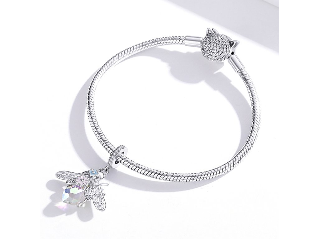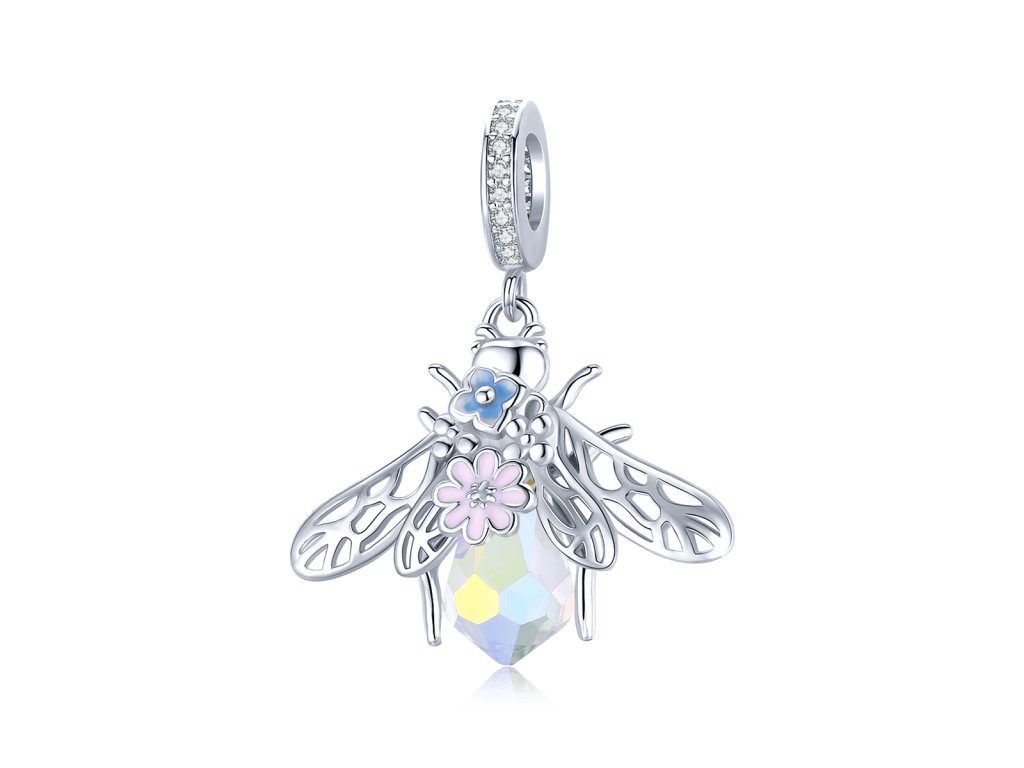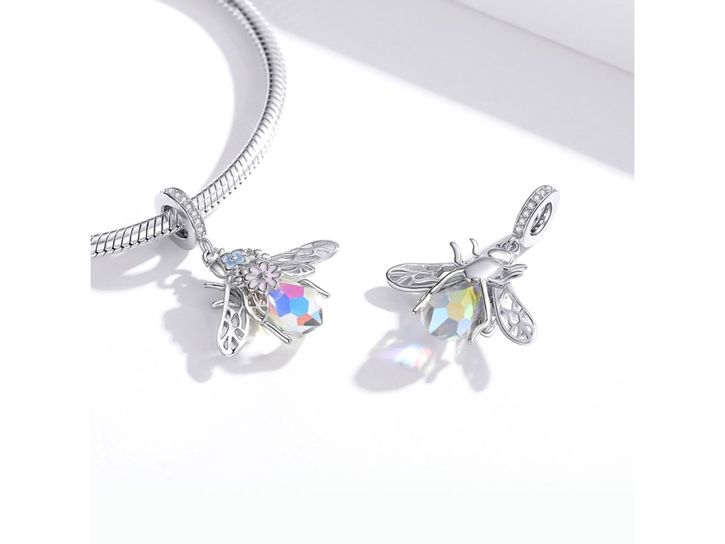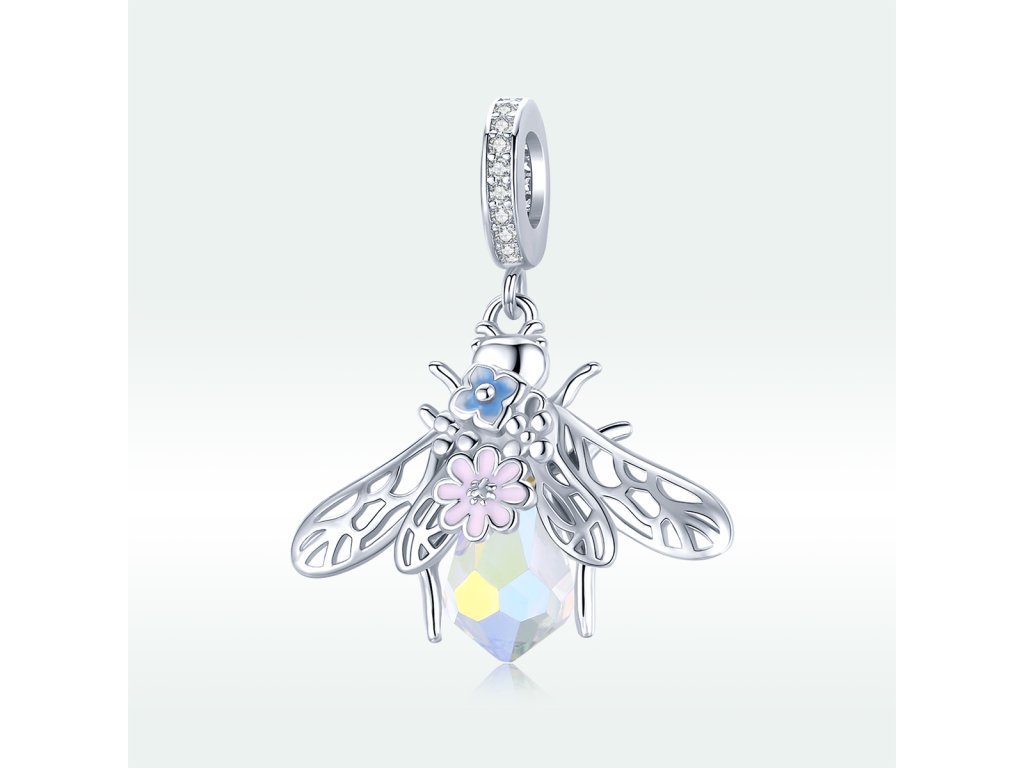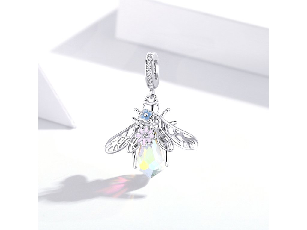 - Strieborný visiaci prívesok v dizajne krásnej včely zdobenej filigránovými krídlami a kvetmi s ručne nanášanou modrou a ružovou glazúrou. Prievlak prívesku je posádzaný radom trblietavých čírych zirkónov. Hlavný atribút tohto skvostu je nepochybne krištáľový brúsený kameň, ktorý na slnku hádže úžasné odlesky. Originálny design prívesku, kvalitné spracovanie a materiál, ručne dohotovené.