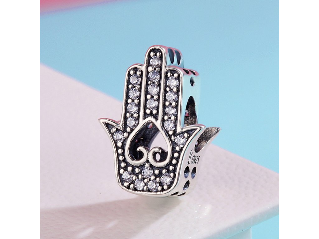 Luxusný prívesok symbol ochrany Hamsa zdobený trblietavými zirkónmi a elegantnými výrezmi vyžarujúcimi vzdušnosť a ľahkosť jemného prívesku.
