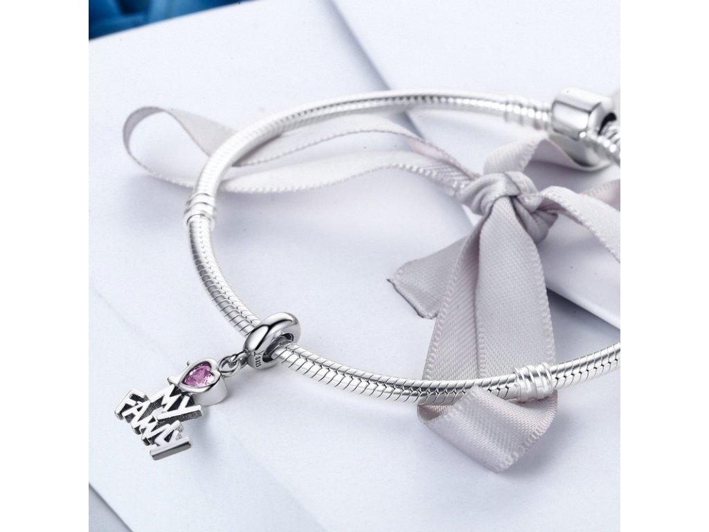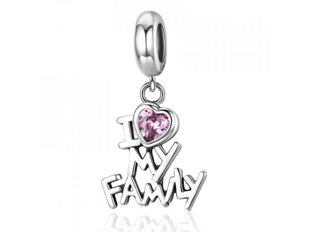 Krásny a milovaný visiaci prívesok s ružovým zirkónom v tvare srdca a anglickým nápisom „I love my family“ (v preklade „Milujem svoju rodinu“).