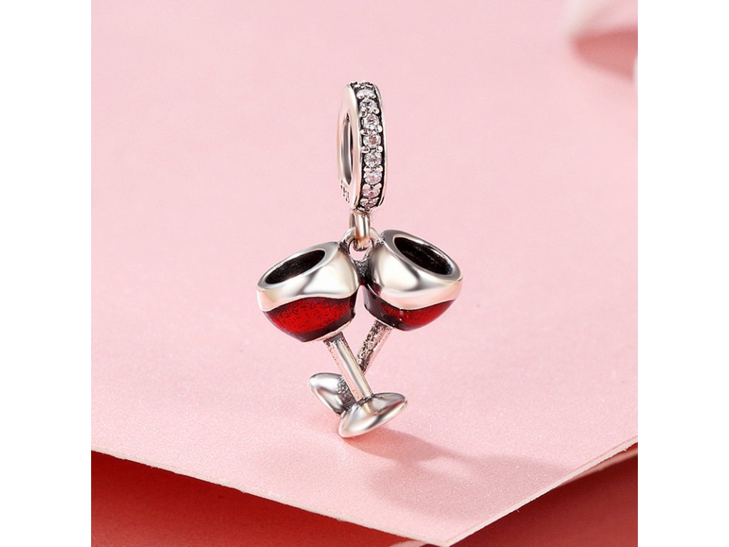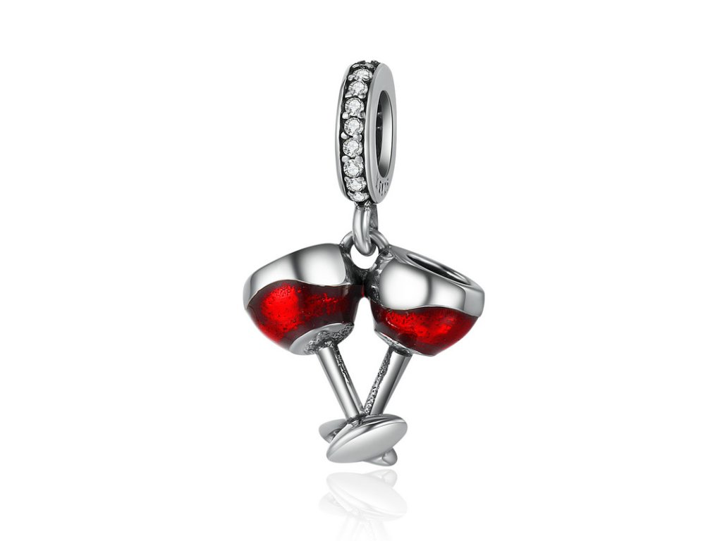Luxusný a prepracovaný visiaci prívesok v dizajne dvoch pohárov naliateho červeného vína.