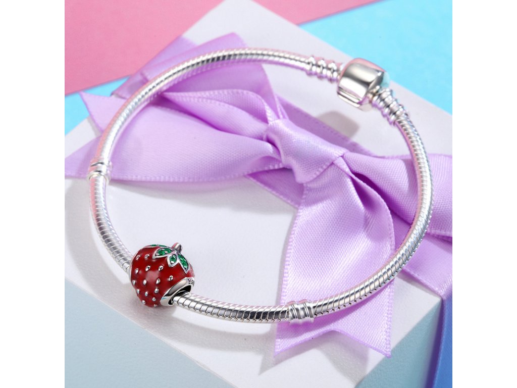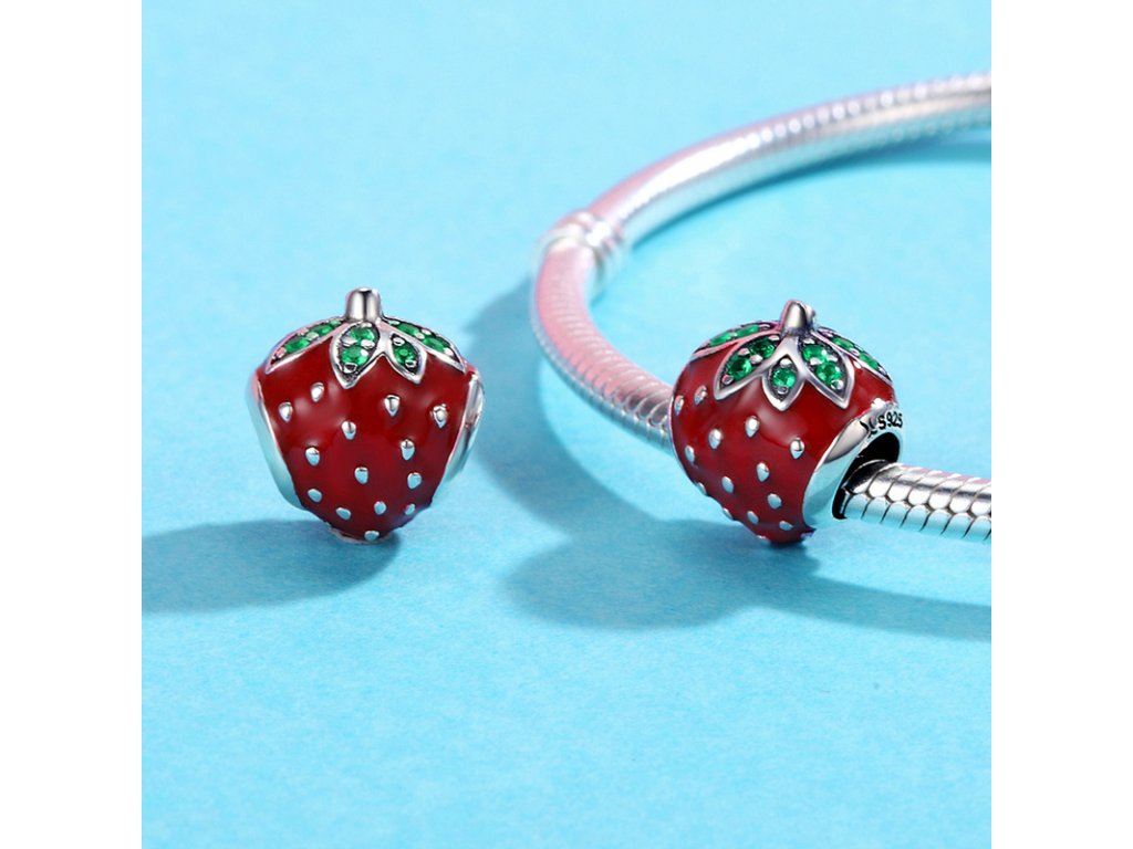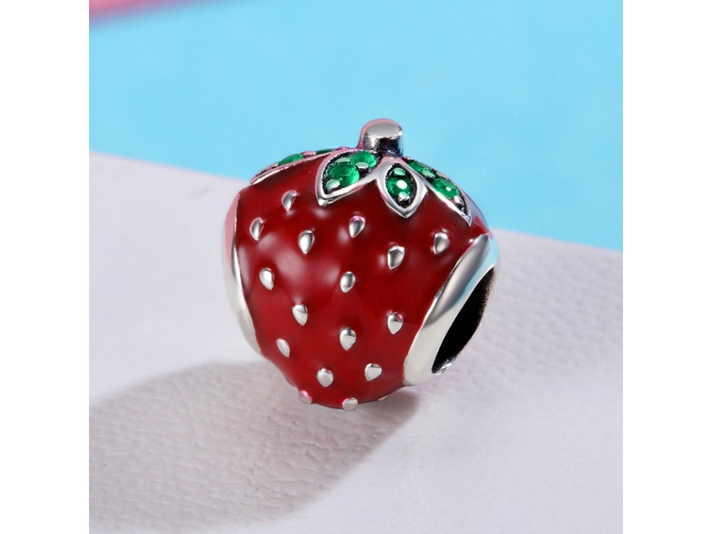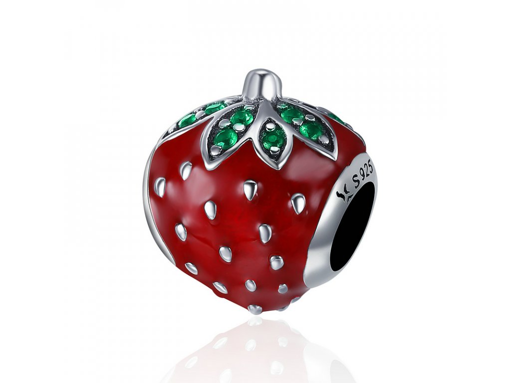Luxusný a prepracovaný prívesok v dizajne sladkej jahody obohatenej zelenými zirkónmi a ručne nanášanou červenou glazúrou.