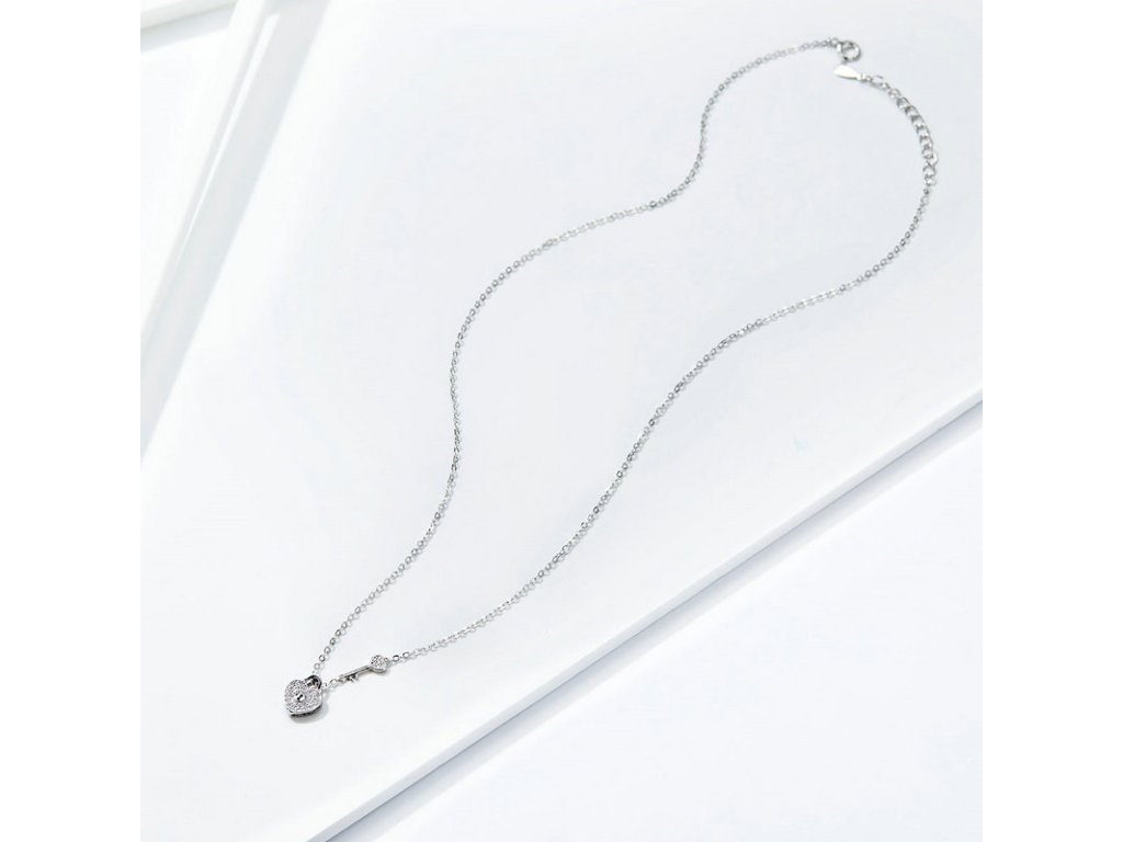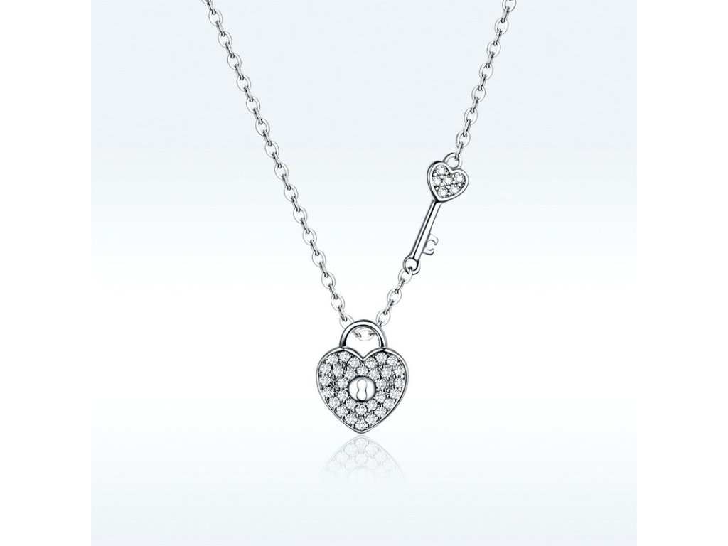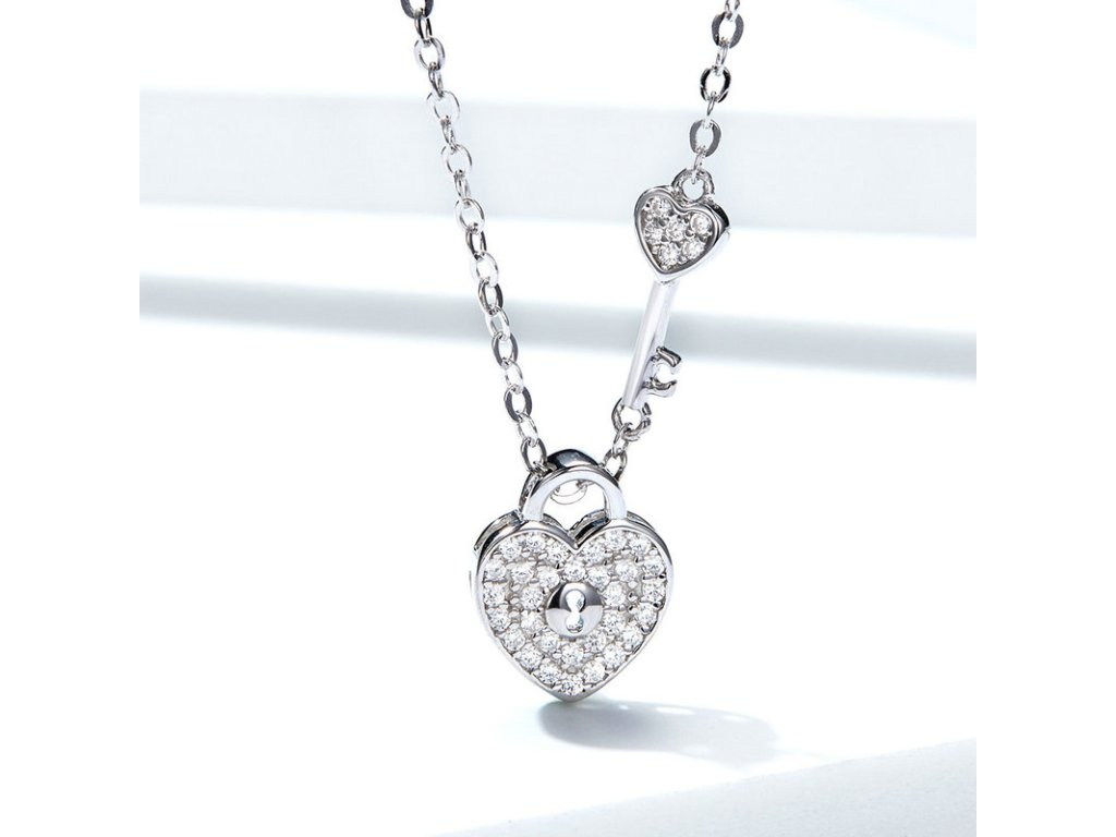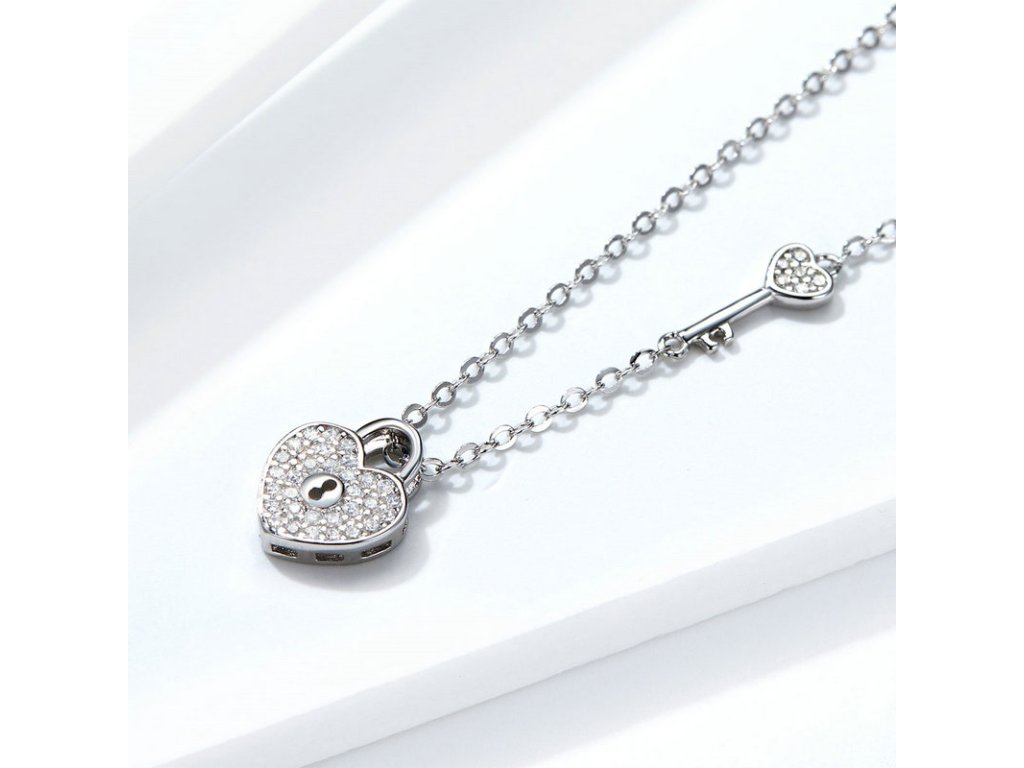 Elegantný strieborný náhrdelník zvýrazňujúci puto v podobe kľúča a zámku v tvare srdca s posádzanými trblietavými zirkónmi. Originálny dizajn náhrdelníka, kvalitné spracovanie a materiál, ručne dohotovené.