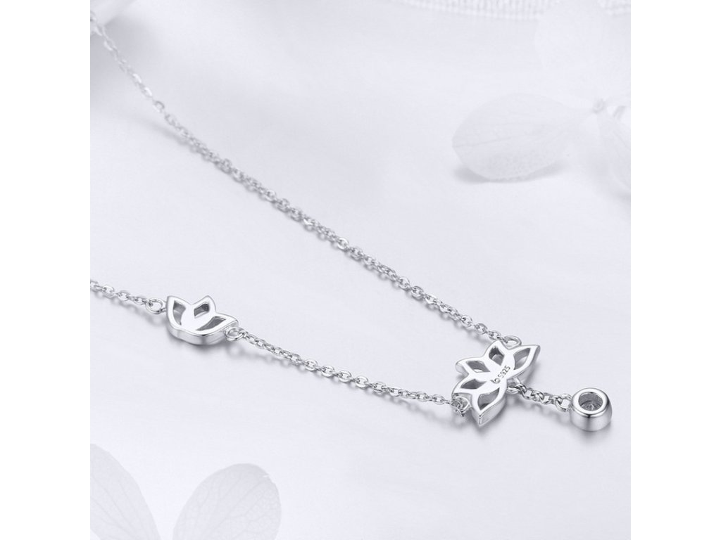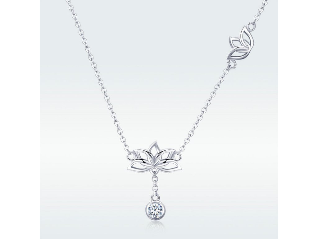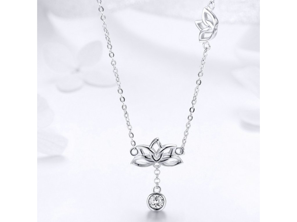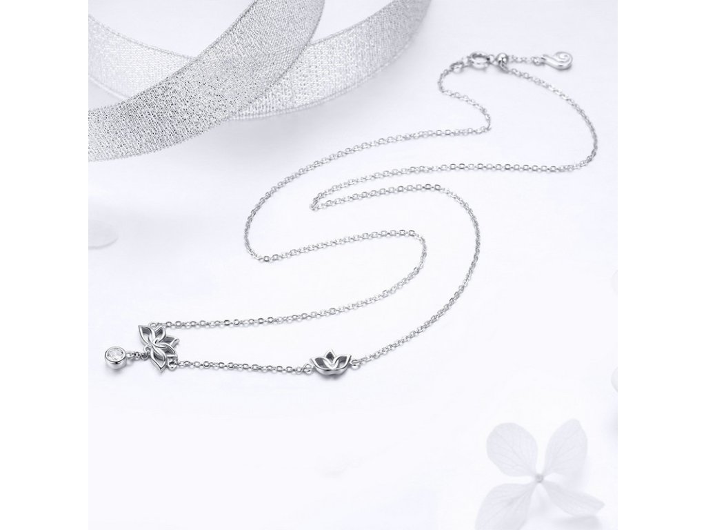 Jemný strieborný náhrdelník s príveskom lotosových kvetov doplnený trblietavým kameňom v podobe číreho zirkónu. Originálny dizajn náhrdelníka, kvalitné spracovanie a materiál, ručne dohotovené.
