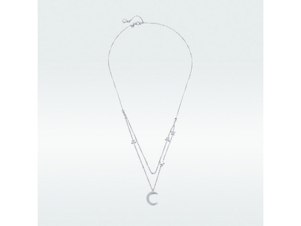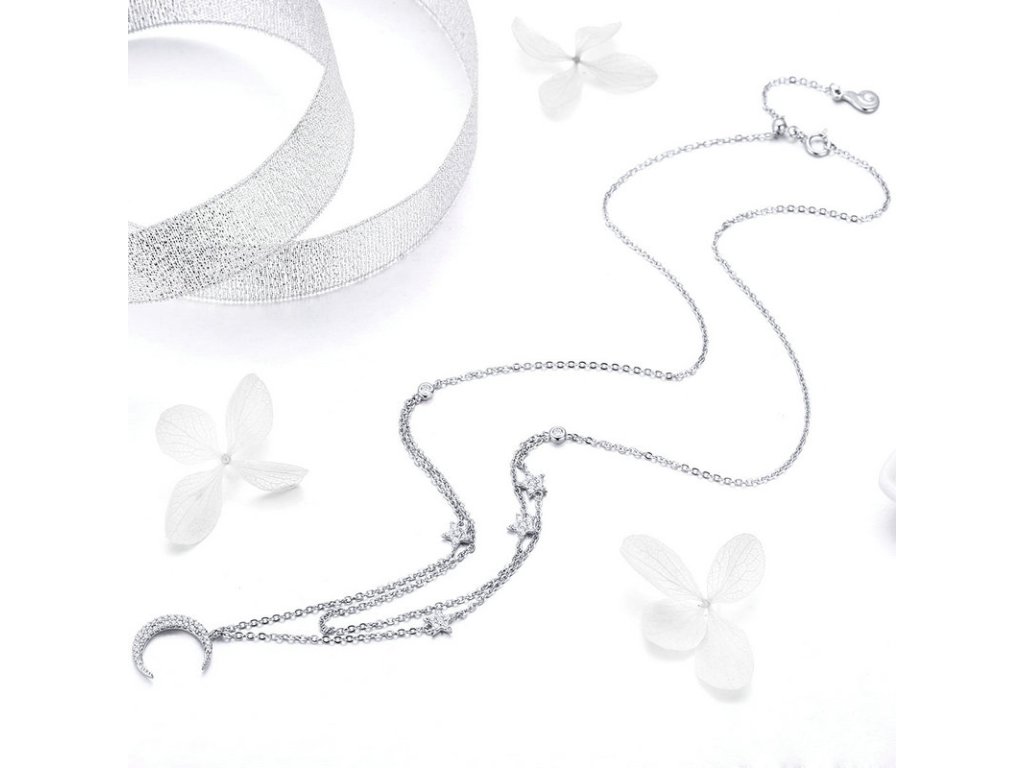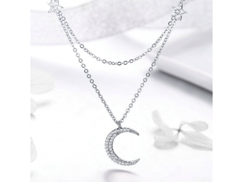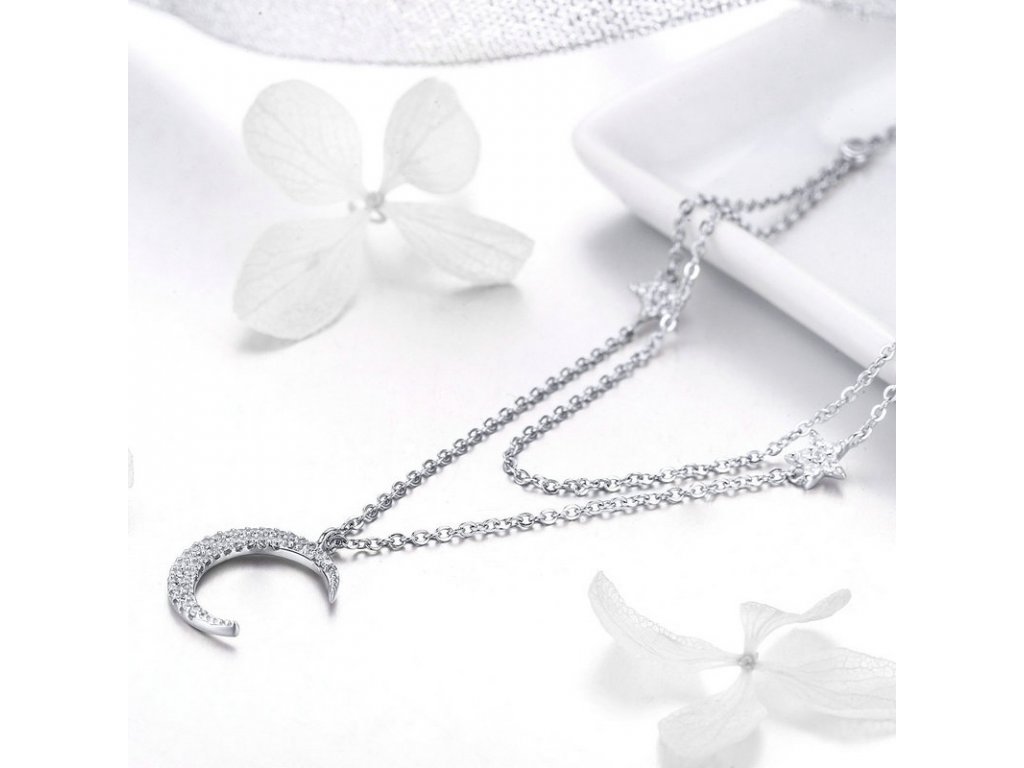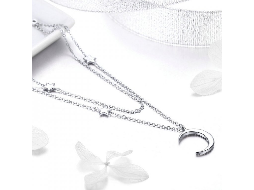 Originálny strieborný náhrdelník s dvojitou retiazkou dekorovaný príveskom mesiaca a jemnými hviezdičkami s čírymi zirkónmi. Originálny dizajn náhrdelníka, kvalitné spracovanie a materiál, ručne dohotovené.