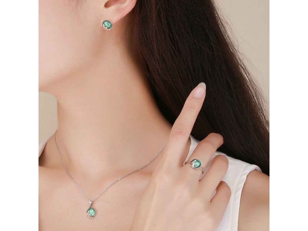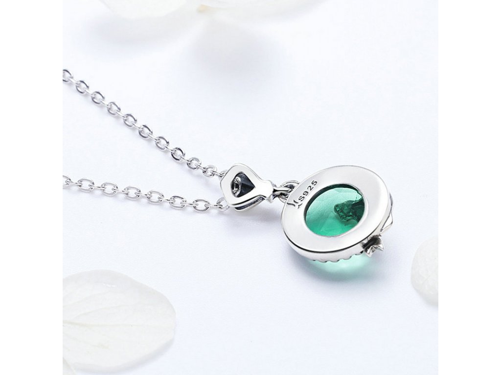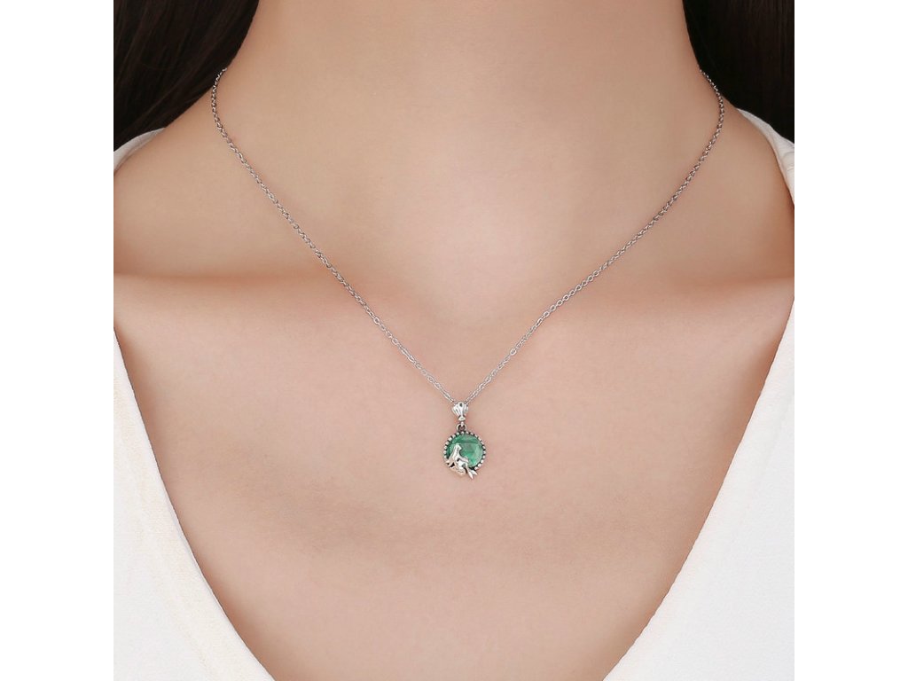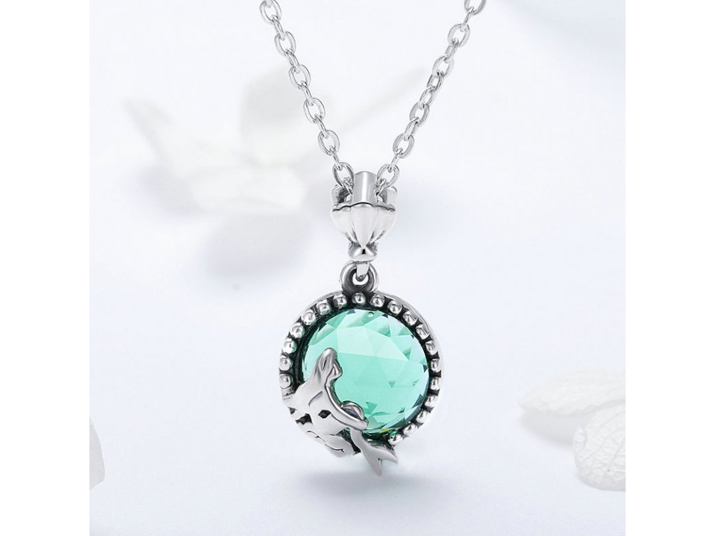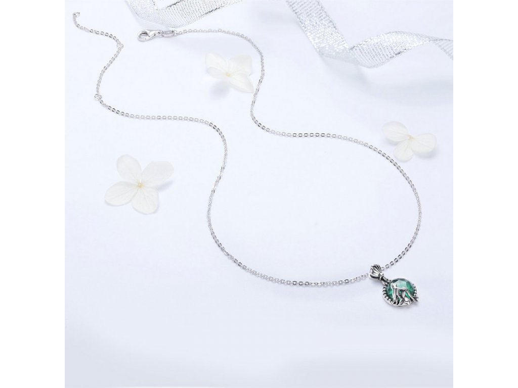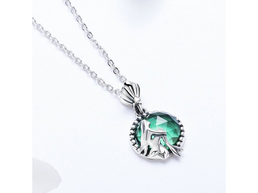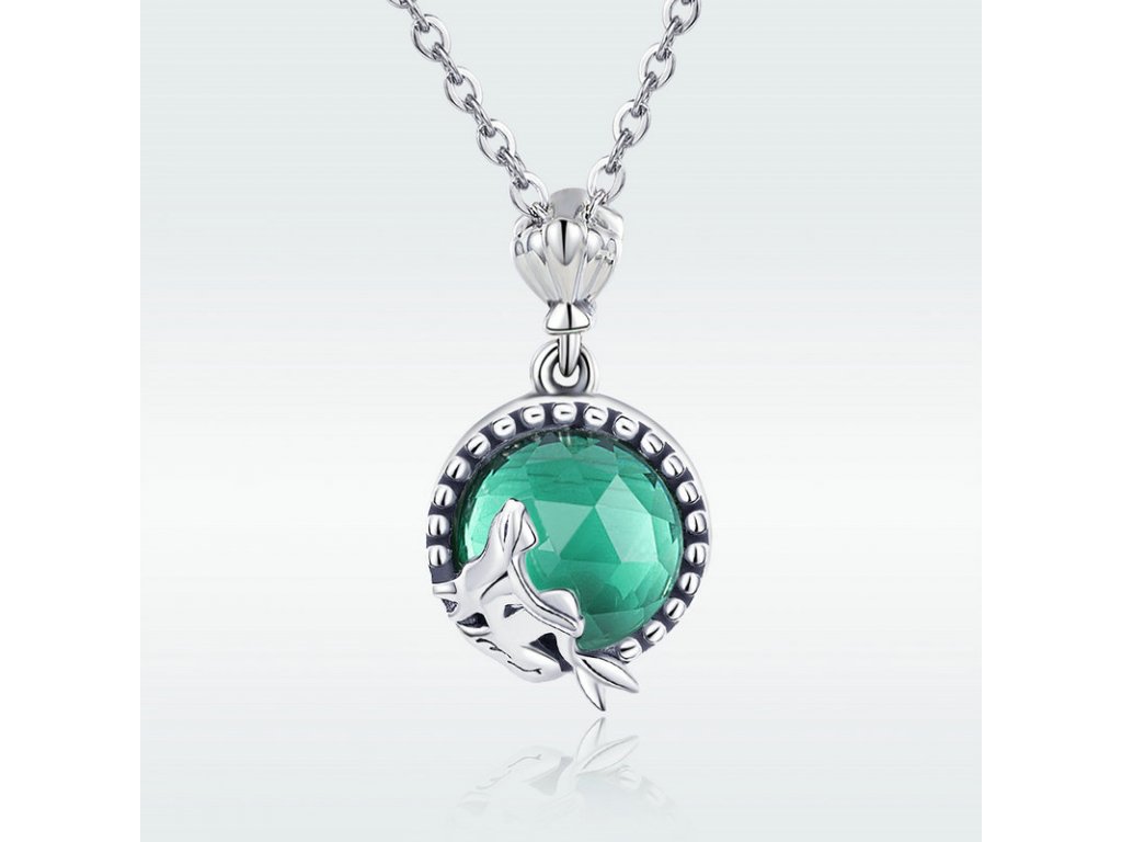 Krásny strieborný náhrdelník s visiacim príveskom zeleného kameňa v podobe zirkónu, ktorý je doplnený nežnou morskou vílou. Originálny dizajn náhrdelníka, kvalitné spracovanie a materiál, ručne dohotovené.