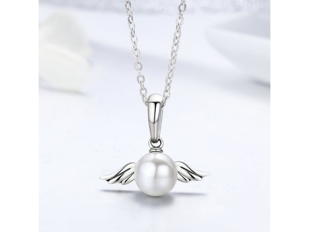 Luxusný náhrdelník z kvalitného striebra v dizajne jemnej perly s krásnymi prepracovanými anjelskými krídlami.
