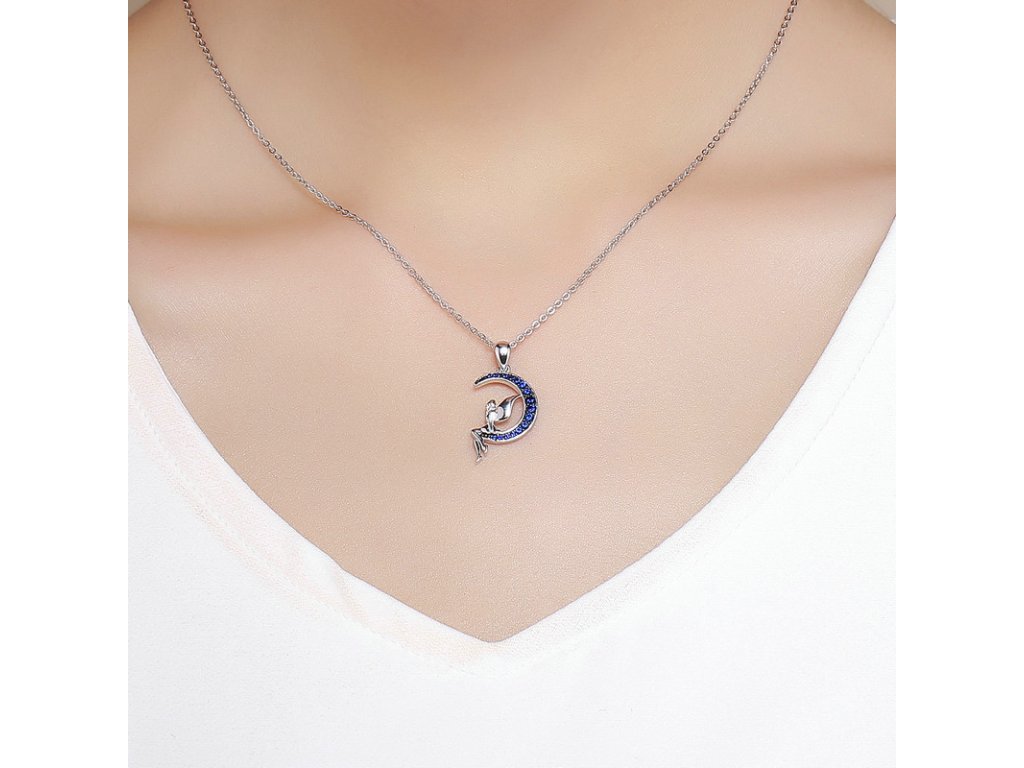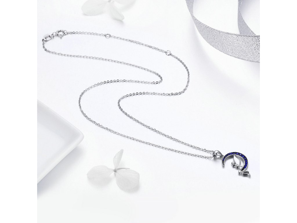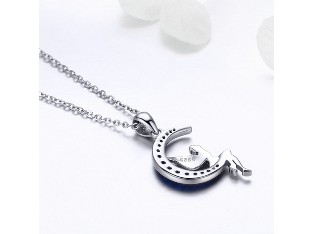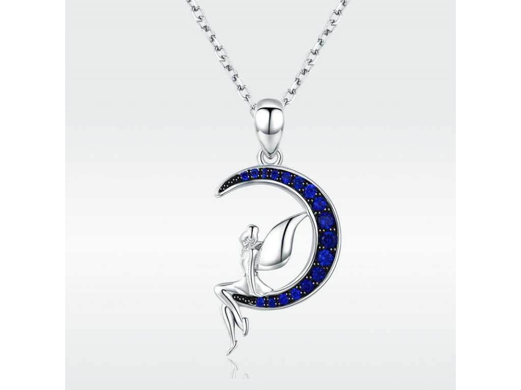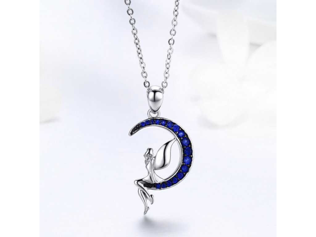 Strieborný náhrdelník s príveskom mesiaca so siluetou víly. Mesiac je ručne posádzaný žiarivými modrými zirkónmi. Originálny dizajn náhrdelníka, kvalitné spracovanie a materiál, ručne dohotovené.