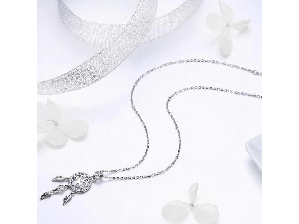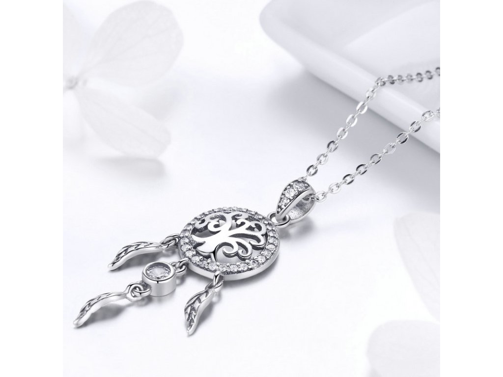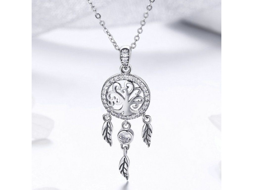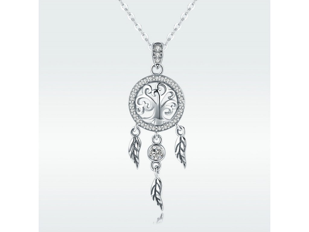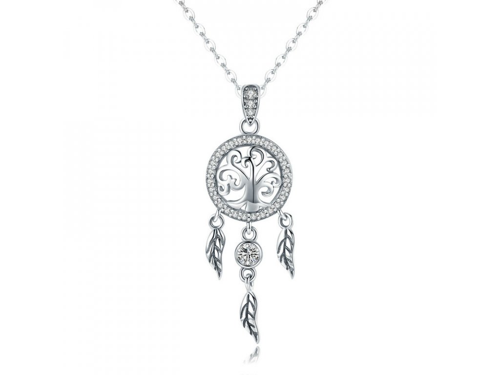 Krásny strieborný náhrdelník s príveskom lapača snov zdobeného čírym zirkónom. Originálny dizajn náhrdelníka, kvalitné spracovanie a materiál, ručne dohotovené. Obdarujte seba alebo svojich blízkych týmto strieborným kúzlom. Zlaďte náhrdelníky s ostatnými šperkami značky Royal Fashion a vytvorte tak neodolateľný set.