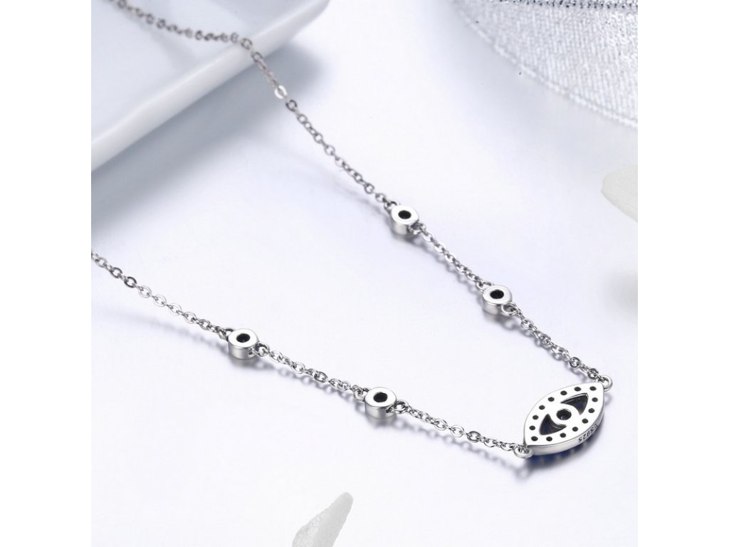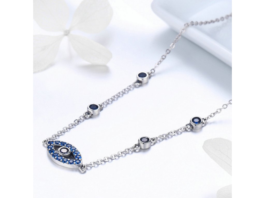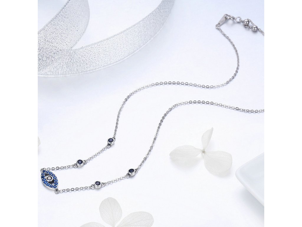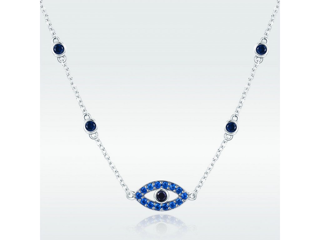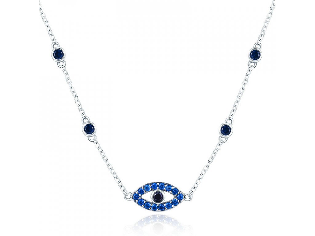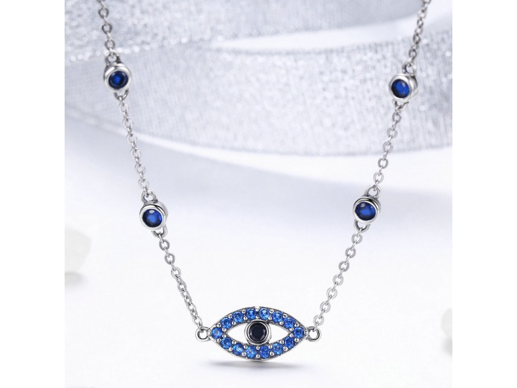 Krásny strieborný náhrdelník so symbolom ochrany v podobe oka zdobeného žiarivými modrými zirkónmi. Originálny dizajn náhrdelníka, kvalitné spracovanie a materiál, ručne dohotovené.