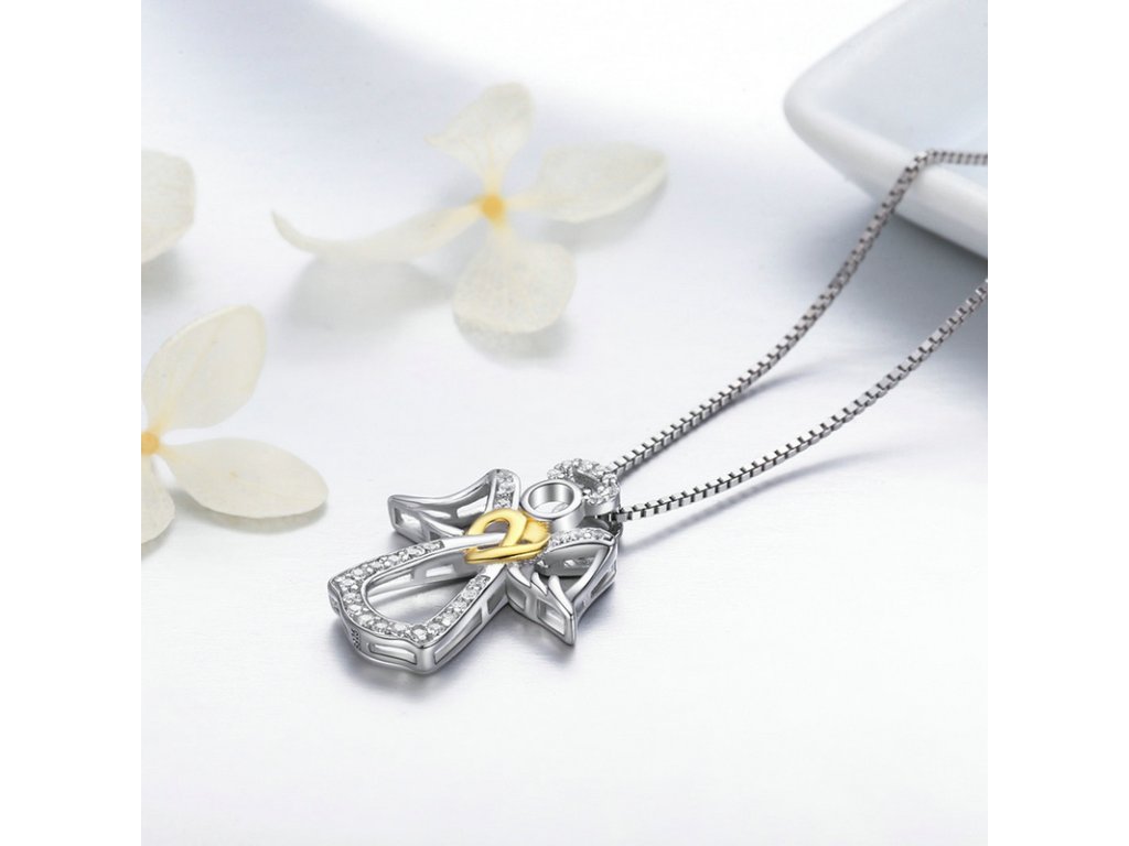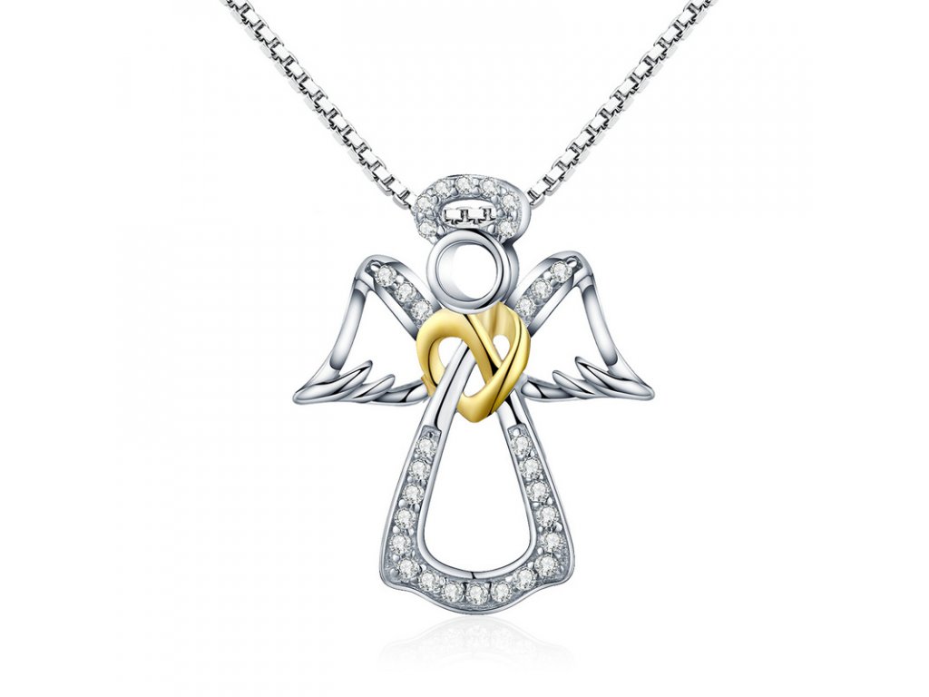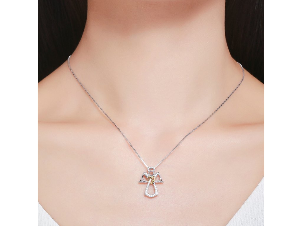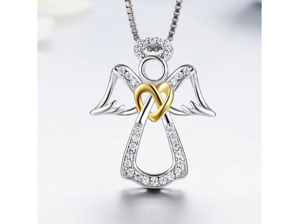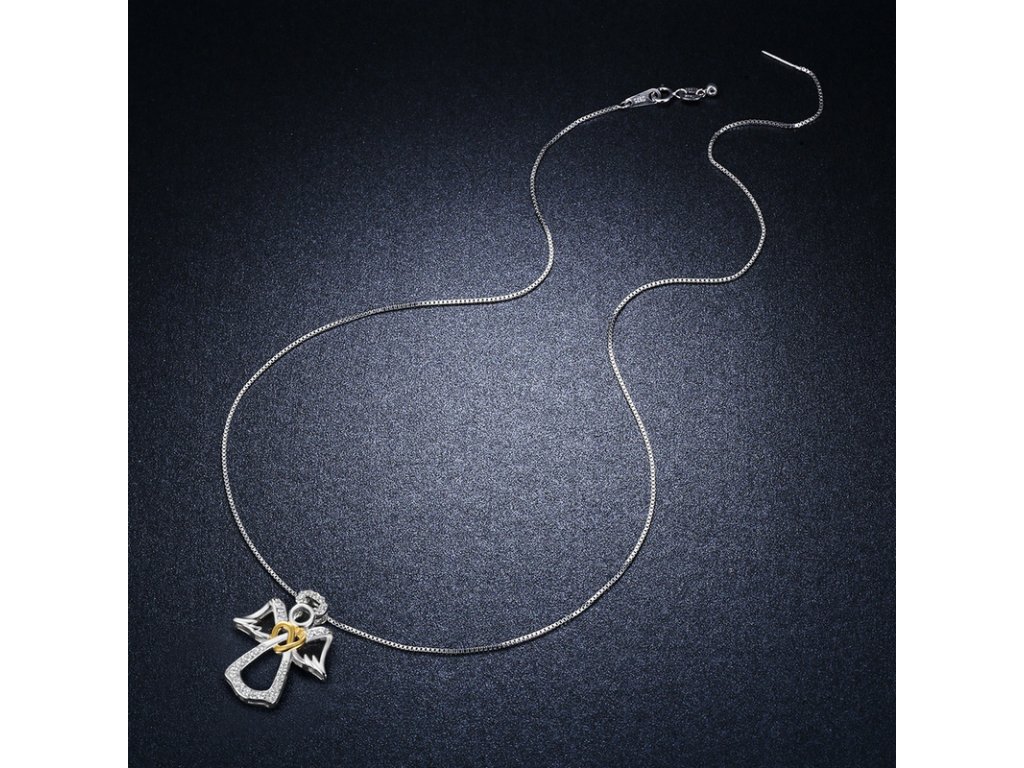 - Strieborný náhrdelník v dizajne Anjela strážneho zdobeného trblietavými kameňmi v podobe čírych zirkónov. Originálny dizajn náhrdelníka, kvalitné spracovanie a materiál, ručne dohotovené.