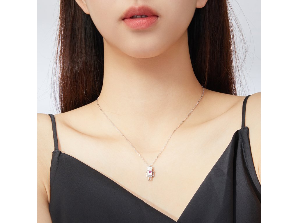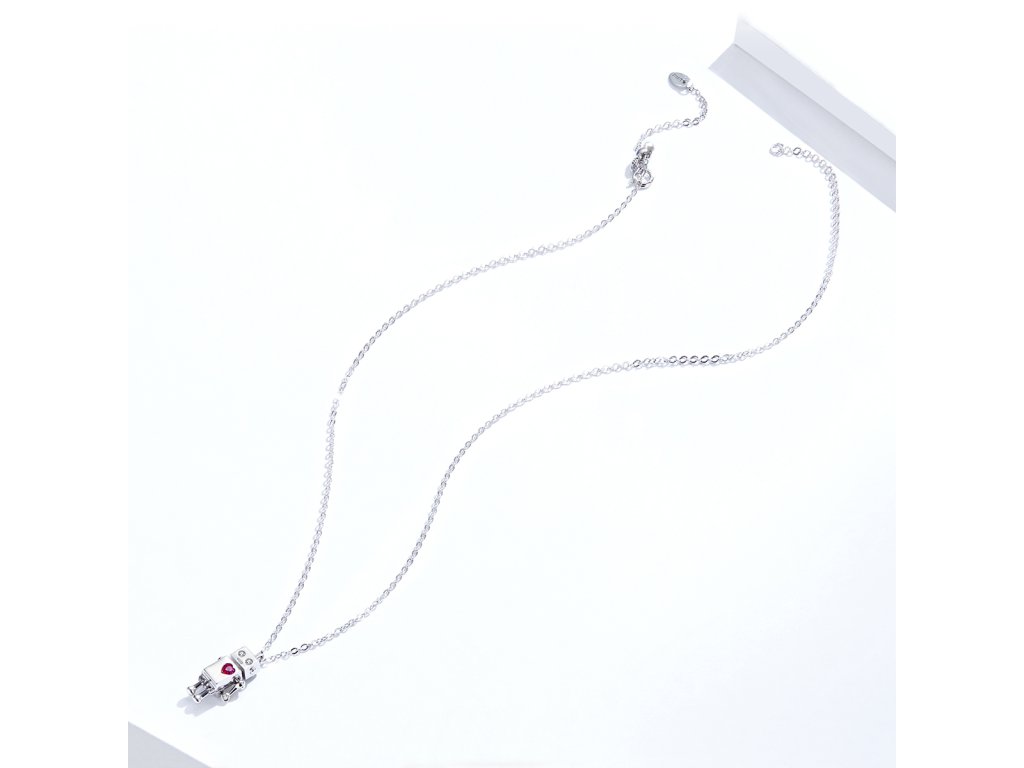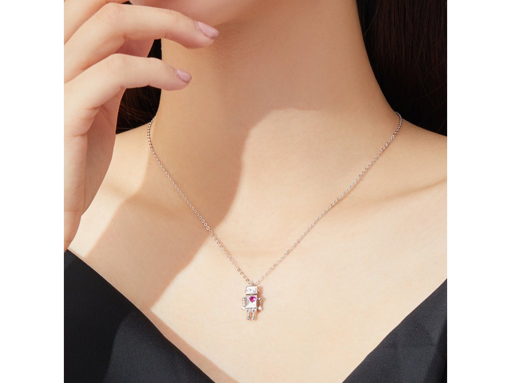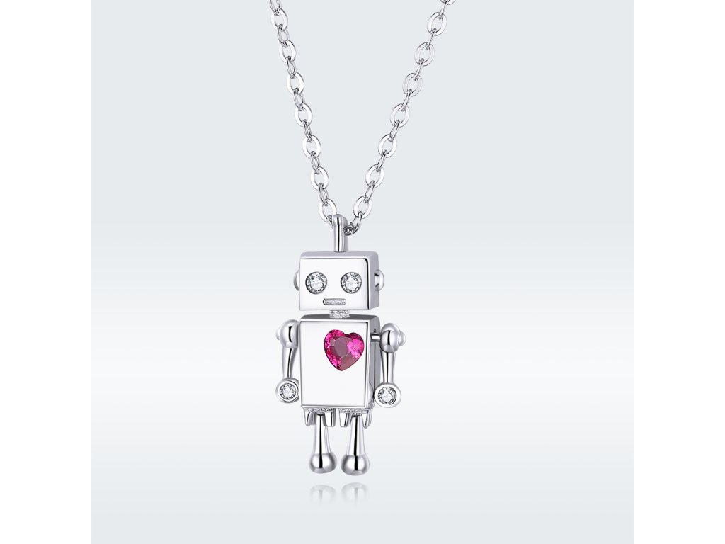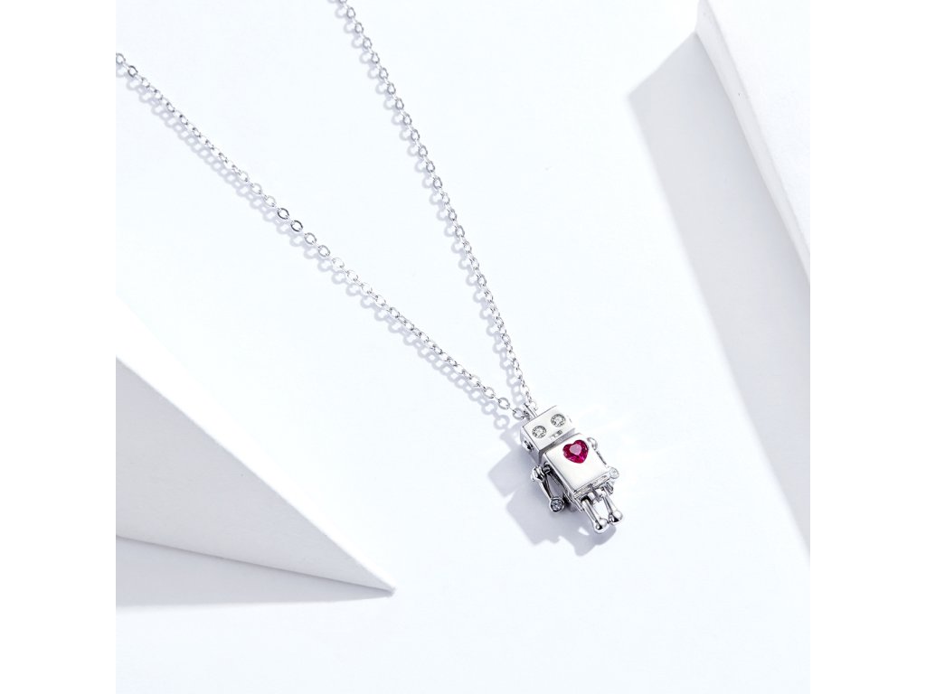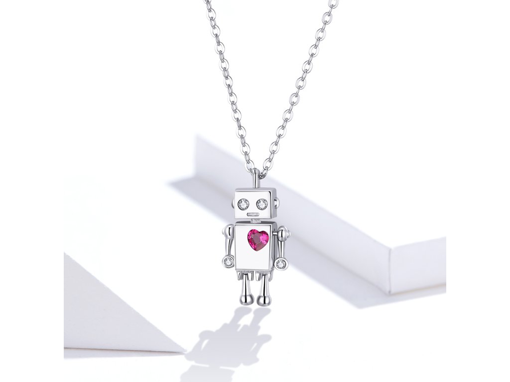 - Strieborný náhrdelník v dizajne Zamilovaného robota zdobeného čerešňovo červeným zirkónom v tvare srdca. Originálny dizajn náhrdelníka, kvalitné spracovanie a materiál, ručne dohotovené.
