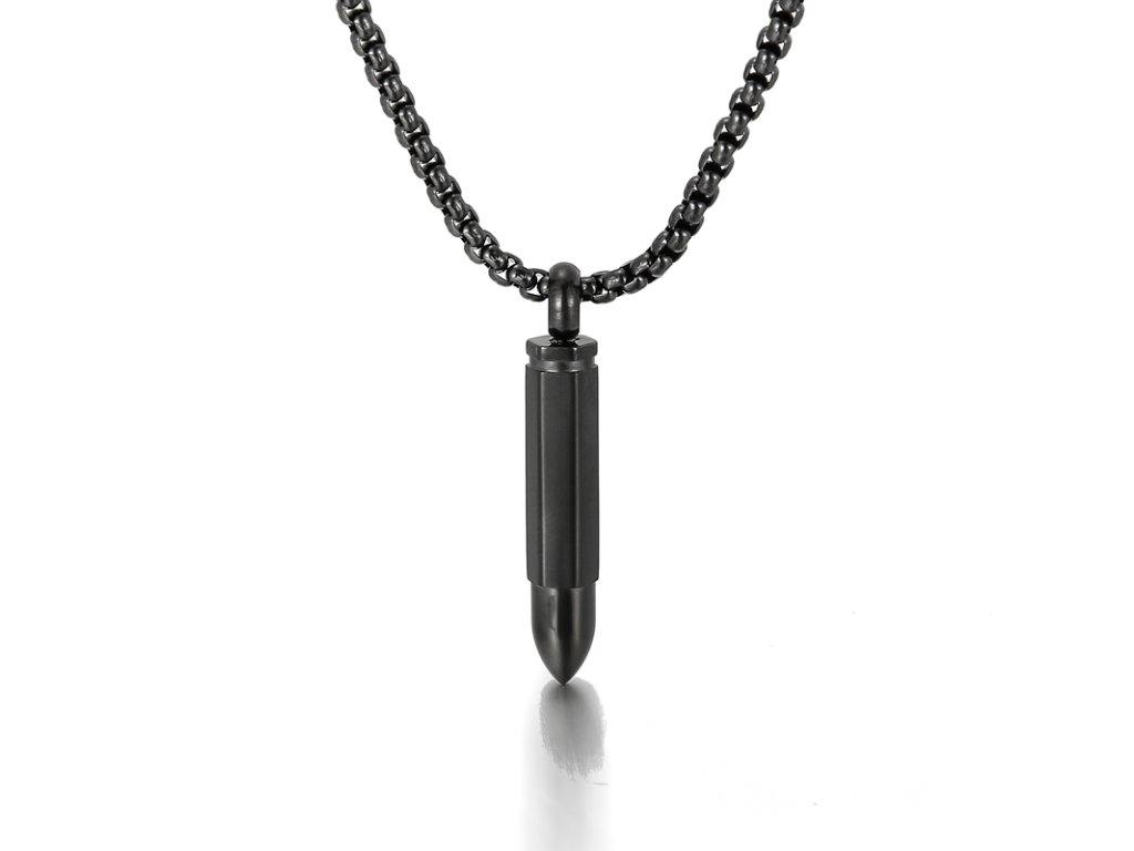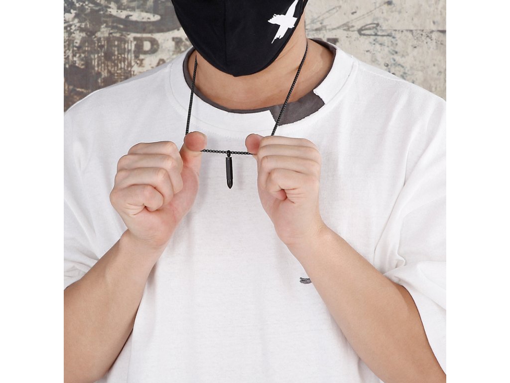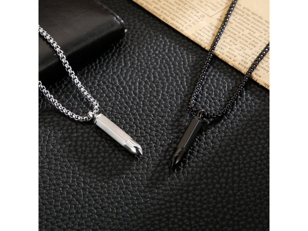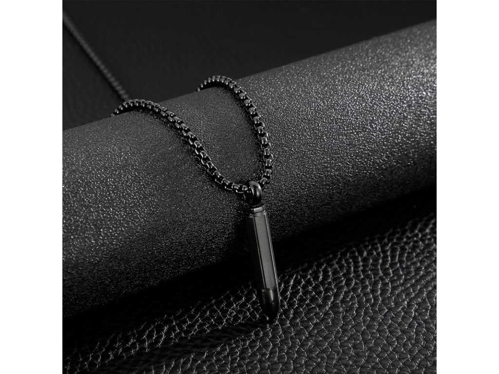 - Pánsky čierny náhrdelník s retiazkou z chirurgickej ocele v dizajne náboja. Originálny design náhrdelníka, kvalitné spracovanie a materiál.