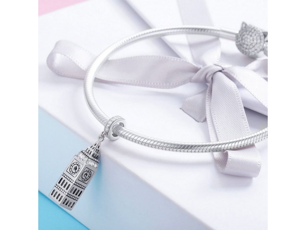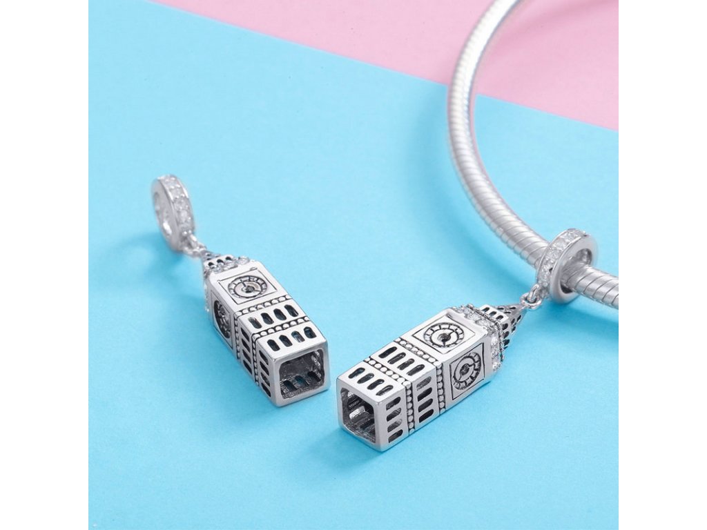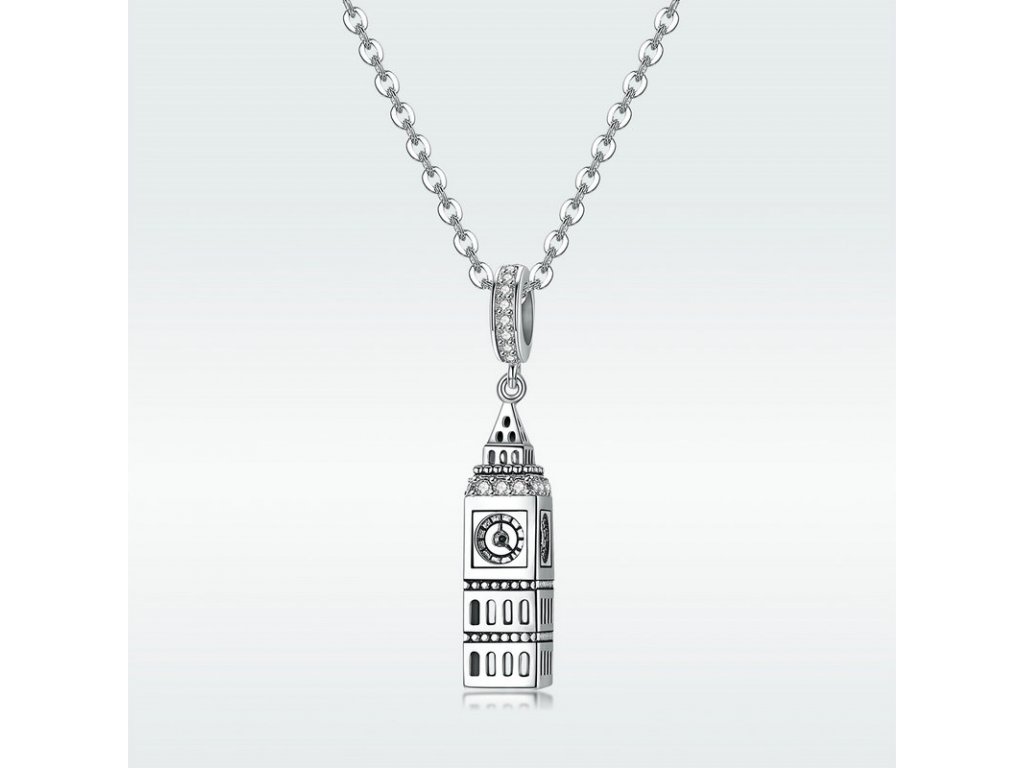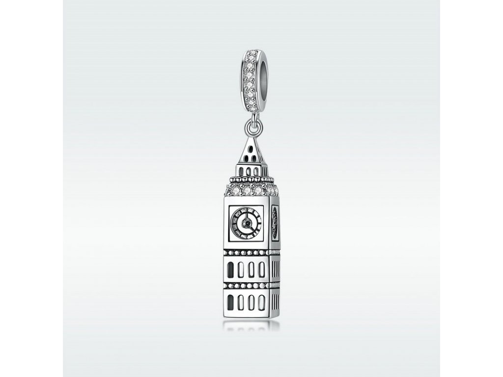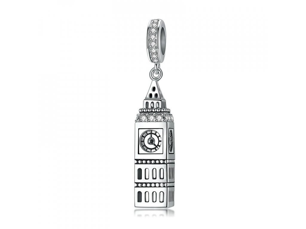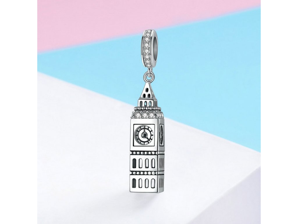 Luxusný a prepracovaný visiaci strieborný prívesok v dizajne Big Ben zdobený zirkónmi.