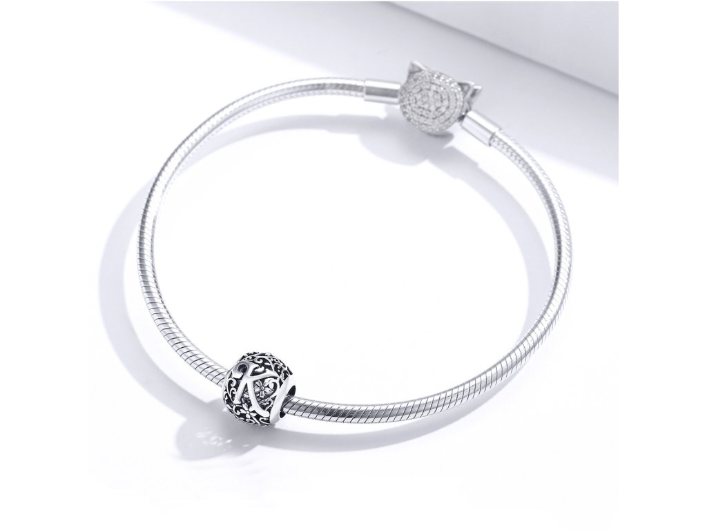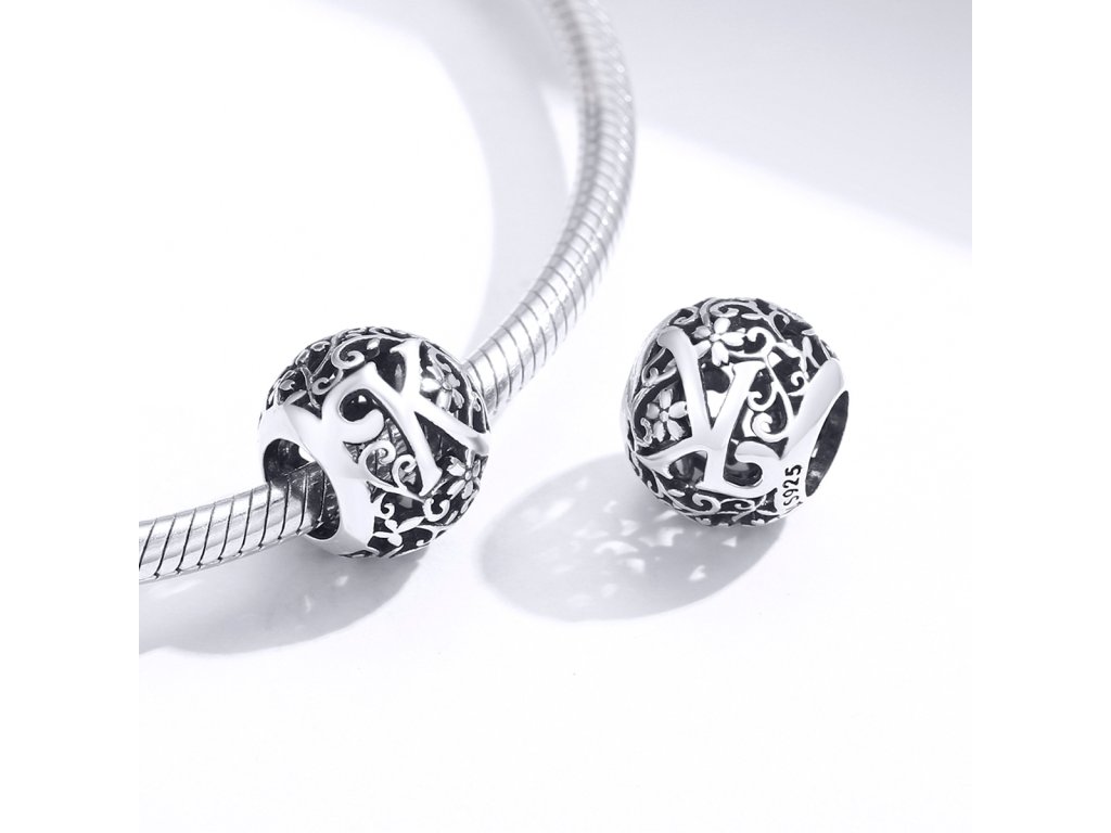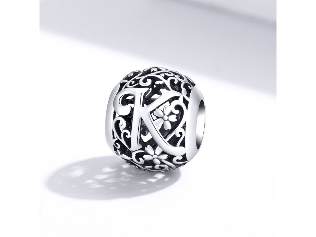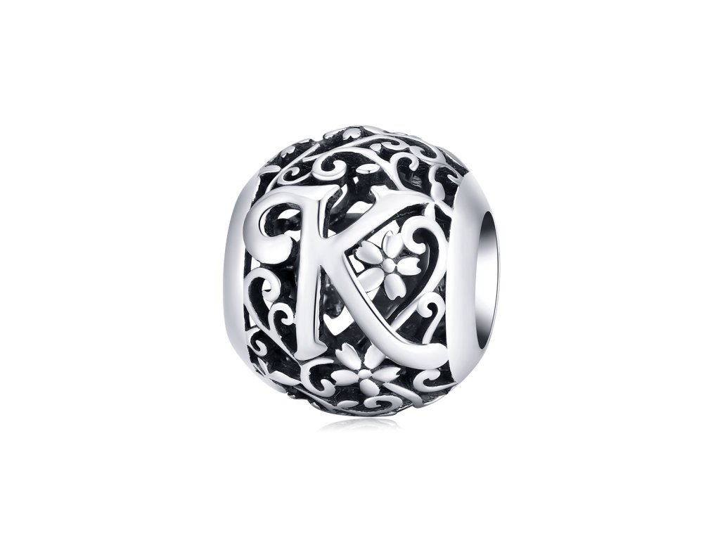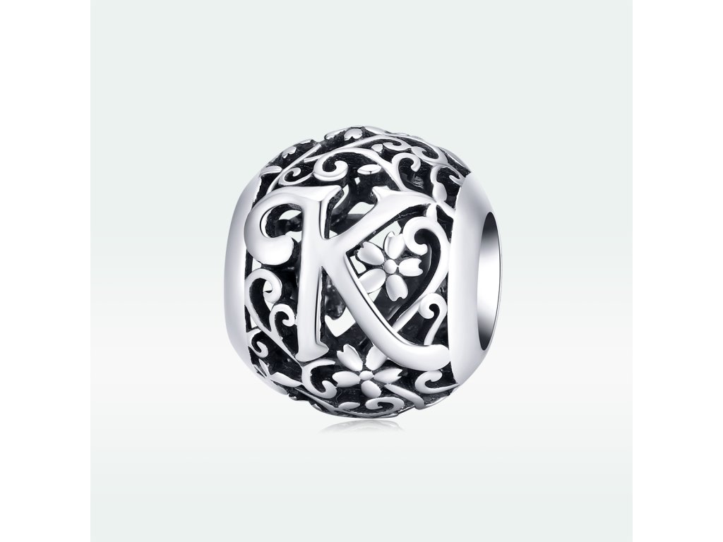 - Strieborný filigránový prívesok / korálek v dizajne písmenka K zdobený rozkvitnutými kvetmi a lístkami.