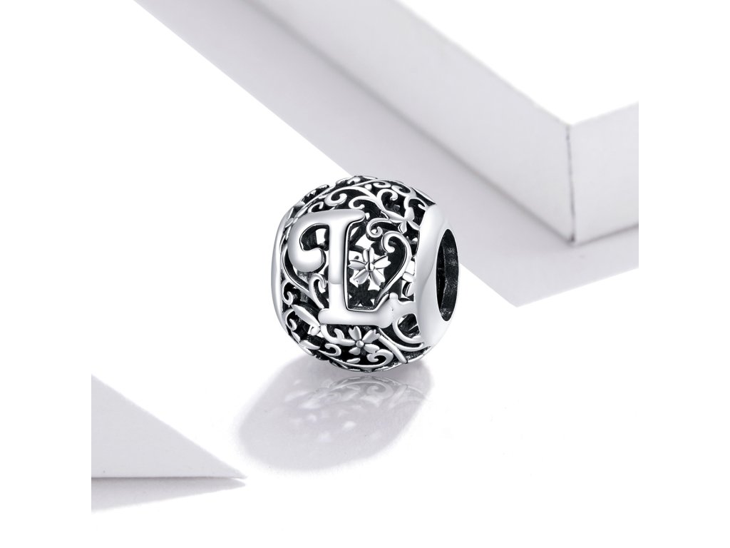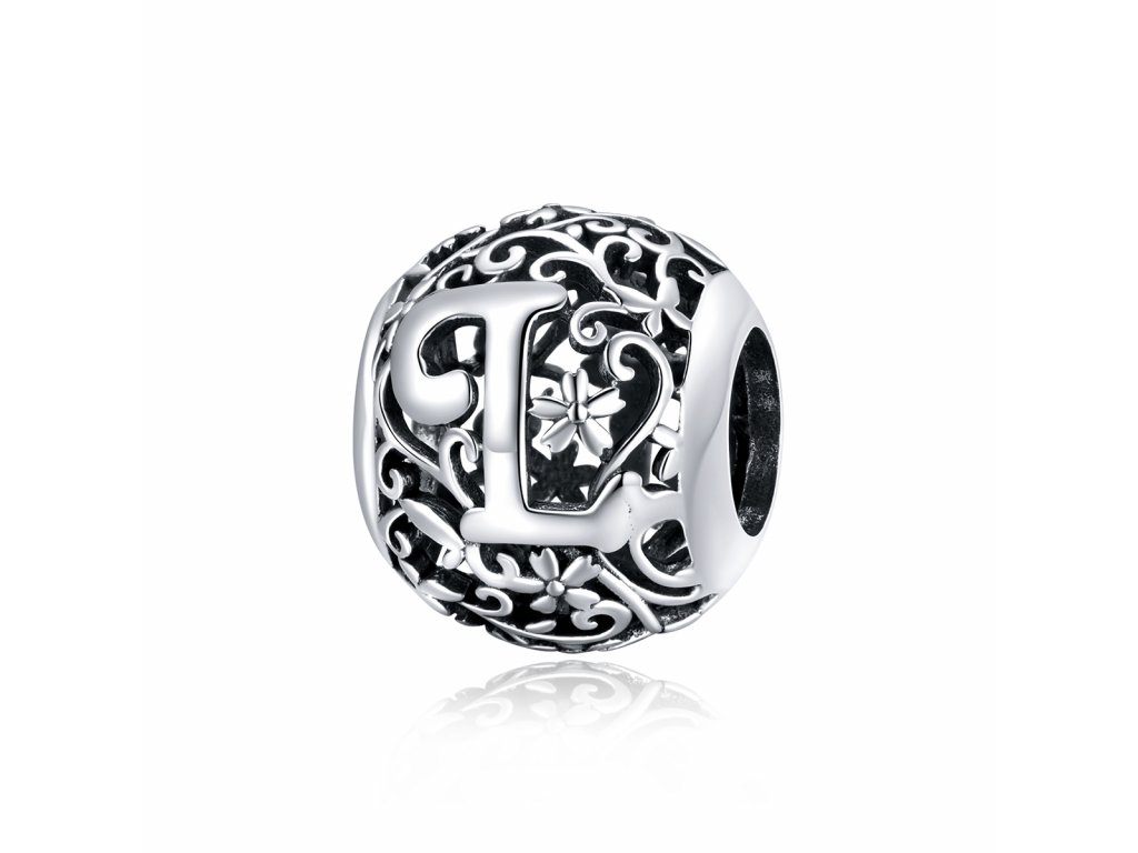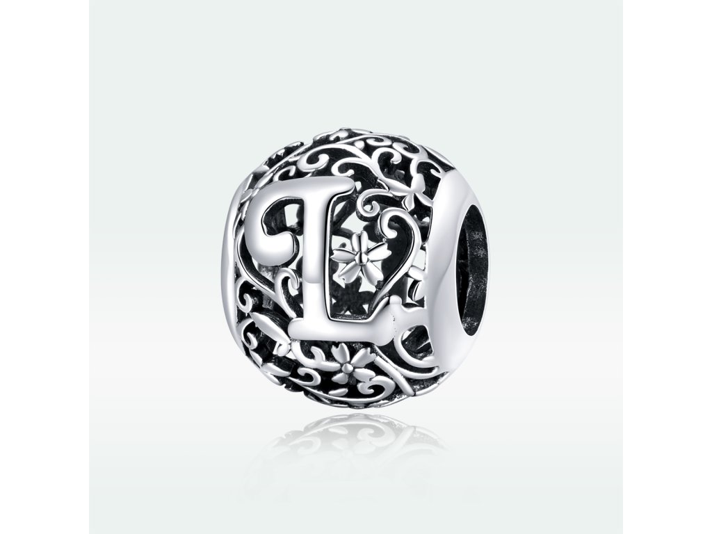 - Strieborný filigránový prívesok / korálik v dizajne písmenka L zdobený rozkvitnutými kvetmi a lístkami.